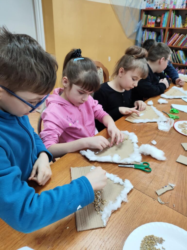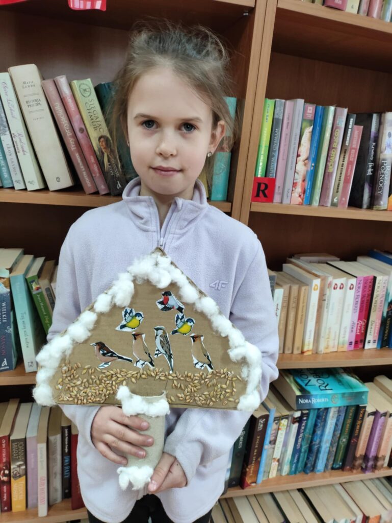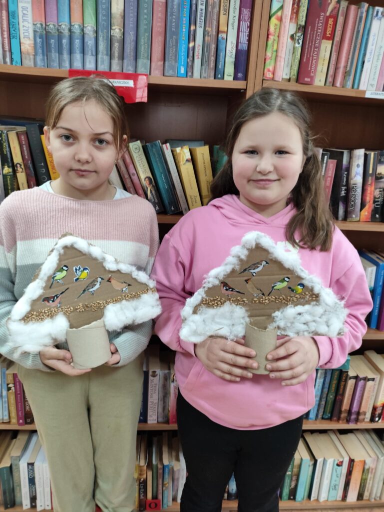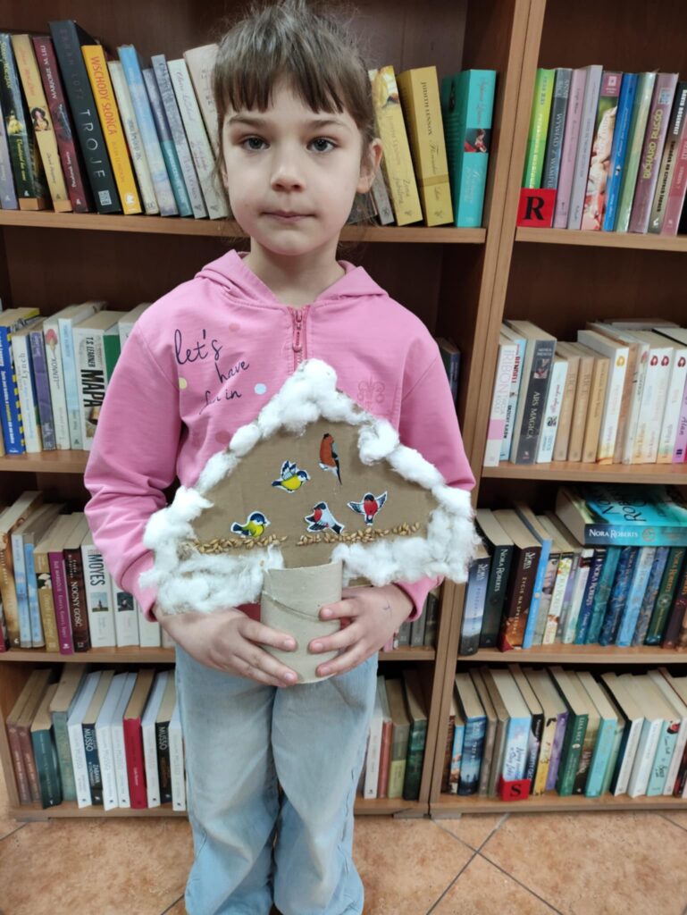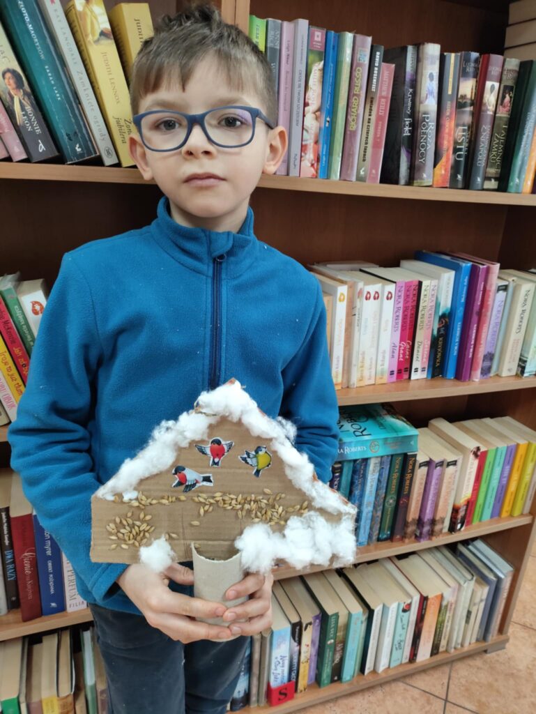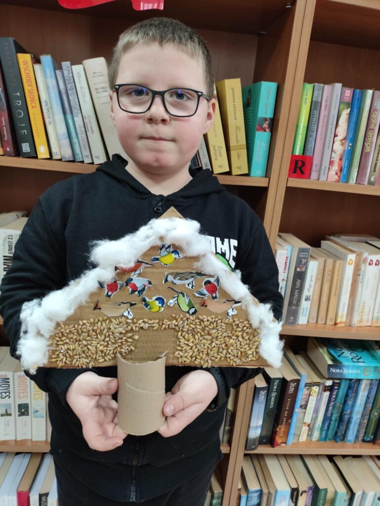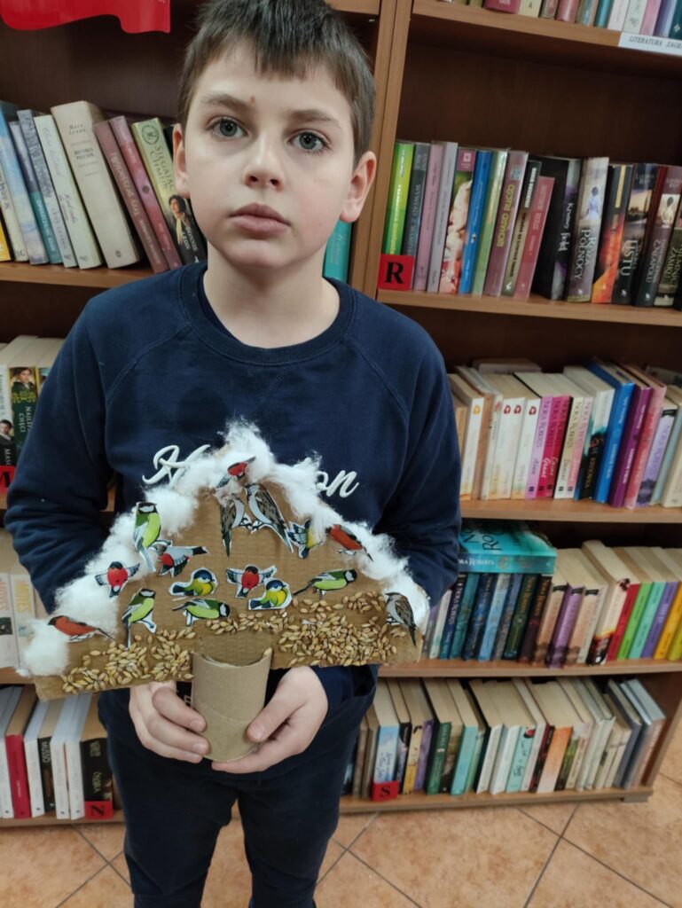 Kolejny dzień ferii w bibliotece upłynął pod znakiem ekologii i troski o naszych skrzydlatych przyjaciół. Tym razem dzieci wzięły udział w kreatywnych warsztatach, podczas których z przedmiotów codziennego użytku – rolek po papierze toaletowym i tektury – stworzyły pomysłowe, w pełni biodegradowalne karmniki.