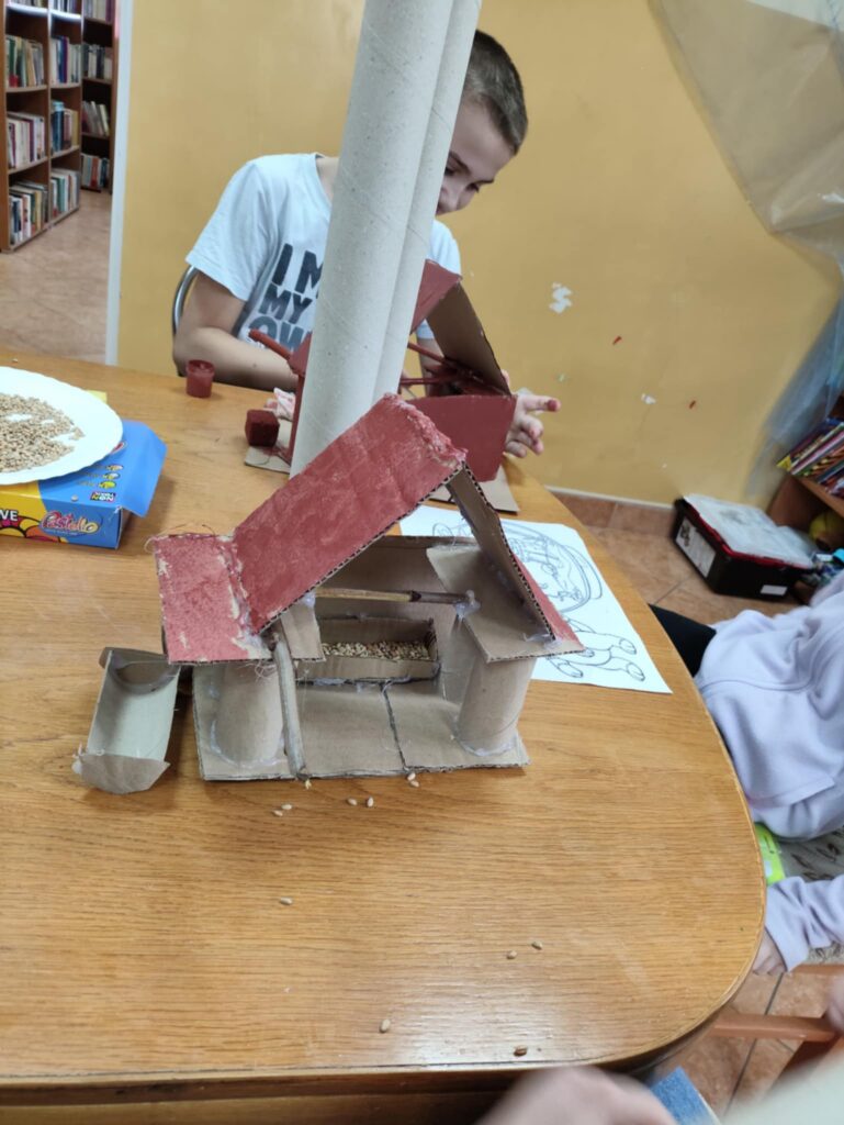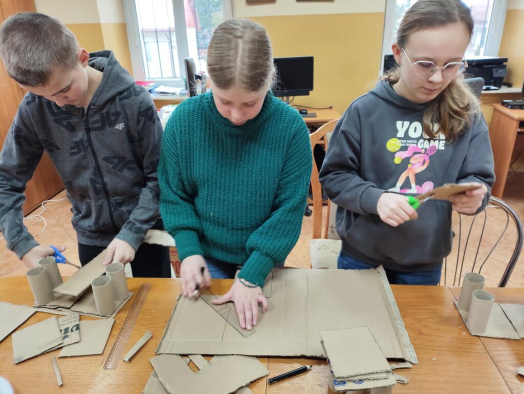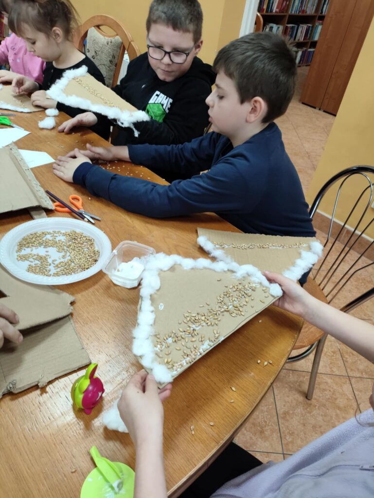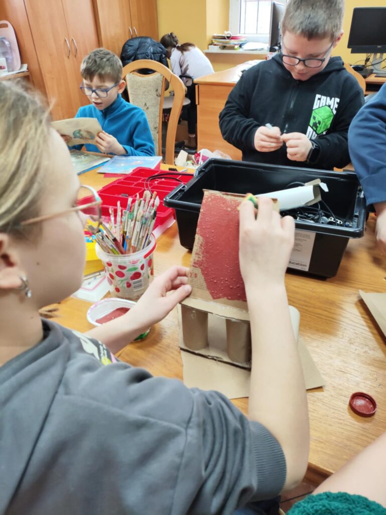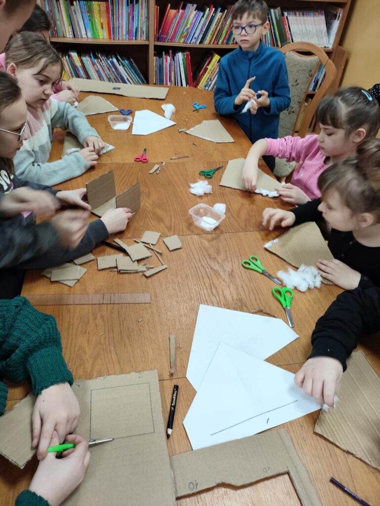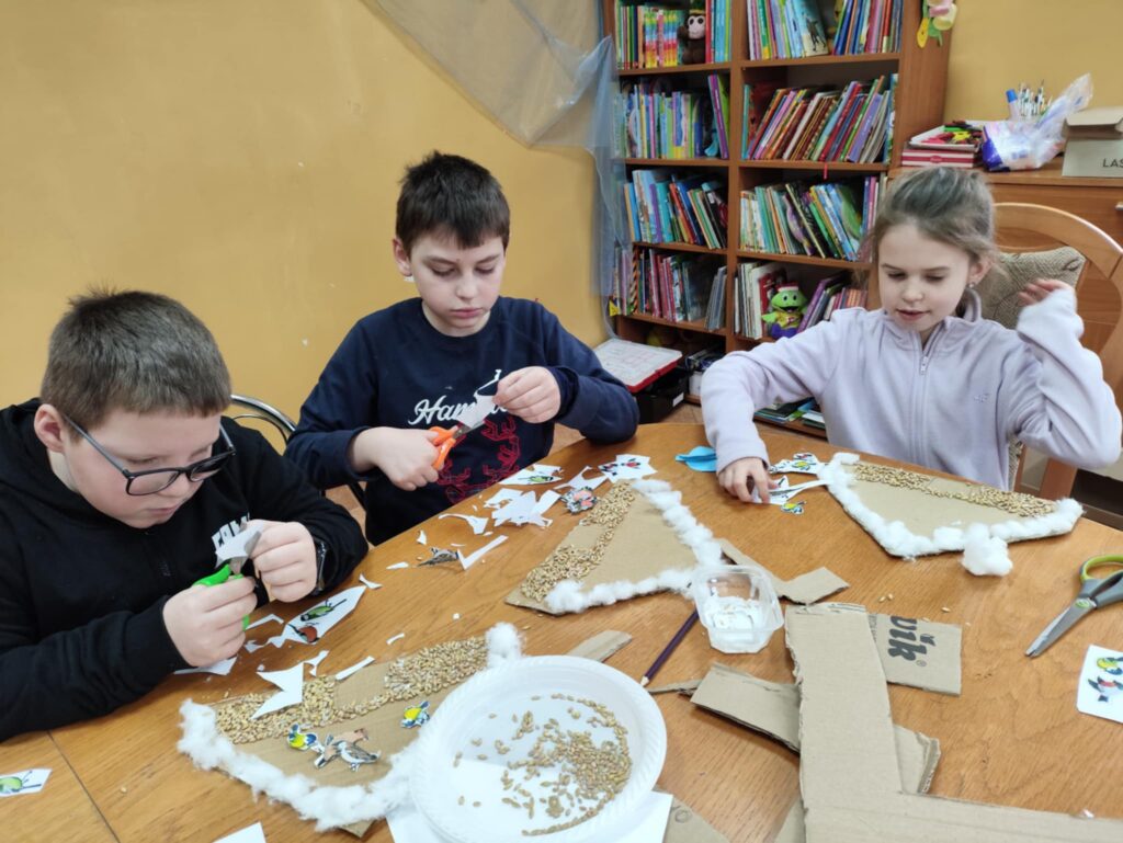 Kolejny dzień ferii w bibliotece upłynął pod znakiem ekologii i troski o naszych skrzydlatych przyjaciół. Tym razem dzieci wzięły udział w kreatywnych warsztatach, podczas których z przedmiotów codziennego użytku – rolek po papierze toaletowym i tektury – stworzyły pomysłowe, w pełni biodegradowalne karmniki.