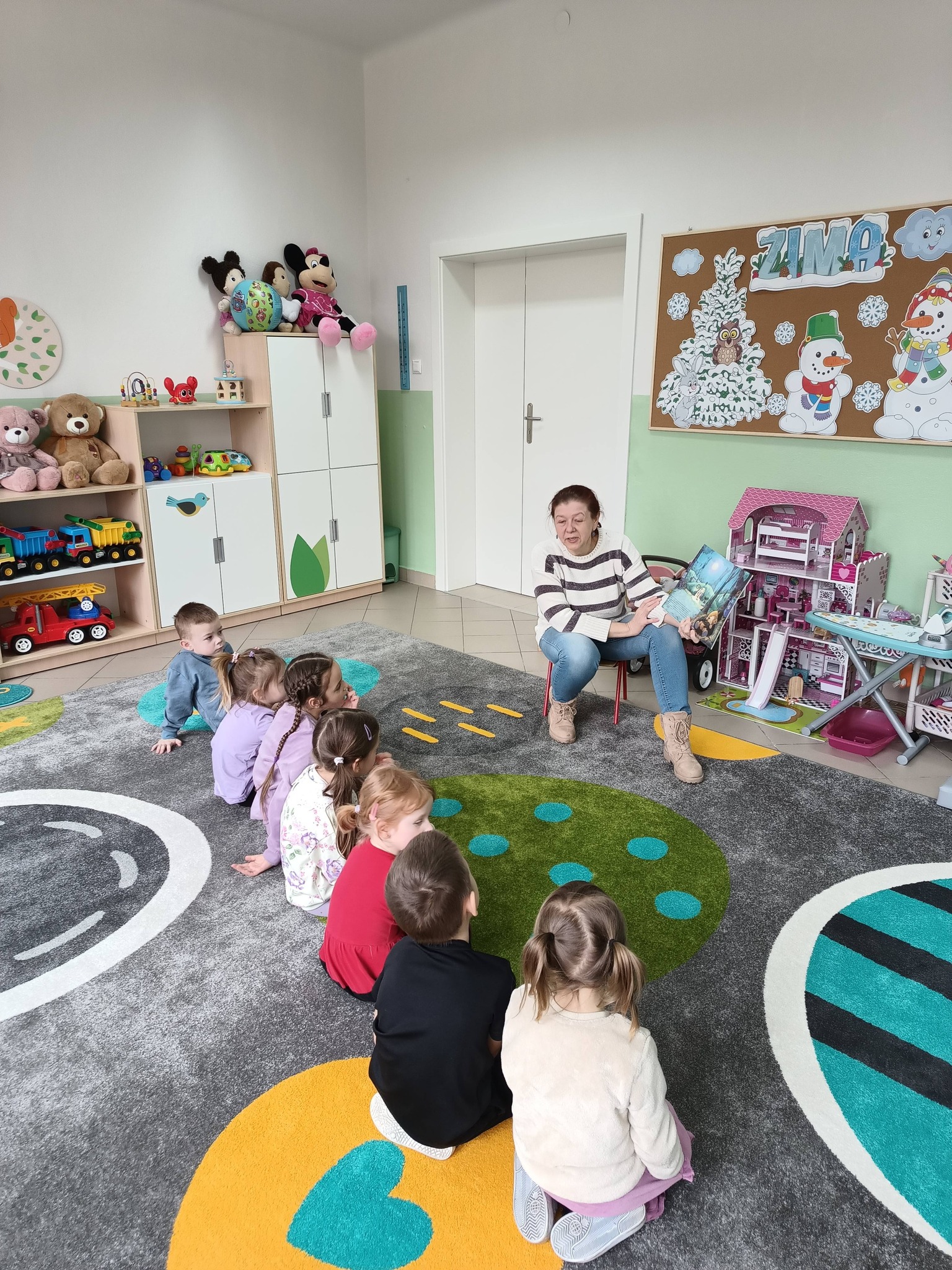 Podczas zajęć z przedszkolakami prowadzonych przez bibliotekarkę w ramach spotkania „Głośne Czytanie w Przedszkolu” dzieci wzięły udział w wspólnej, radosnej przygodzie z