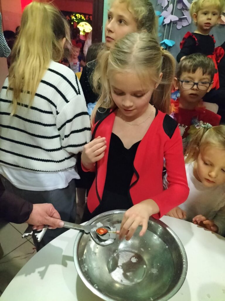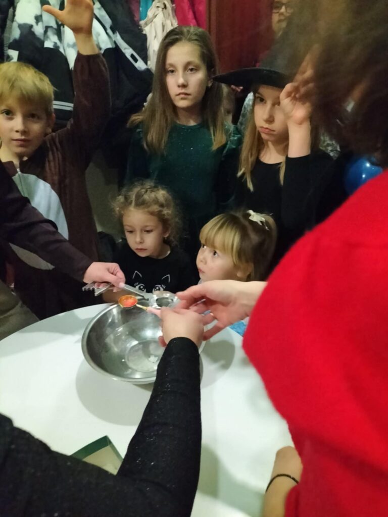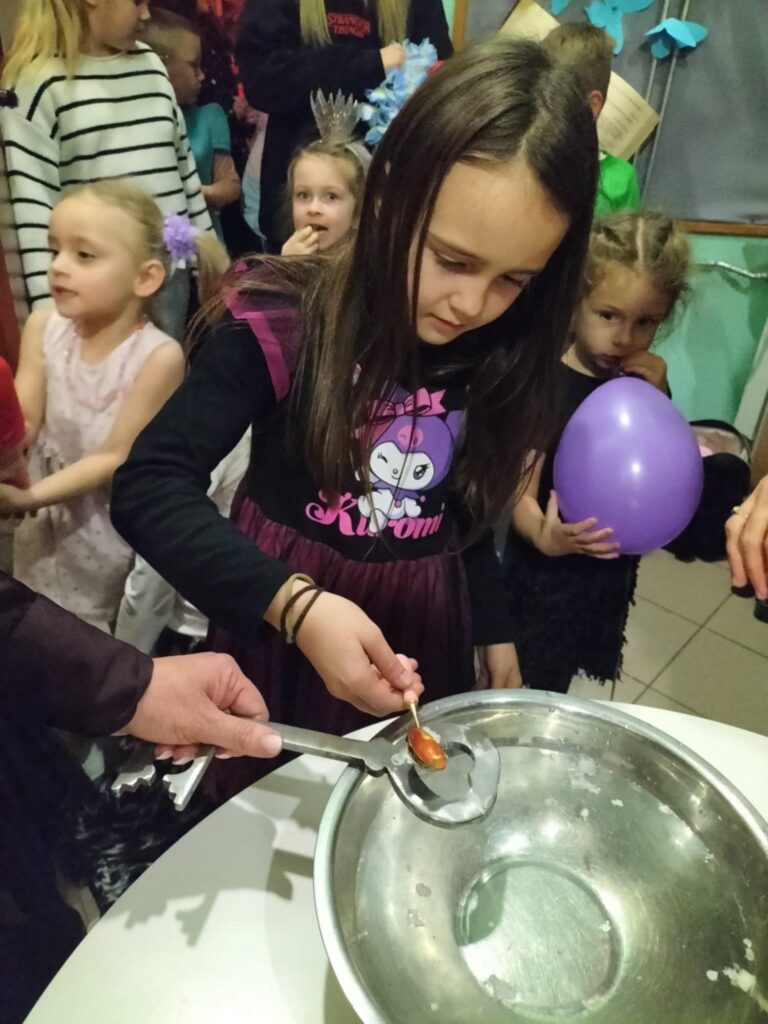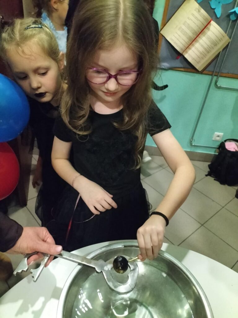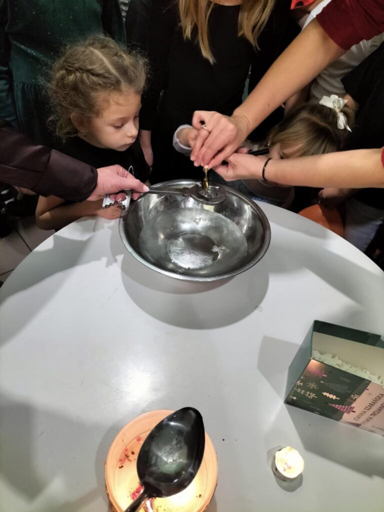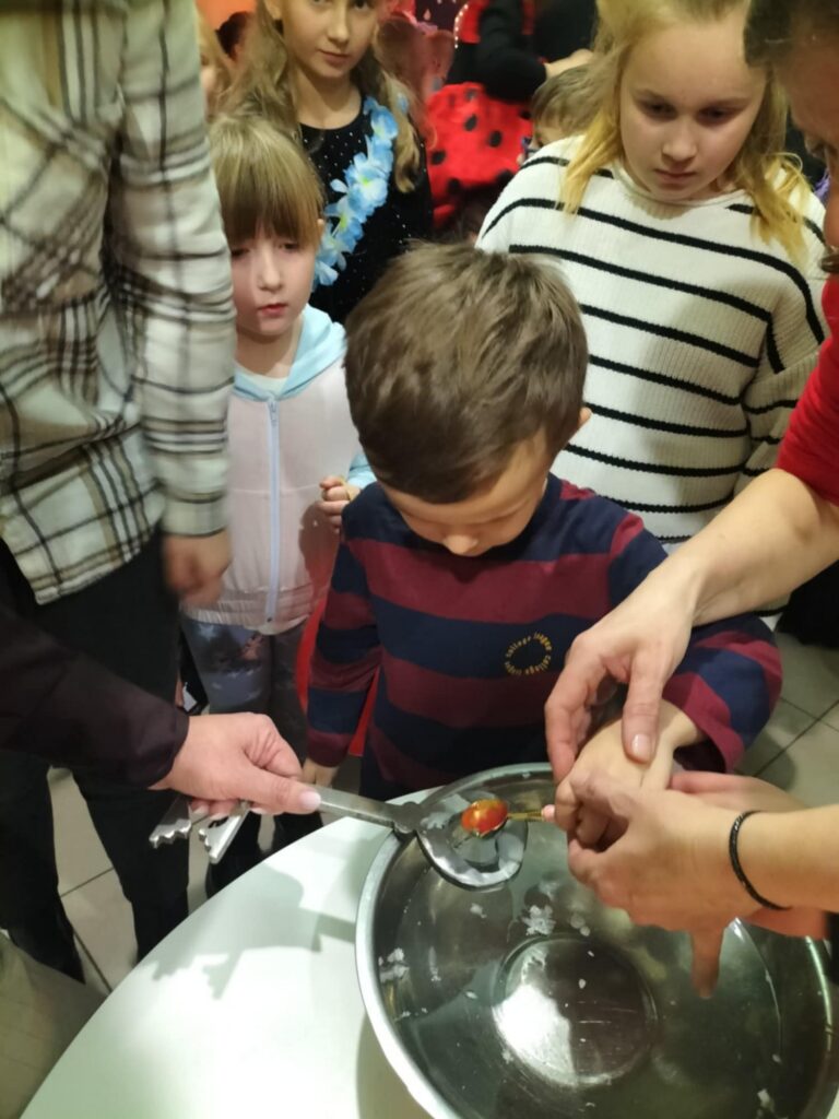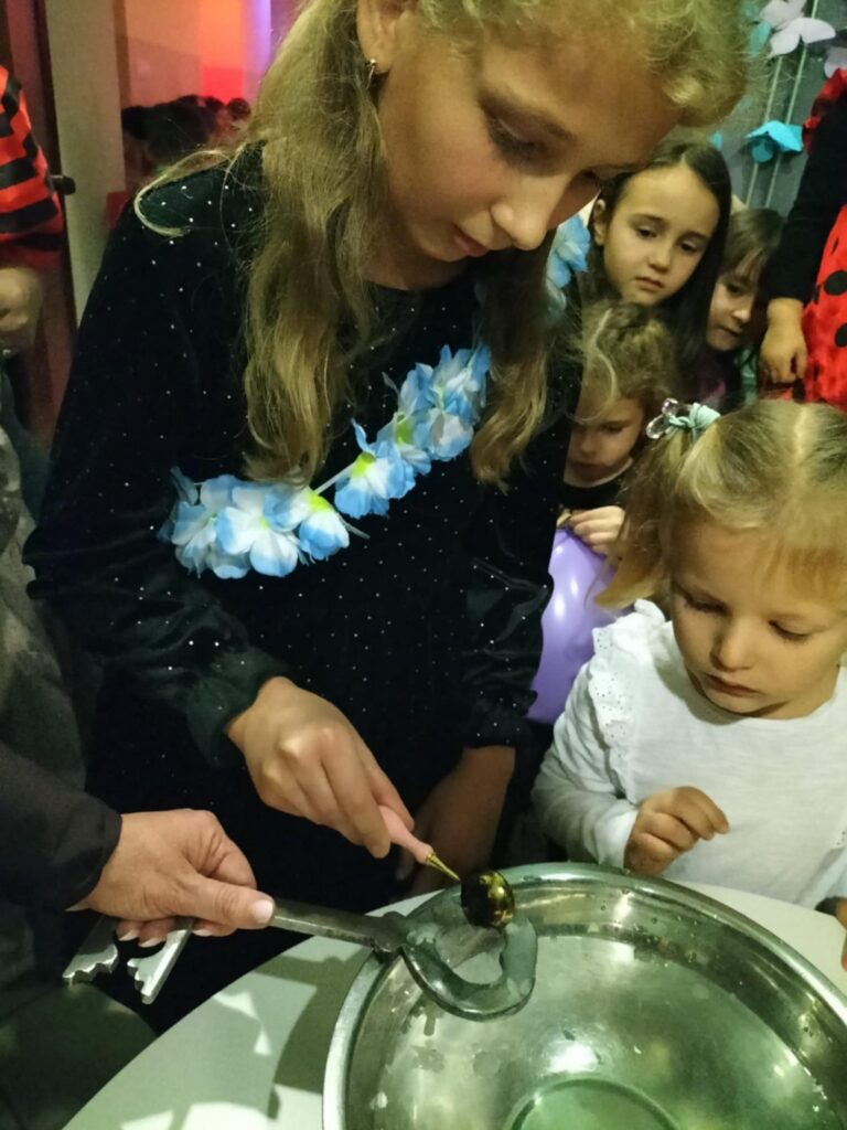 Część andrzejkowych atrakcji poprowadziły również panie z biblioteki. Przygotowały one tradycyjne wróżby — lanie wosku, wróżba z butami . Dzieci z zaciekawieniem odkrywały, co może przynieść im przyszłość, a każda wróżba wywoływała mnóstwo emocji. Uczestnicy mieli okazję nie tylko świetnie się bawić, ale także spędzić czas razem w bezpiecznej, przyjaznej atmosferze biblioteki.