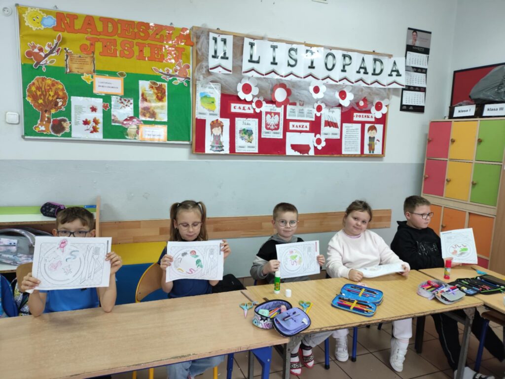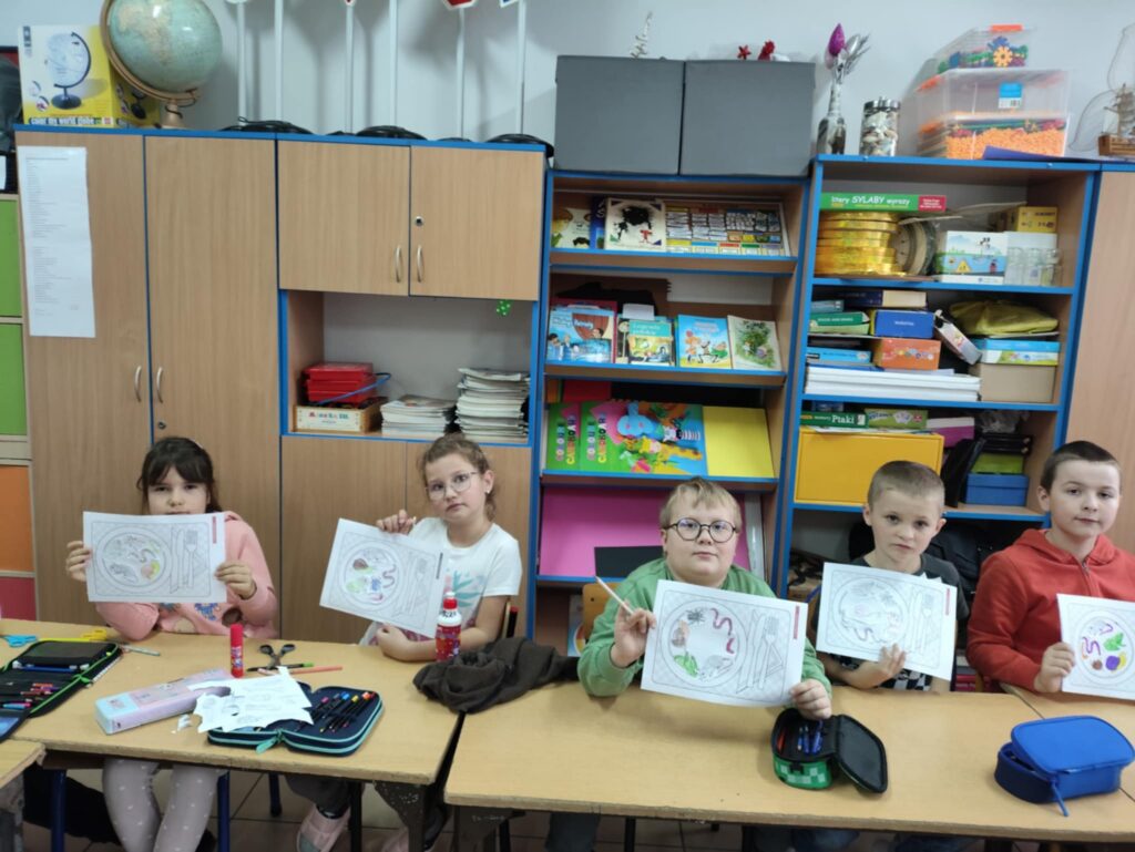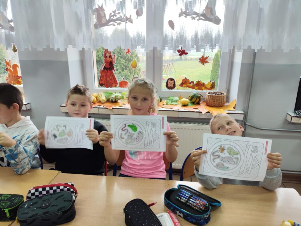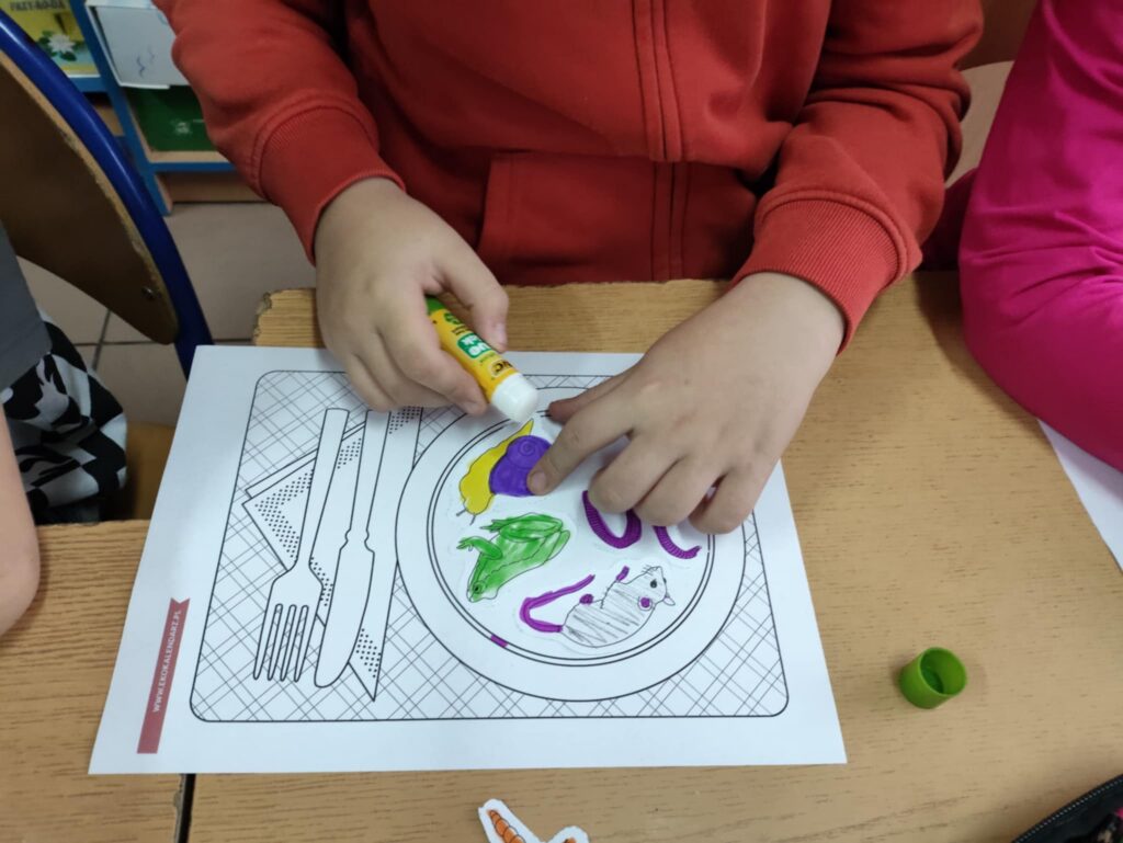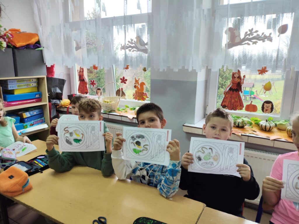 Dnia 10 października obchodziliśmy Dzień Jeża, z tej okazji w ZPO w Górach odbyło się spotkanie bibliotekarza z uczniami klas 1-3, które miało na celu przybliżenie im tematyki Dnia Jeża. W trakcie zajęć dzieci dowiedziały się ciekawych informacji o jeżach – ich zwyczajach, zwykłej diecie i tym, jak ważne są dla przyrody. W tym dniu dzieci wykonały dwie prace. Pierwsza praca dotyczyła tworzenia posiłku dla jeża. Poprzez wybieranie, wycinanie, kolorowanie i naklejanie obrazków na talerz, dzieci uczyły się, co jeże jedzą w swoim naturalnym środowisku. Tworząc „posiłek”, dzieci miały okazję wizualnie zapamiętać, jakie składniki powinny znaleźć się na talerzu jeża, a jakich należy unikać.