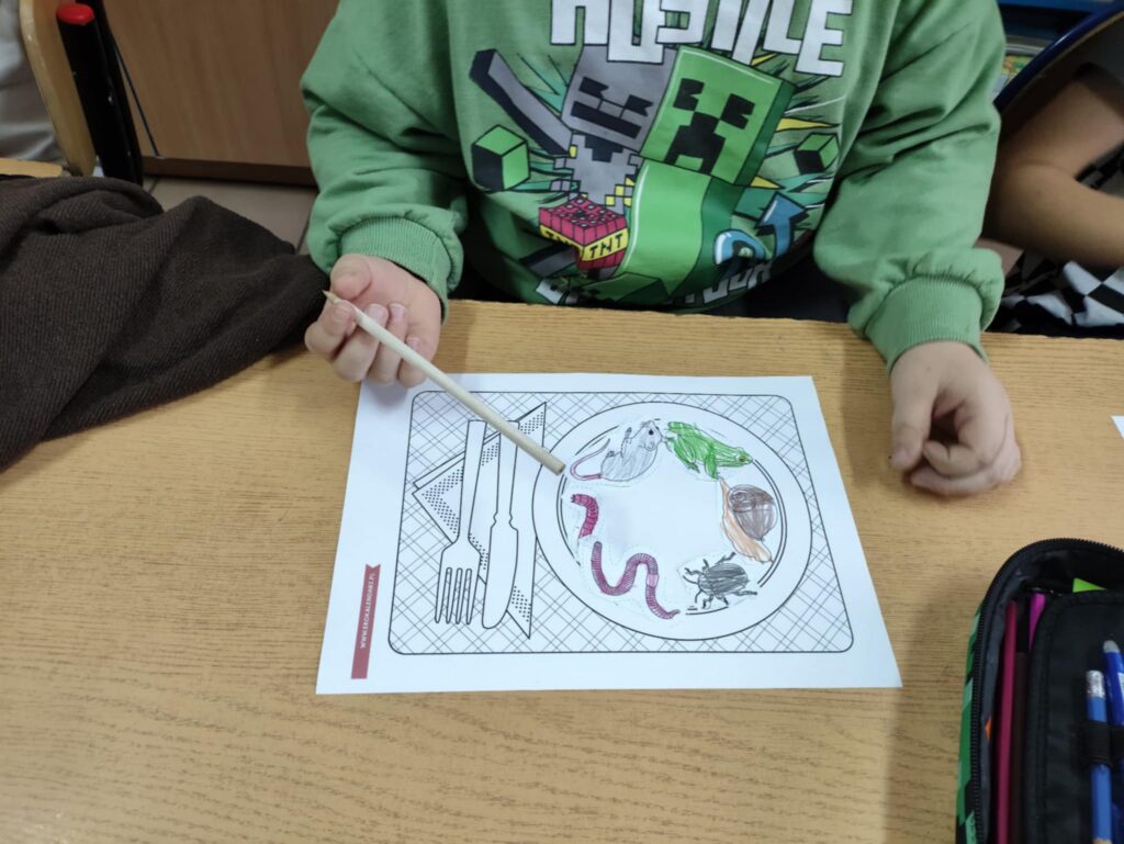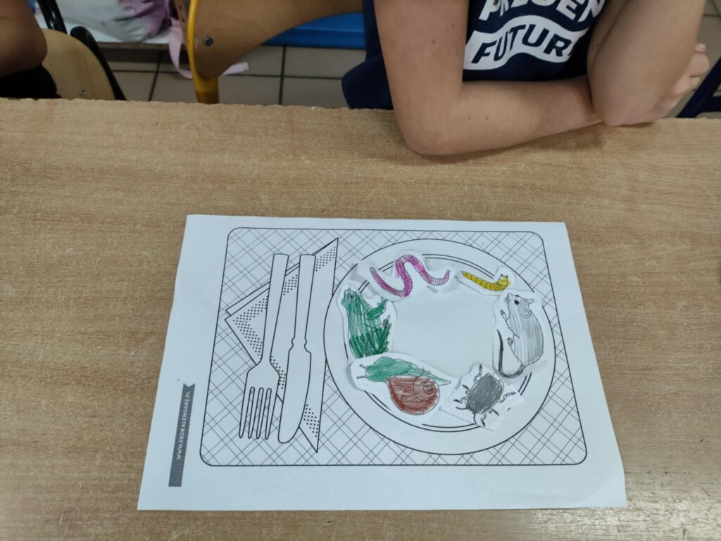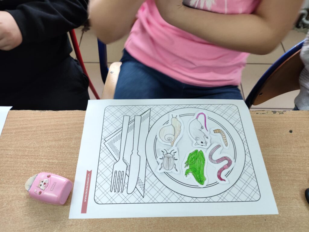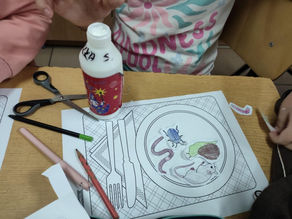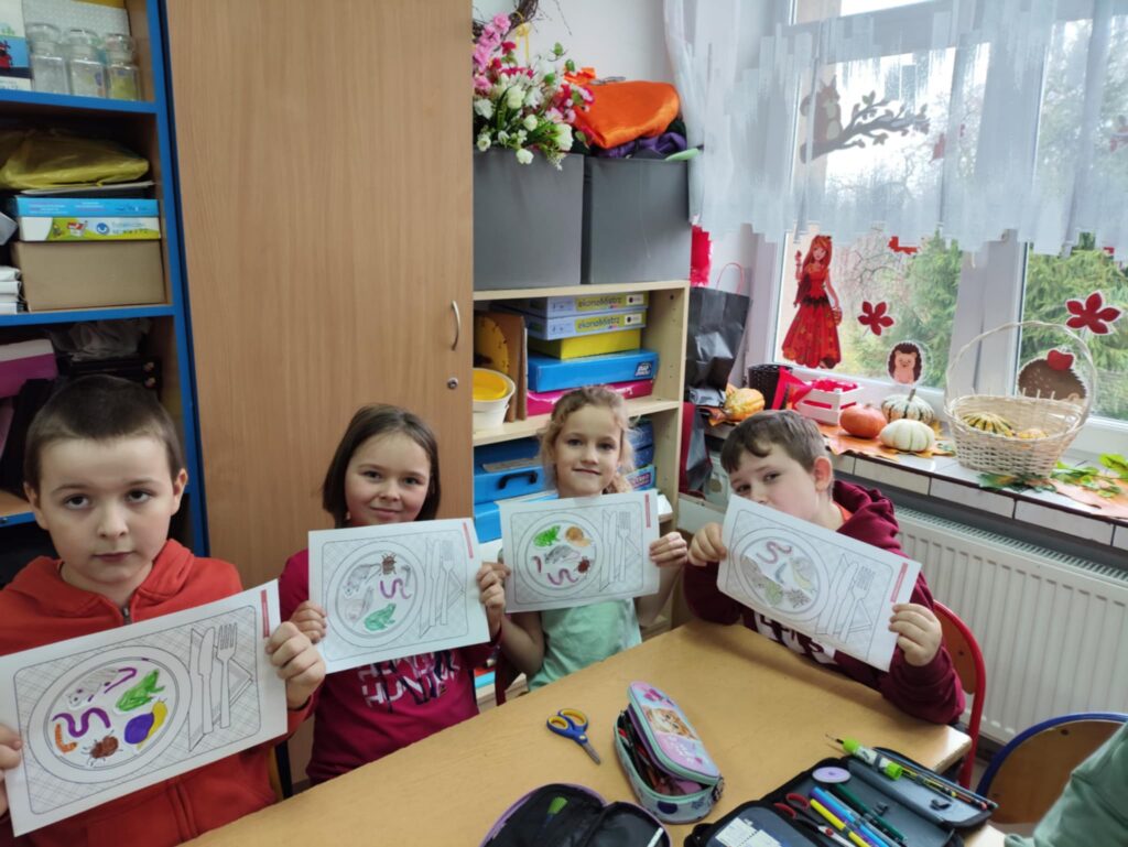 Dnia 10 października obchodziliśmy Dzień Jeża, z tej okazji w ZPO w Górach odbyło się spotkanie bibliotekarza z uczniami klas 1-3, które miało na celu przybliżenie im tematyki Dnia Jeża. W trakcie zajęć dzieci dowiedziały się ciekawych informacji o jeżach – ich zwyczajach, zwykłej diecie i tym, jak ważne są dla przyrody. W tym dniu dzieci wykonały dwie prace. Pierwsza praca dotyczyła tworzenia posiłku dla jeża. Poprzez wybieranie, wycinanie, kolorowanie i naklejanie obrazków na talerz, dzieci uczyły się, co jeże jedzą w swoim naturalnym środowisku. Tworząc „posiłek”, dzieci miały okazję wizualnie zapamiętać, jakie składniki powinny znaleźć się na talerzu jeża, a jakich należy unikać.