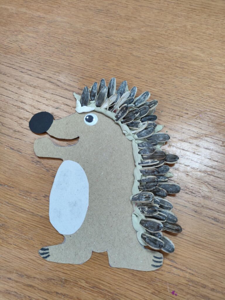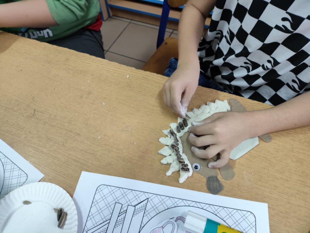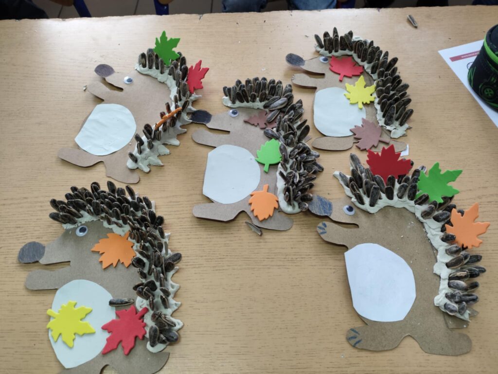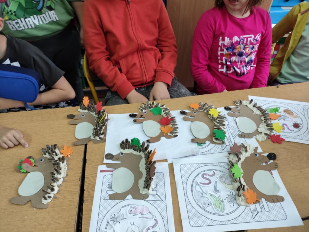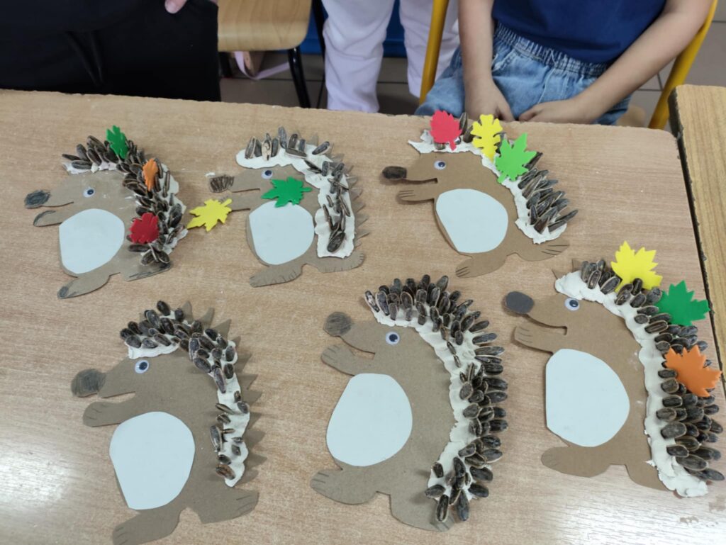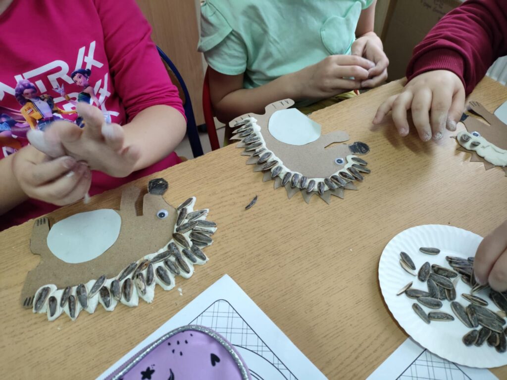 Po części edukacyjnej przyszedł czas na twórczą zabawę z modeliny i pestek słonecznika. Uczniowie wykonywali jeże używając modeliny i pestek słonecznika, które imitowały kolce jeża i dodawały pracy naturalnego charakteru. To wydarzenie nie tylko poszerzyło wiedzę uczniów o jeżach, ale także rozwijało ich zdolności manualne i wyobraźnię, a także uczyło szacunku dla przyrody.