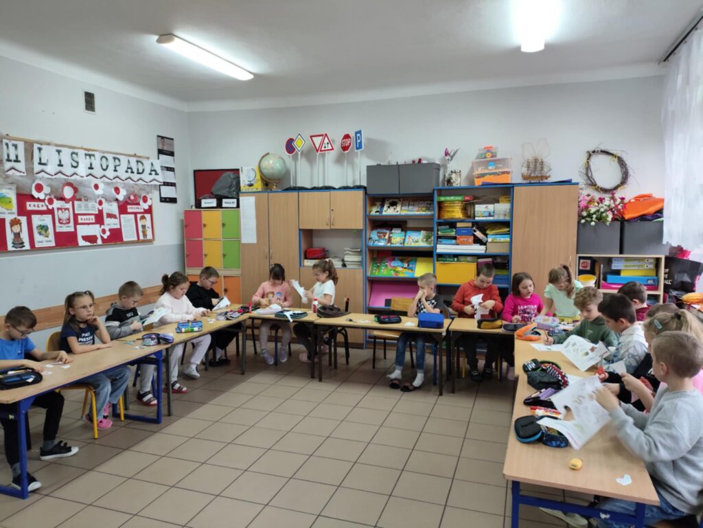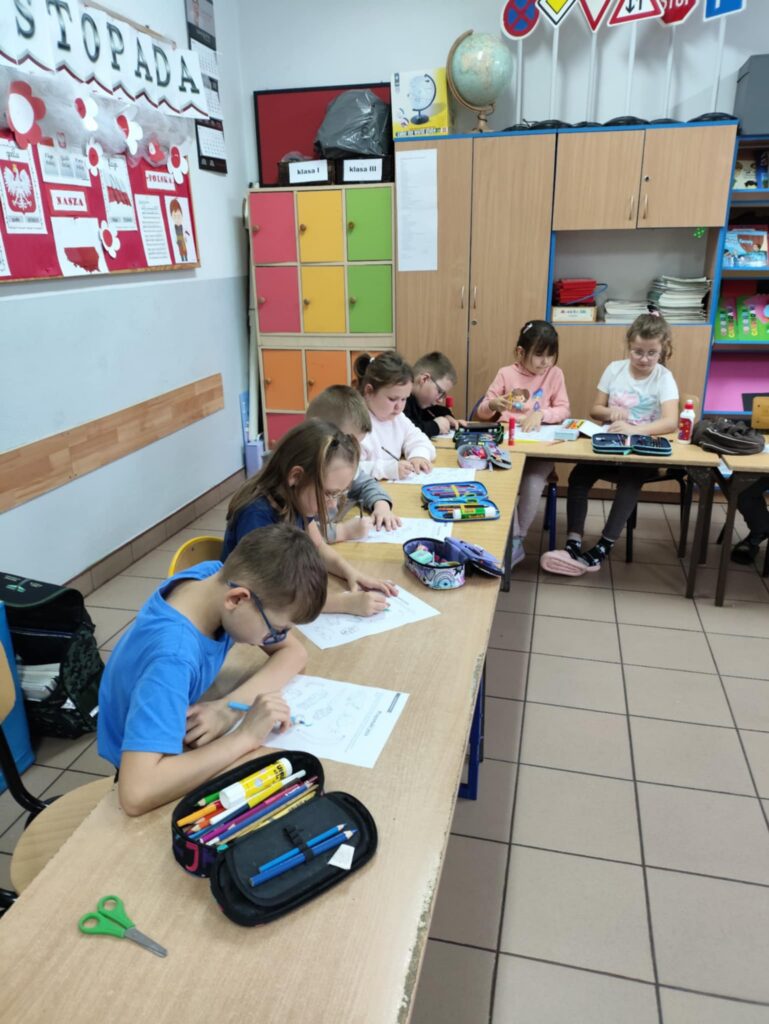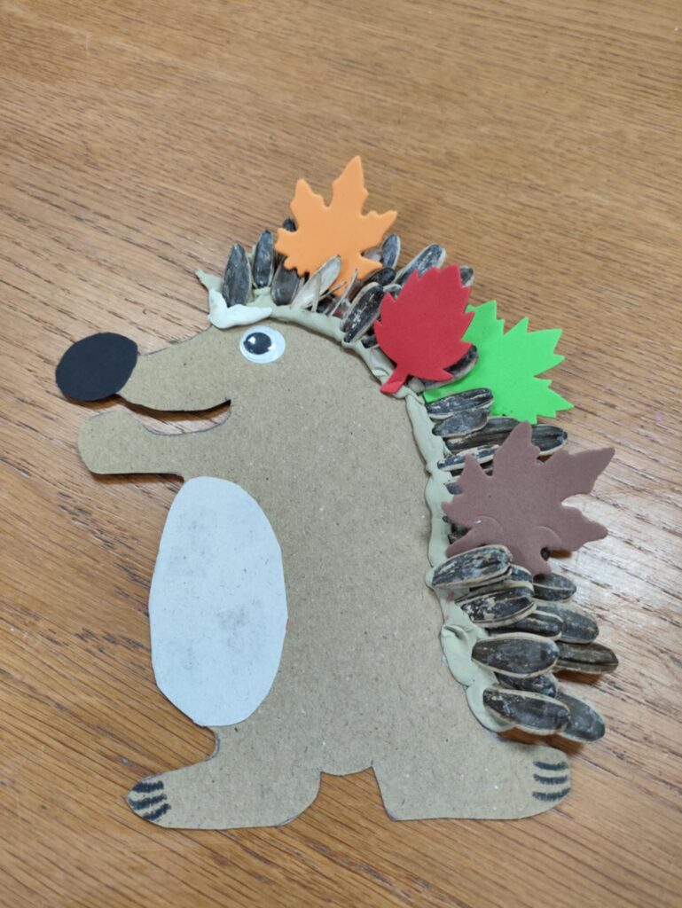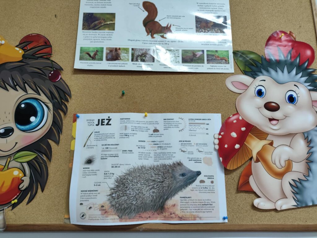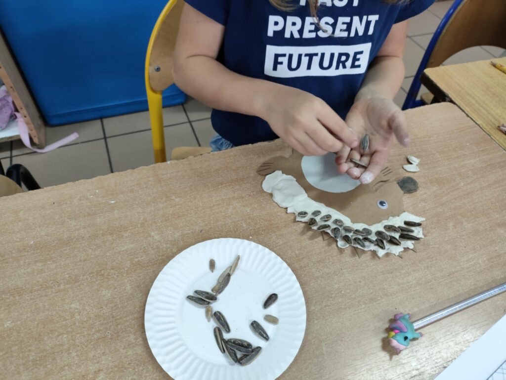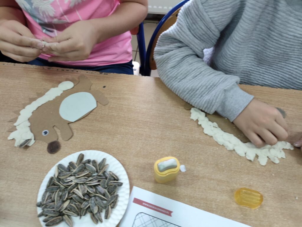 Po części edukacyjnej przyszedł czas na twórczą zabawę z modeliny i pestek słonecznika. Uczniowie wykonywali jeże używając modeliny i pestek słonecznika, które imitowały kolce jeża i dodawały pracy naturalnego charakteru. To wydarzenie nie tylko poszerzyło wiedzę uczniów o jeżach, ale także rozwijało ich zdolności manualne i wyobraźnię, a także uczyło szacunku dla przyrody.