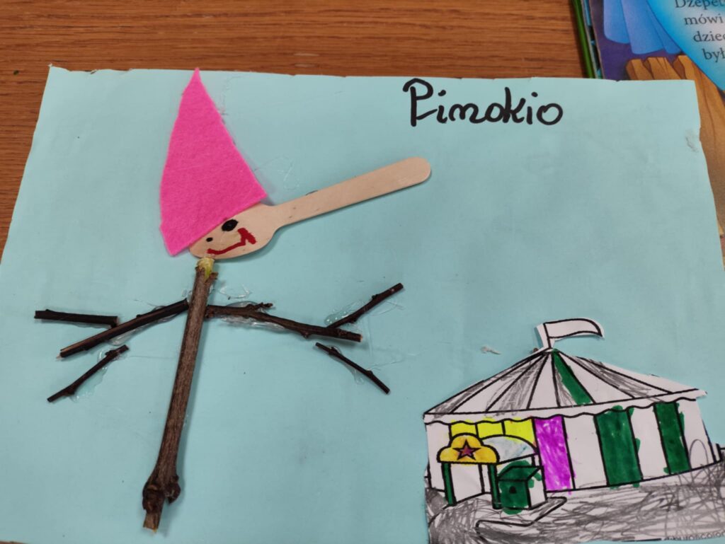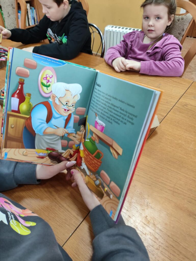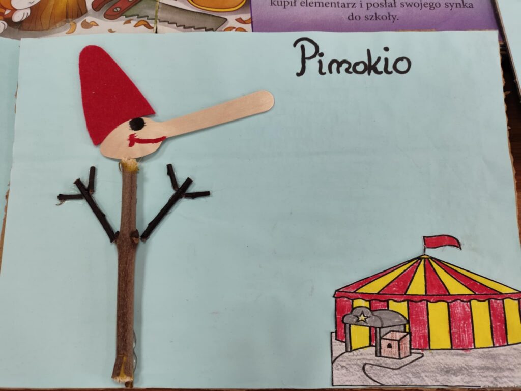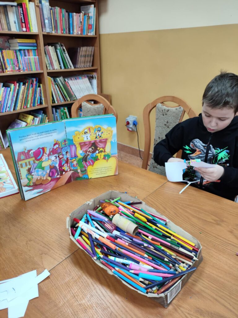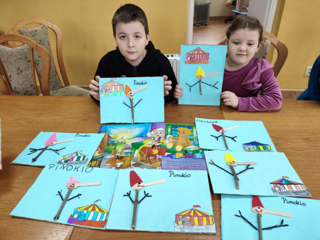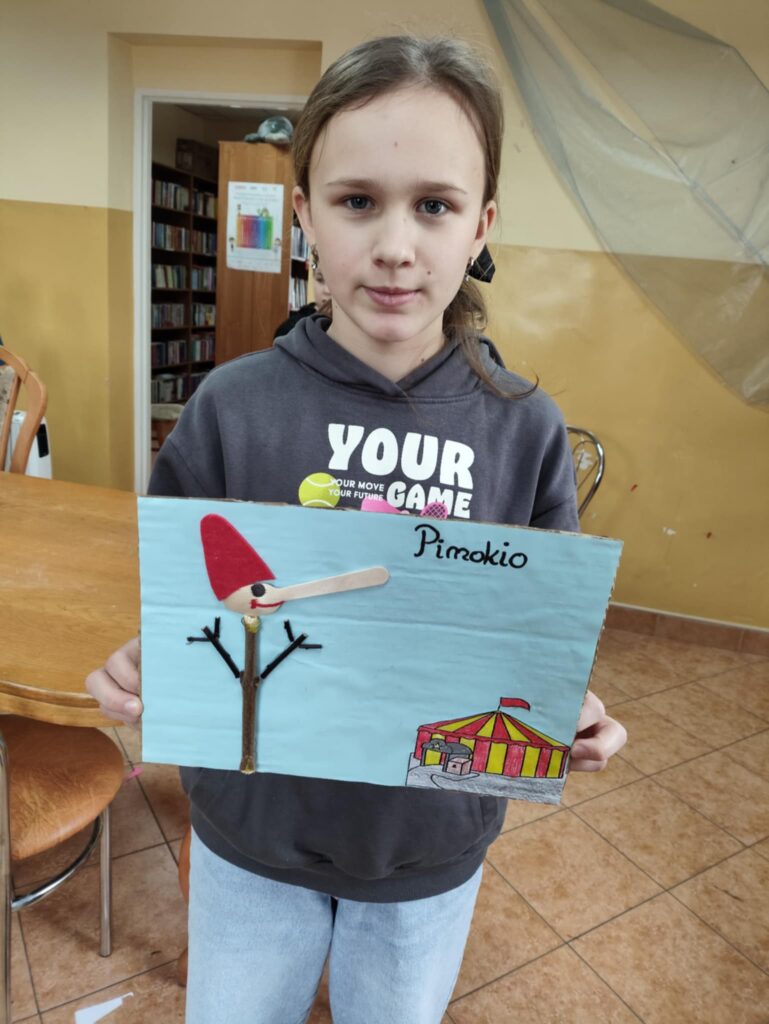 Drugi tydzień ferii w bibliotece to czas, kiedy zimowa aura spotyka się z ciepłem literackich przygód. Spotkanie rozpoczęliśmy od wspólnego czytania przygód Pinokia. Był też czas, na rozmowy o tym, że „kłamstwo ma krótkie nogi, ale długi nos”. Zainspirowani historią Dżepetta, mali artyści stworzyli własne wizerunki pajacyka, wykorzystując różnorodne techniki. Tym razem Eko- Pinokio wykonany z drewnianych łyżeczek, gałązek i filcu. To oryginalny sposób na wykorzystanie materiałów z recyklingu. Po części plastycznej przyszedł czas na ruch i śmiech. W bibliotece zrobiło się naprawdę głośno i wesoło, bo kalambury to moment, w którym literacka klasyka zamieniła się w czyste emocje!