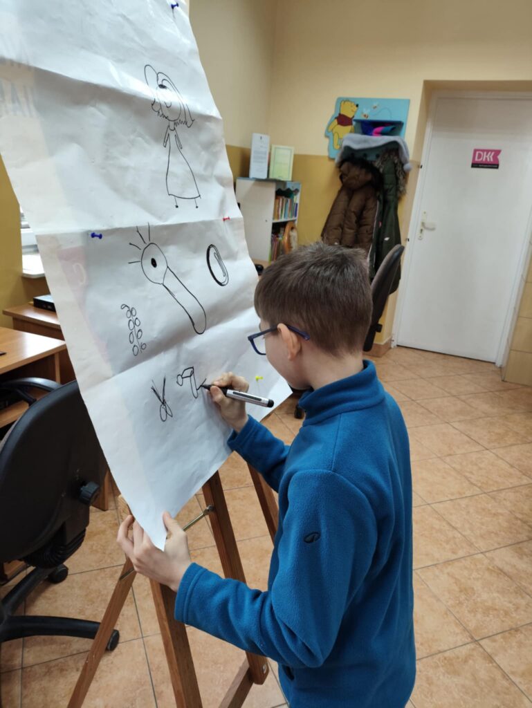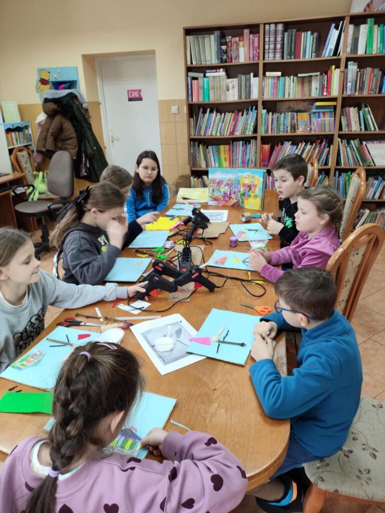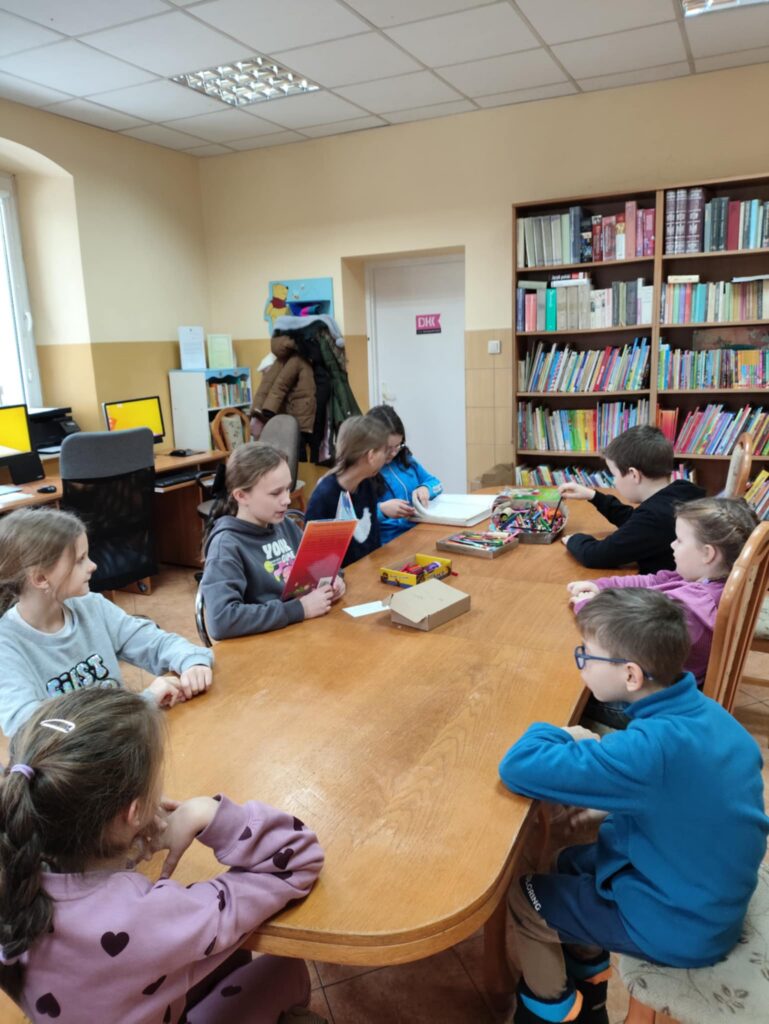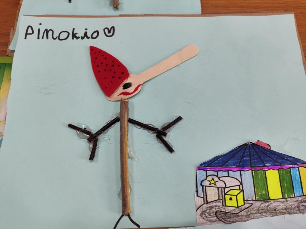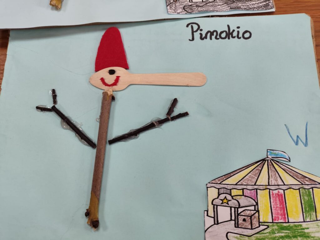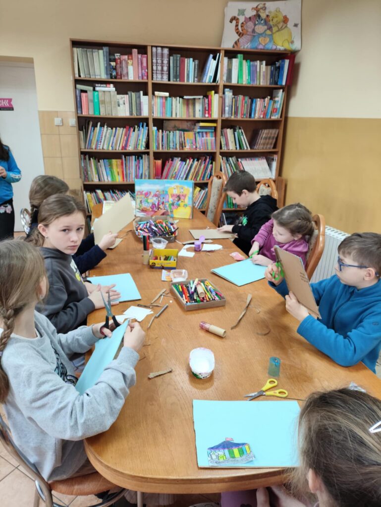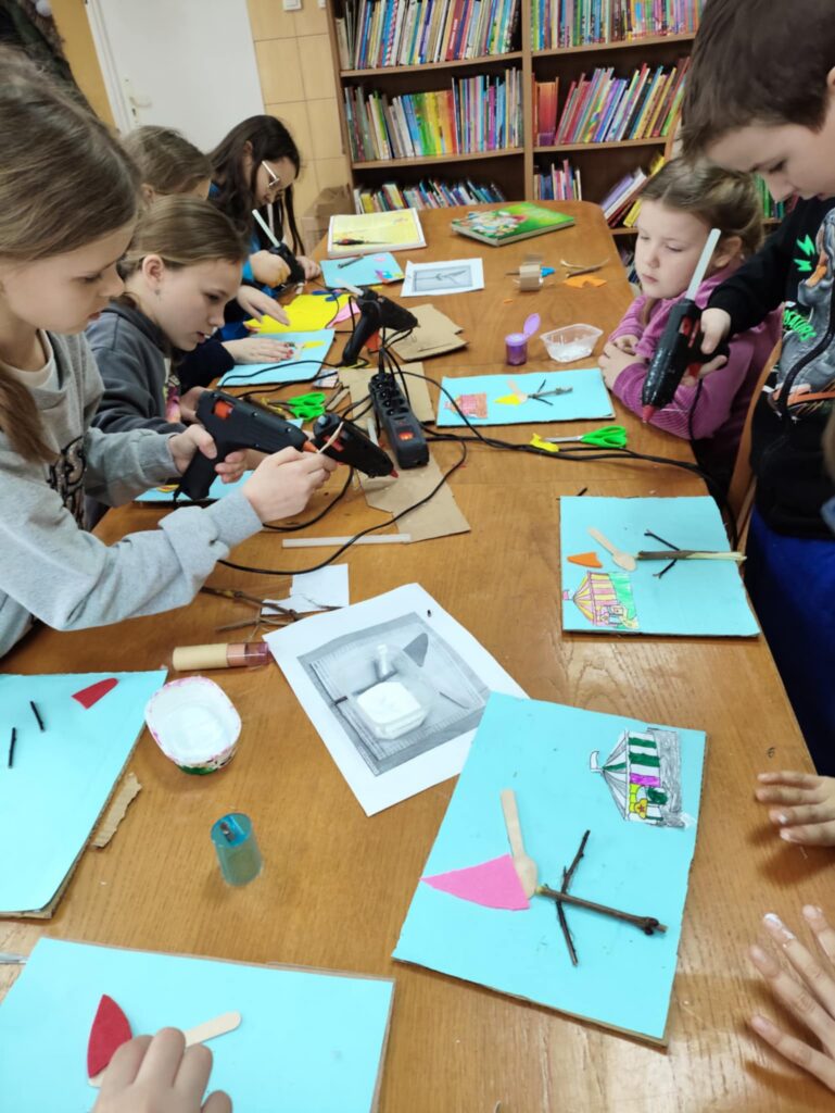 Drugi tydzień ferii w bibliotece to czas, kiedy zimowa aura spotyka się z ciepłem literackich przygód. Spotkanie rozpoczęliśmy od wspólnego czytania przygód Pinokia. Był też czas, na rozmowy o tym, że „kłamstwo ma krótkie nogi, ale długi nos”. Zainspirowani historią Dżepetta, mali artyści stworzyli własne wizerunki pajacyka, wykorzystując różnorodne techniki. Tym razem Eko- Pinokio wykonany z drewnianych łyżeczek, gałązek i filcu. To oryginalny sposób na wykorzystanie materiałów z recyklingu. Po części plastycznej przyszedł czas na ruch i śmiech. W bibliotece zrobiło się naprawdę głośno i wesoło, bo kalambury to moment, w którym literacka klasyka zamieniła się w czyste emocje!