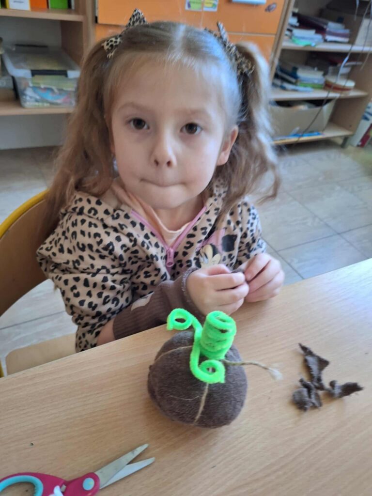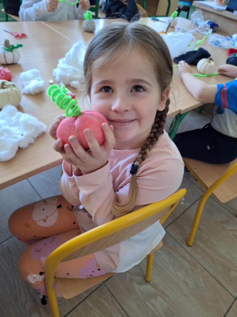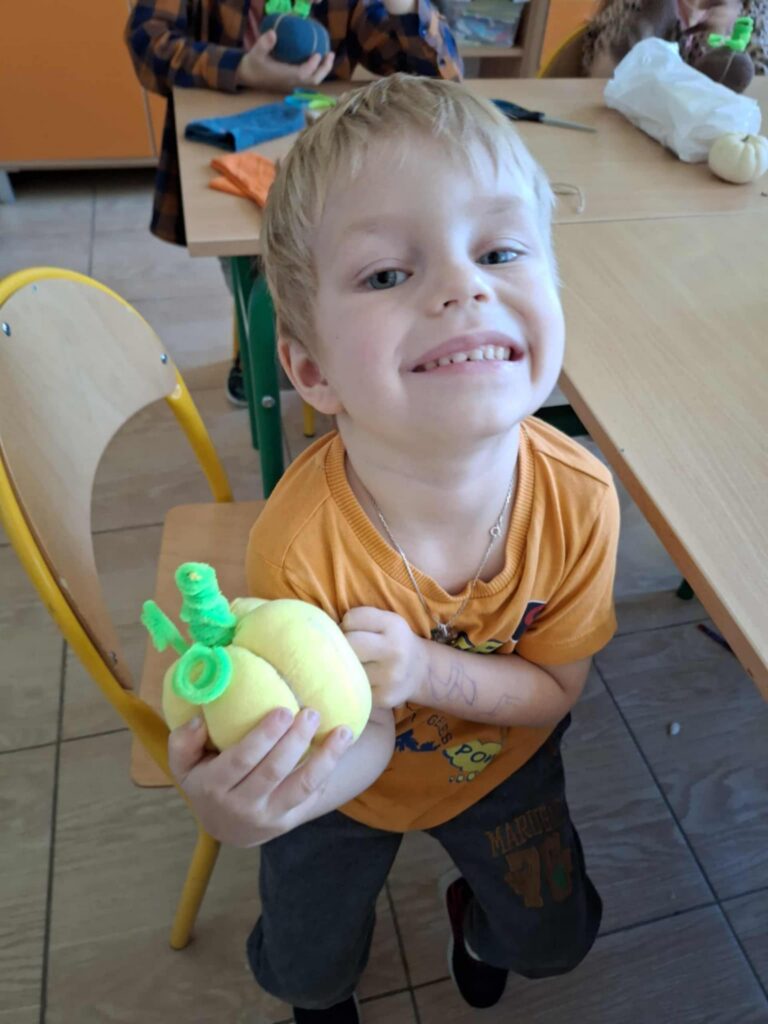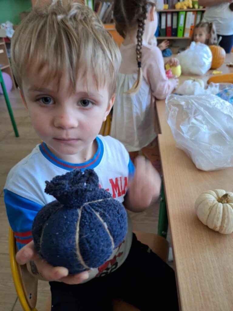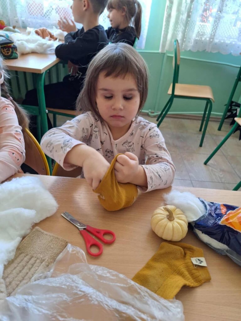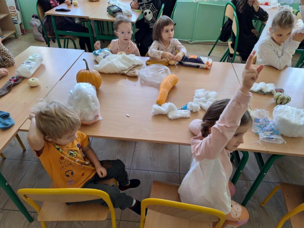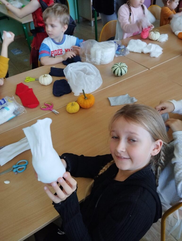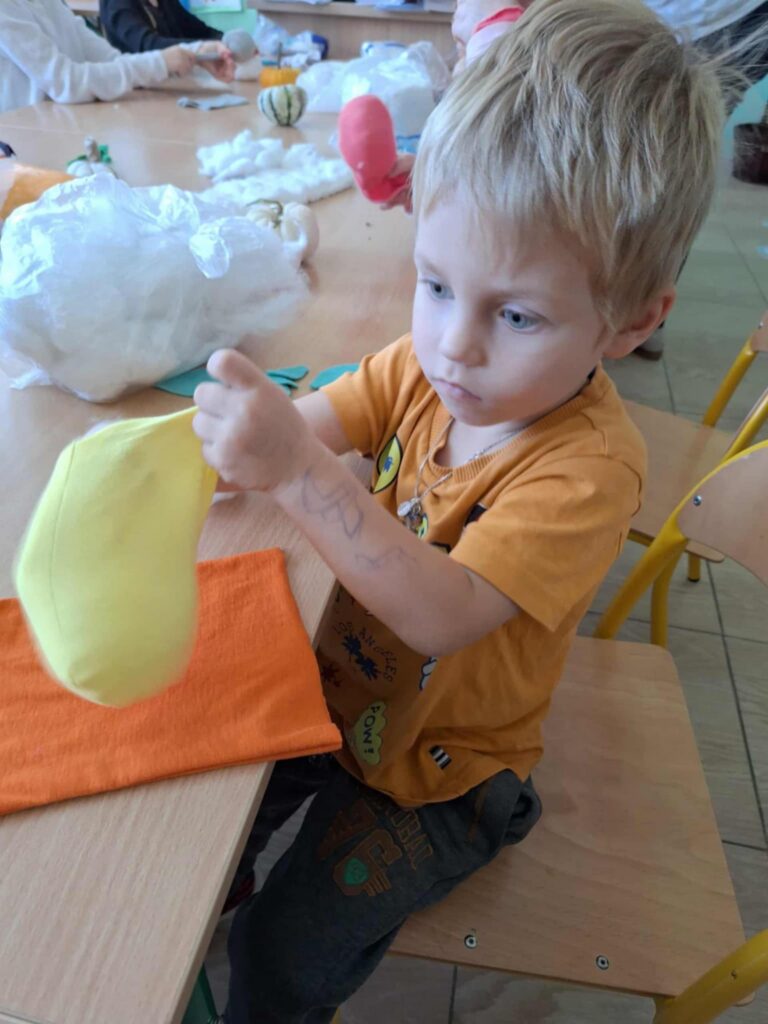Jednym z najbardziej wyczekiwanych punktów było wykonanie własnej, oryginalnej dyni z skarpetki i waty. Dzieci z radością brały udział w tym kreatywnym warsztacie. Najpierw wybierały kolorową skarpetkę, którą następnie wypełniały miękką watą, tworząc kształt dyni. Na końcu dodawały ozdoby – liście , wąs czepny itp. Efektem końcowym były urocze, własnoręcznie wykonane dynie, które dzieci zabrały do domu jako pamiątkę tego wyjątkowego dnia.