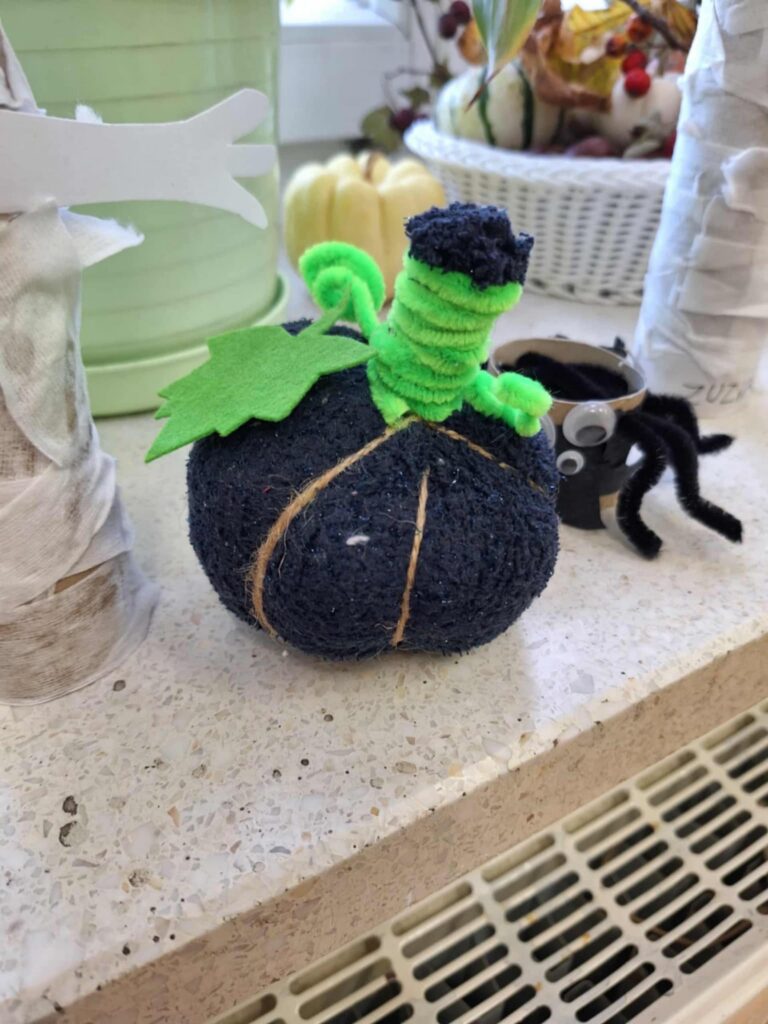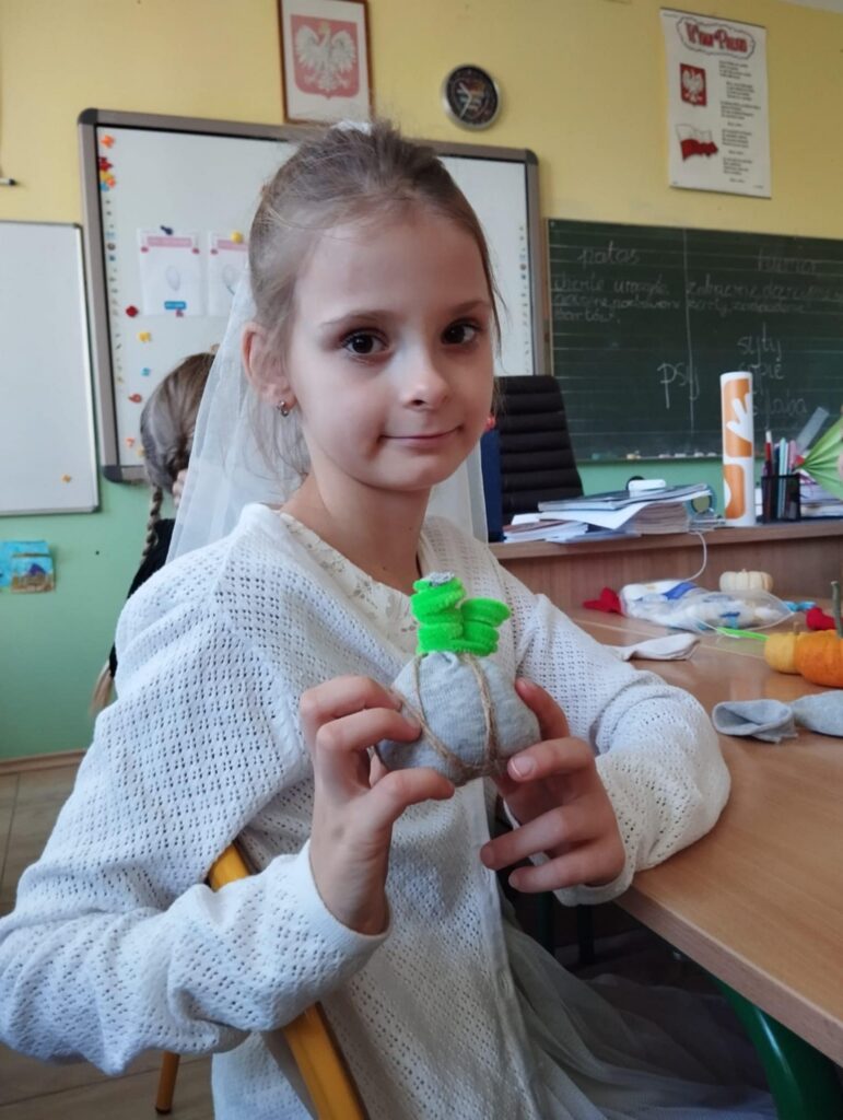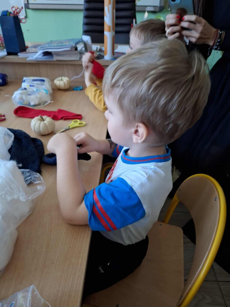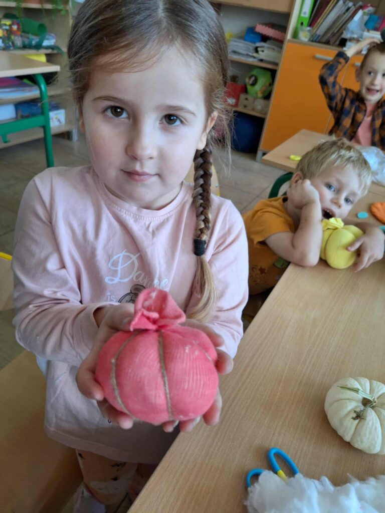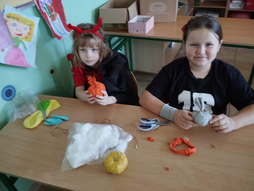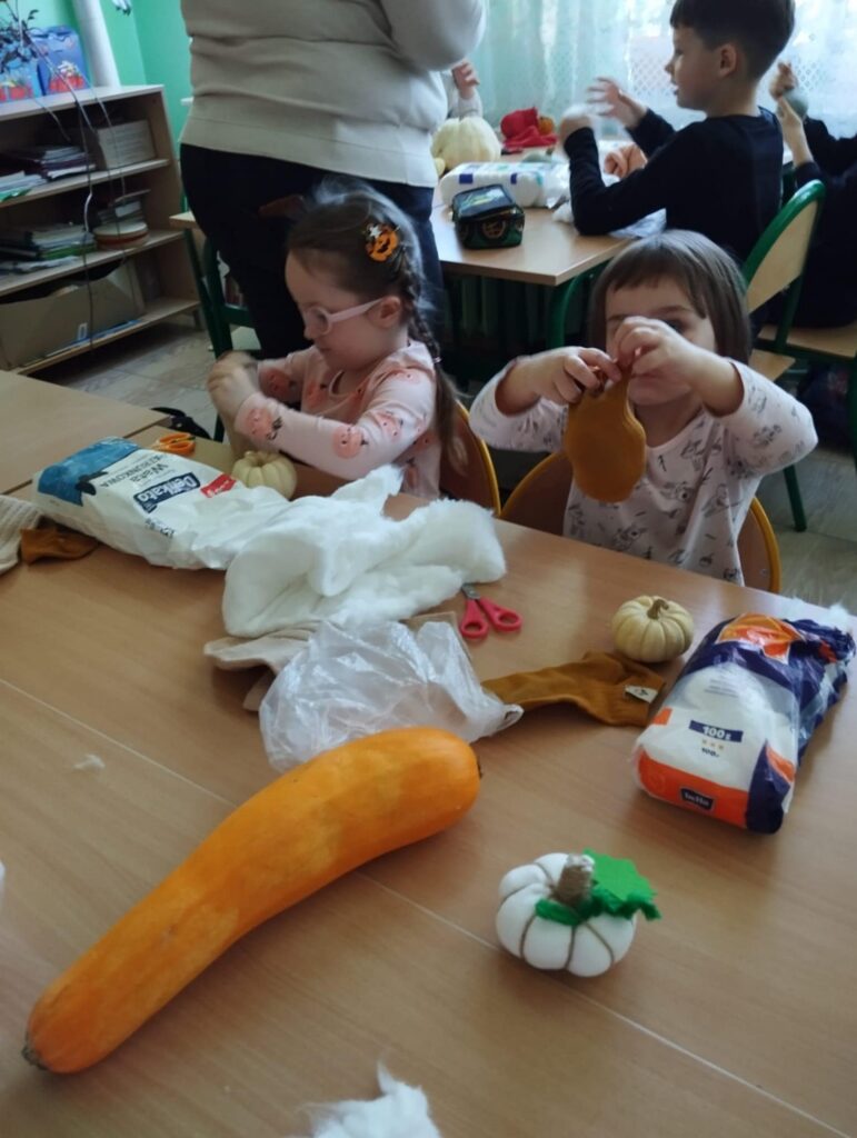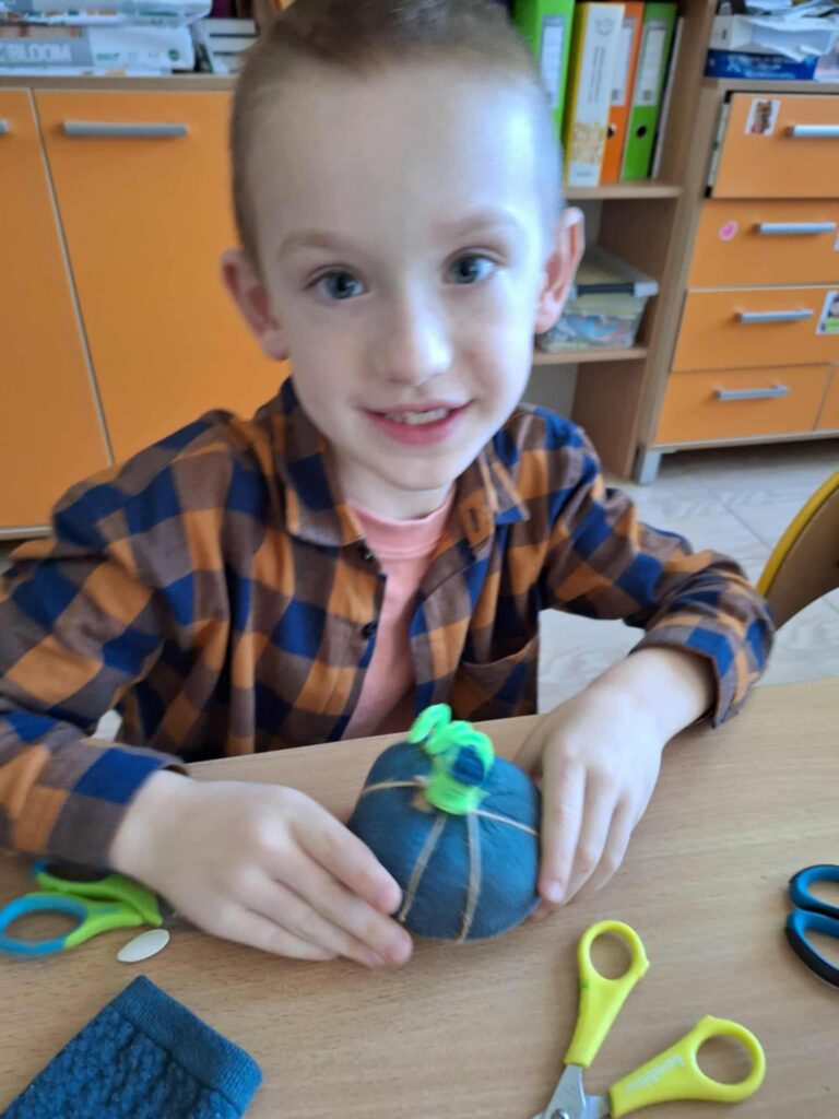 Jednym z najbardziej wyczekiwanych punktów było wykonanie własnej, oryginalnej dyni z skarpetki i waty. Dzieci z radością brały udział w tym kreatywnym warsztacie. Najpierw wybierały kolorową skarpetkę, którą następnie wypełniały miękką watą, tworząc kształt dyni. Na końcu dodawały ozdoby – liście , wąs czepny itp. Efektem końcowym były urocze, własnoręcznie wykonane dynie, które dzieci zabrały do domu jako pamiątkę tego wyjątkowego dnia.