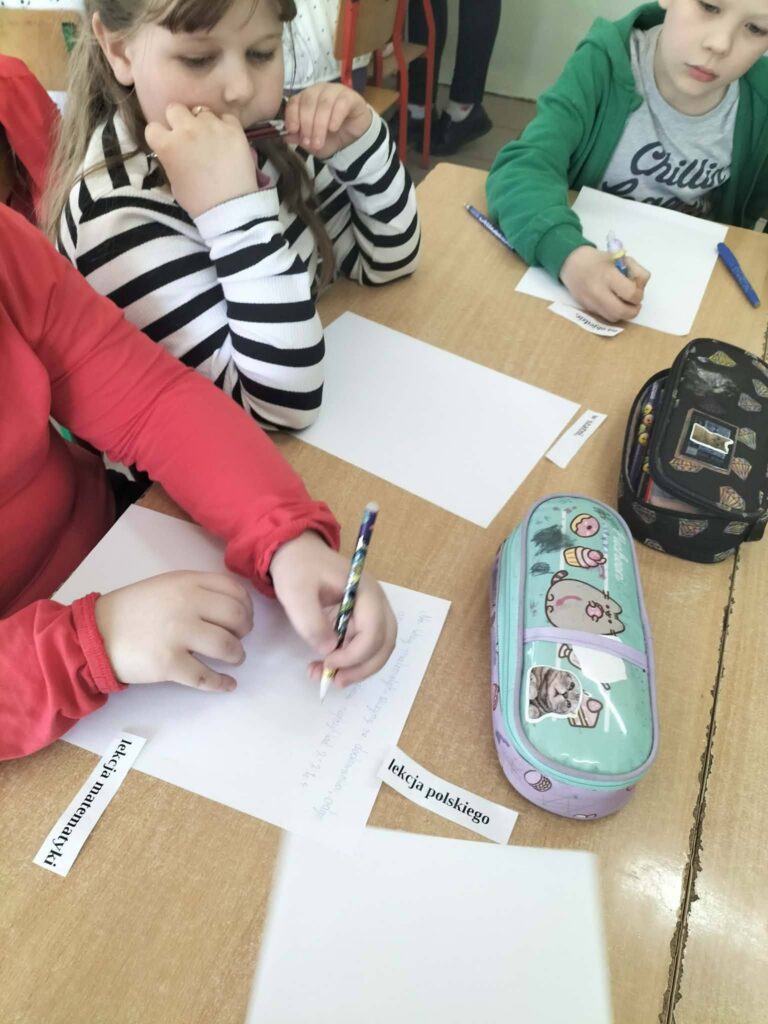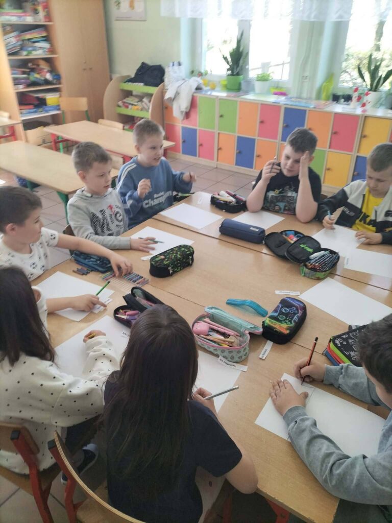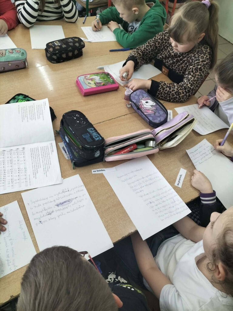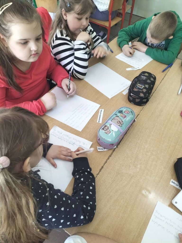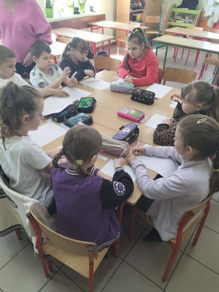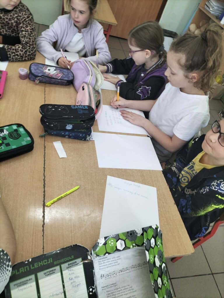 Druga część zajęć miała charakter praktyczny i twórczy. Klasa została podzielona na dwie grupy. Pierwsza grupa pracowała nad krótkimi opisami dotyczącymi życia klasy – ukrytymi pod hasłami takimi jak: na przerwie, na boisku, na placu zabaw, na wycieczce, w szatni czy podczas lekcji języka polskiego. Druga grupa zajęła się przygotowaniem ilustracji do tych samych tematów. Dzieci wykazały się dużą pomysłowością i zaangażowaniem, starannie oddając w rysunkach codzienne szkolne sytuacje.