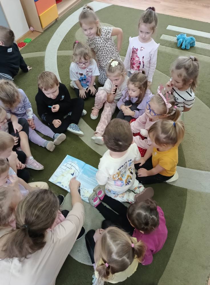 Dzieci wysłuchały 2-ch opowiadań. Pierwsze było o pingwinku Oskarku i niedźwiadkach polarnych Patrycji i Patryku i o ich wspólnych zabawach na śniegu. Drugie o dobrym piesku, który pomógł chłopcu wydostać się z zaspy śnieżnej.