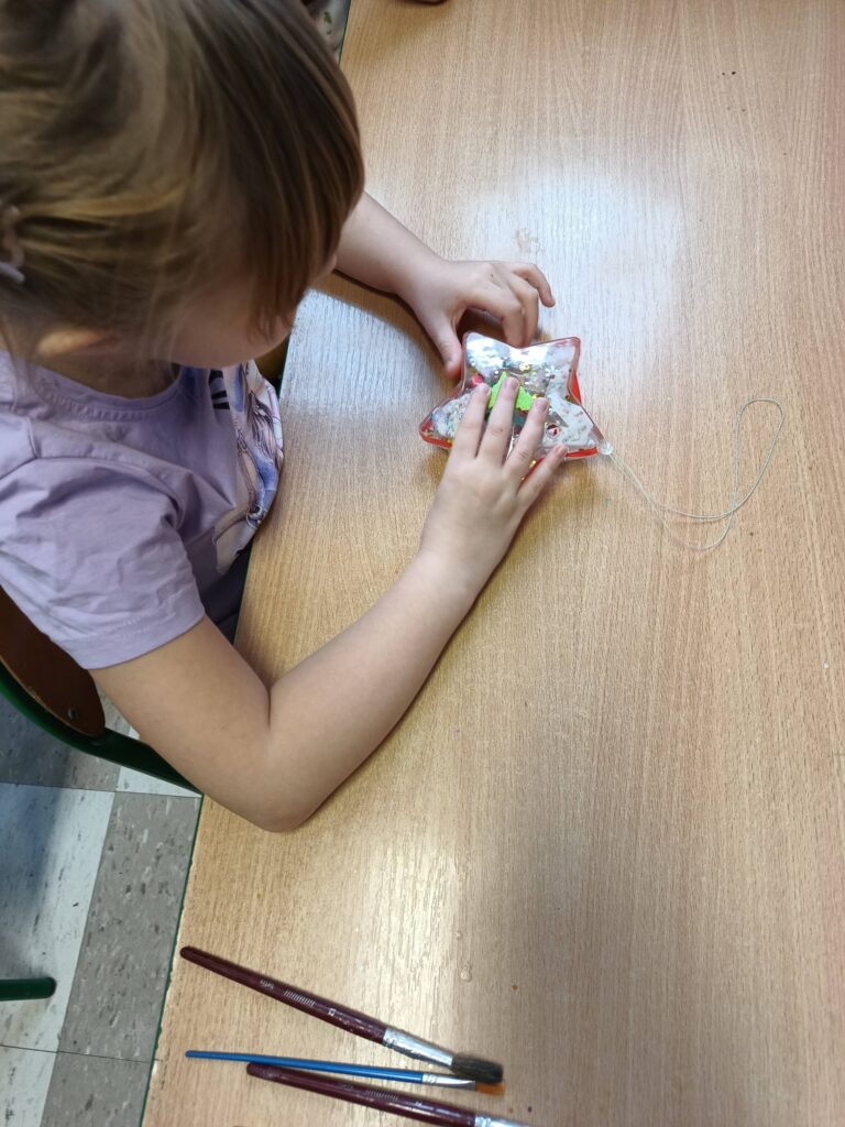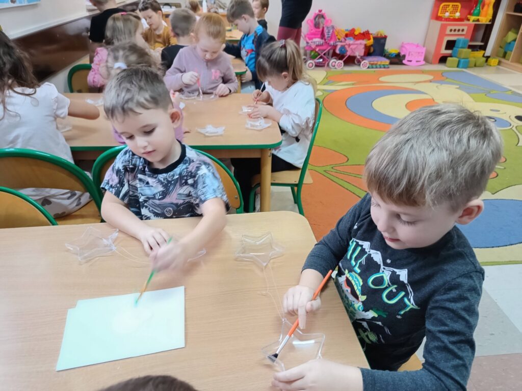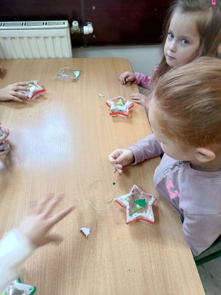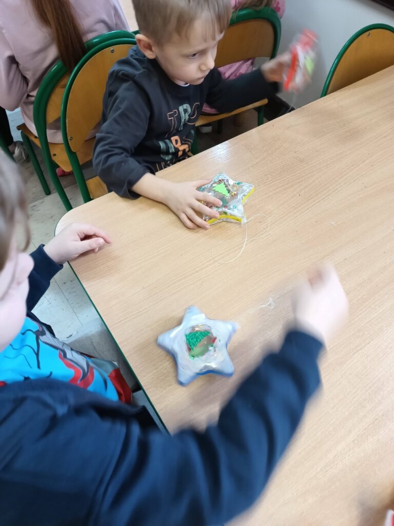 Jako pracę świąteczną przedszkolaki ozdobiły cekinami akrylową gwiazdę. Oczywiście chłopcy odkryli że świetnie nadaje się na kręciołka.