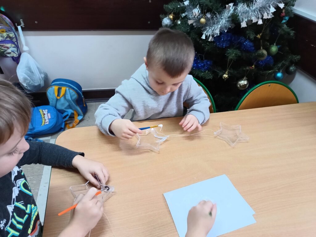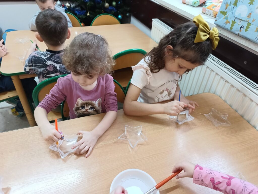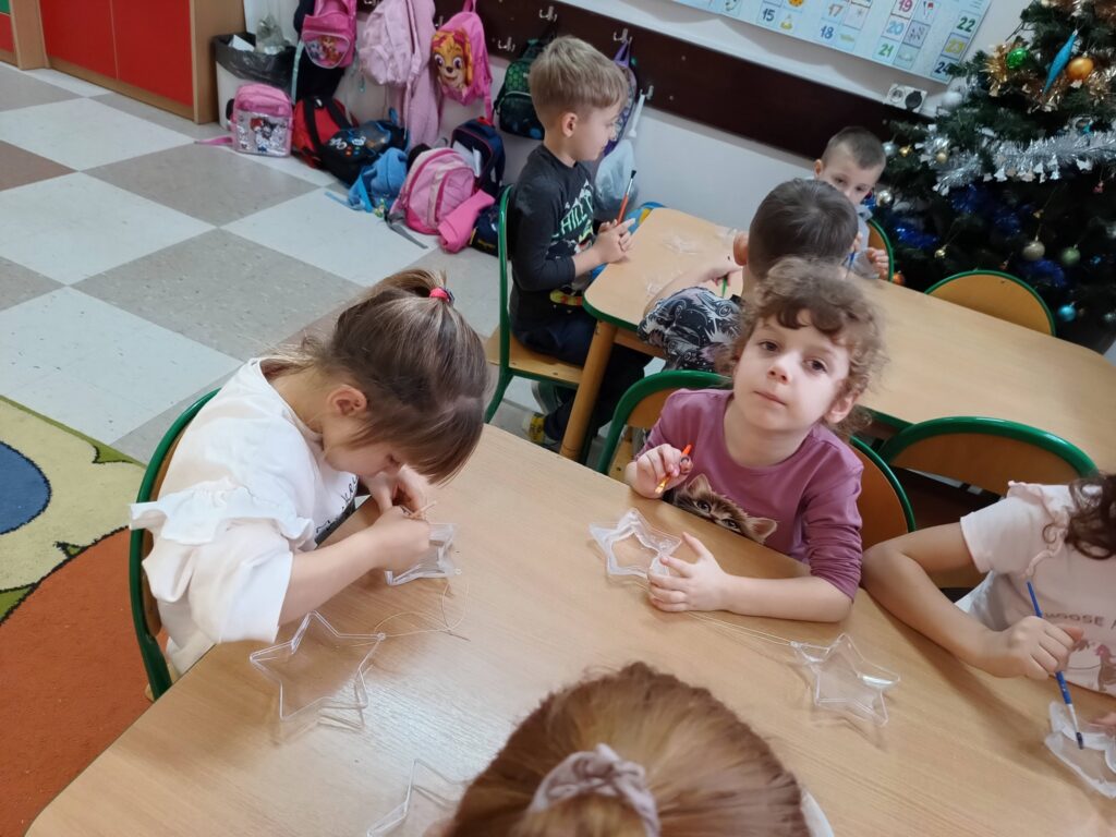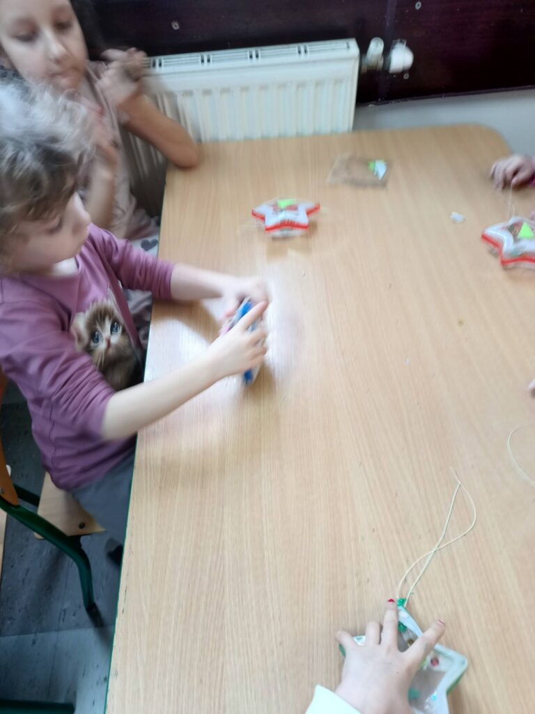 Jako pracę świąteczną przedszkolaki ozdobiły cekinami akrylową gwiazdę. Oczywiście chłopcy odkryli że świetnie nadaje się na kręciołka.