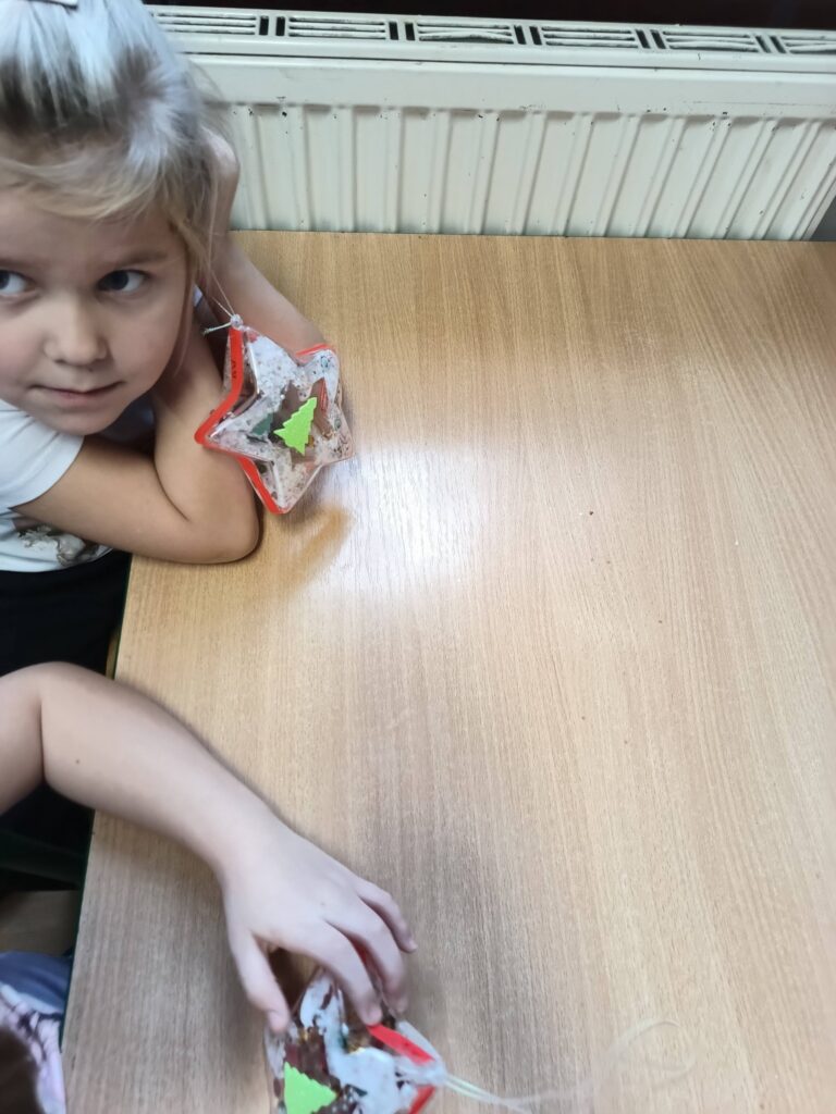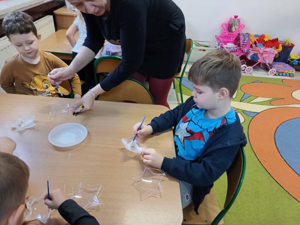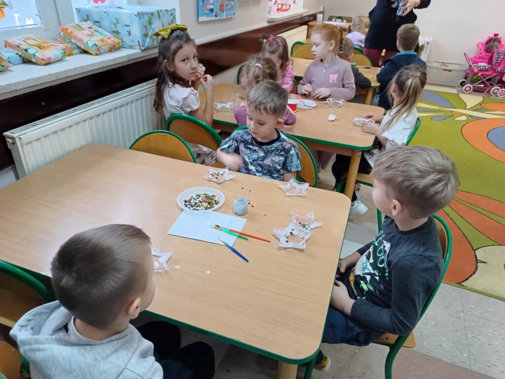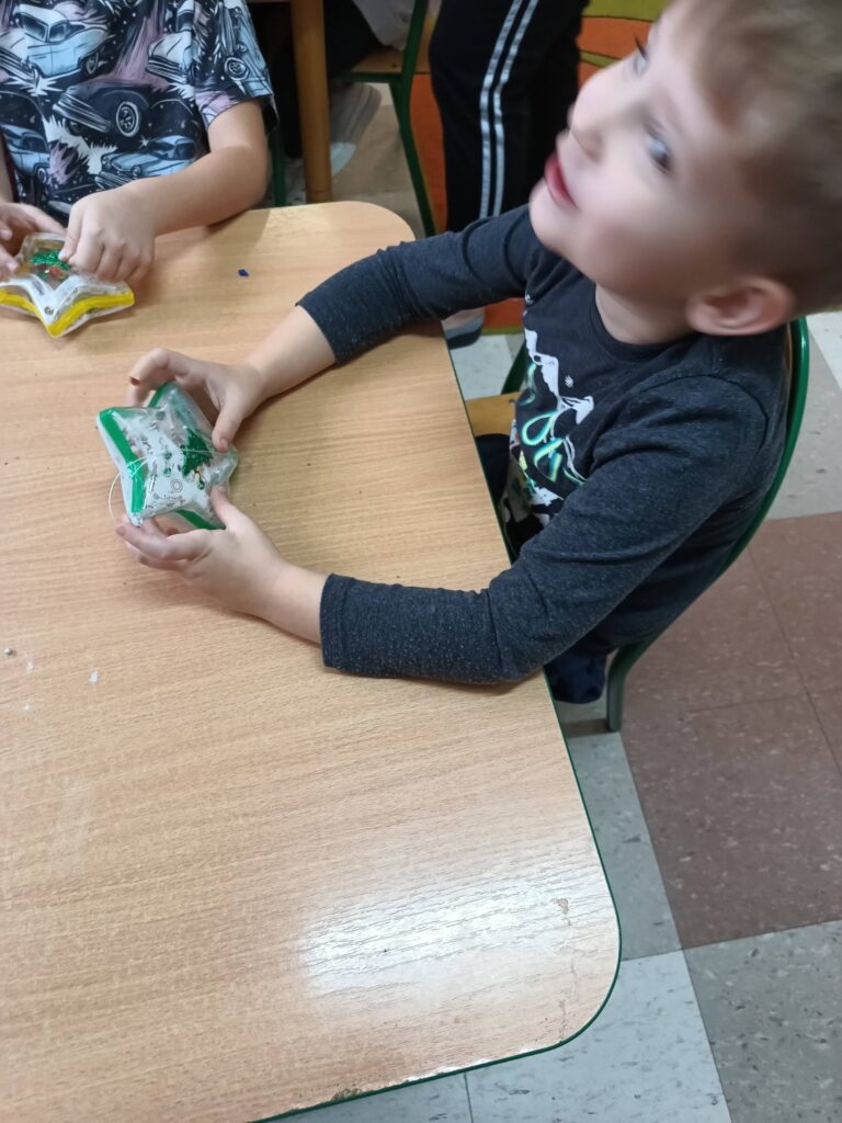 Jako pracę świąteczną przedszkolaki ozdobiły cekinami akrylową gwiazdę. Oczywiście chłopcy odkryli że świetnie nadaje się na kręciołka.