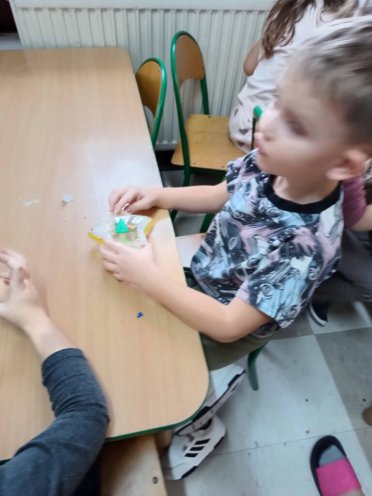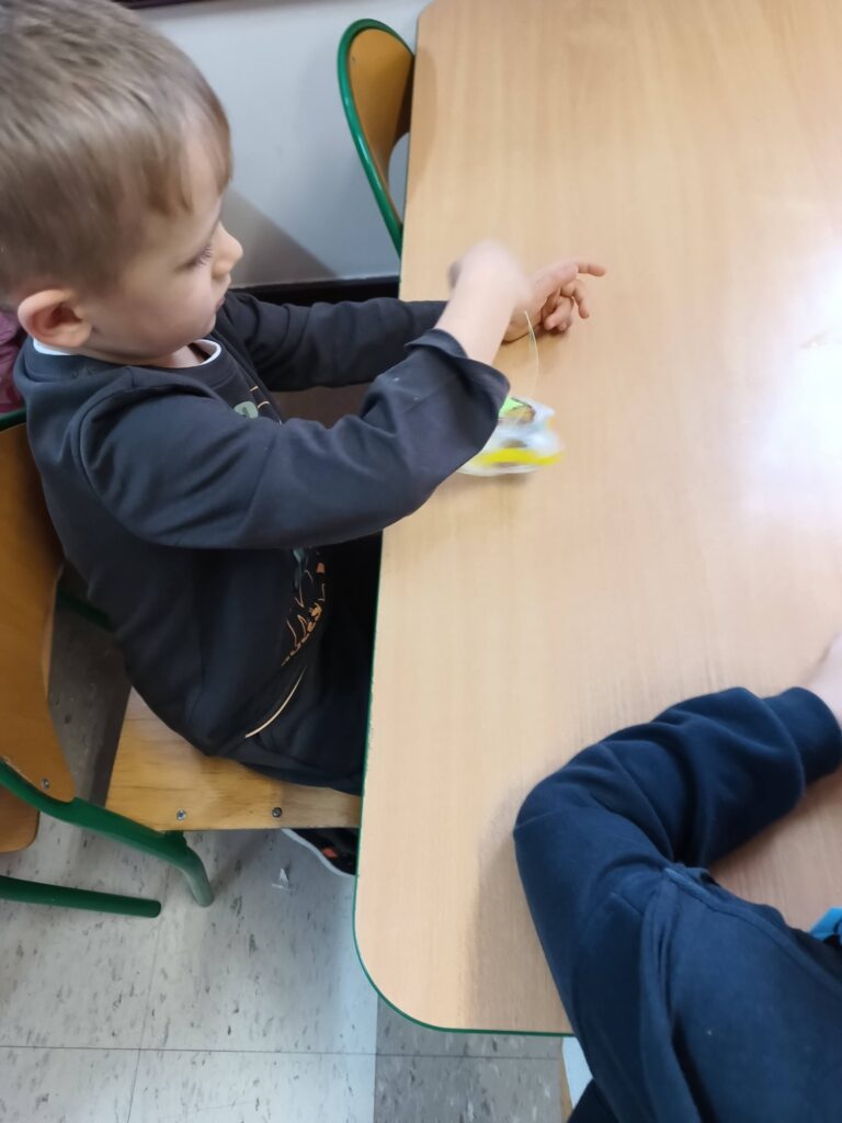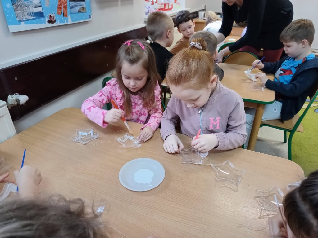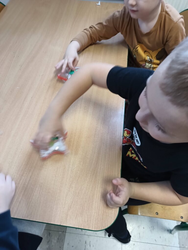 Jako pracę świąteczną przedszkolaki ozdobiły cekinami akrylową gwiazdę. Oczywiście chłopcy odkryli że świetnie nadaje się na kręciołka.
