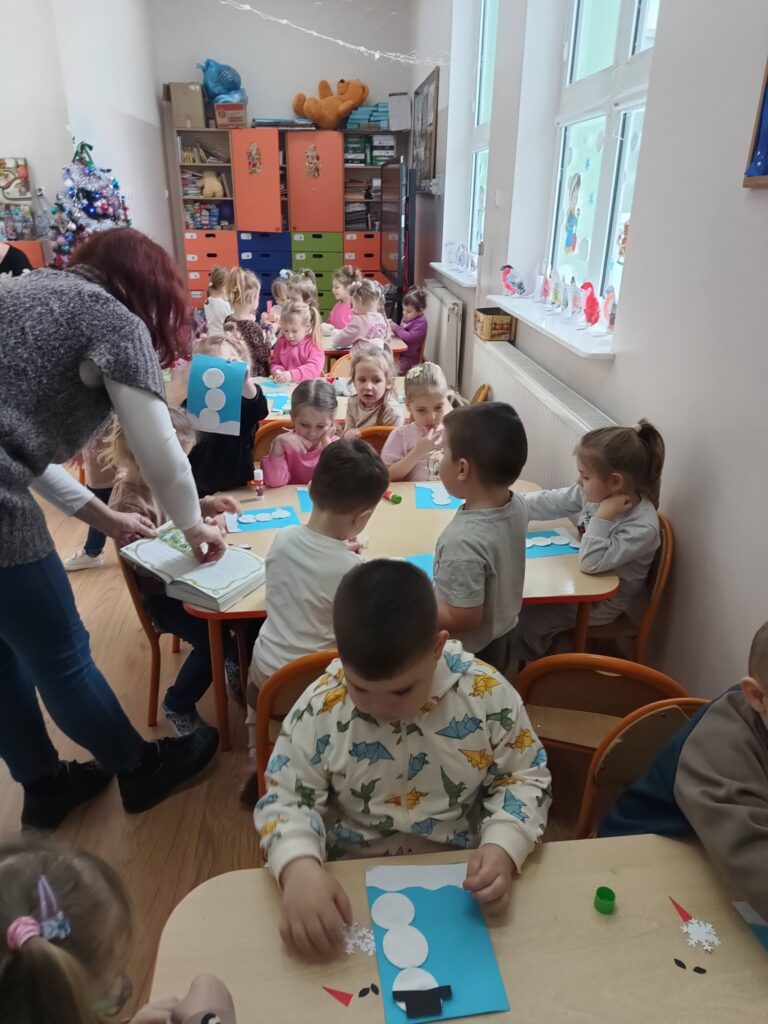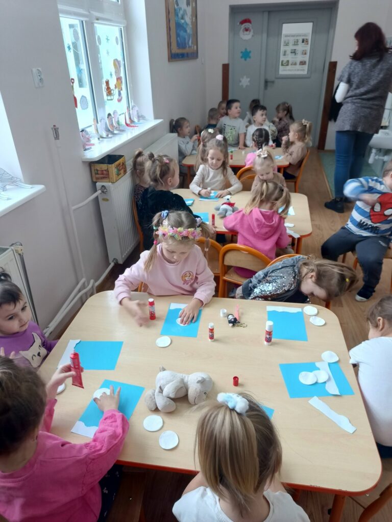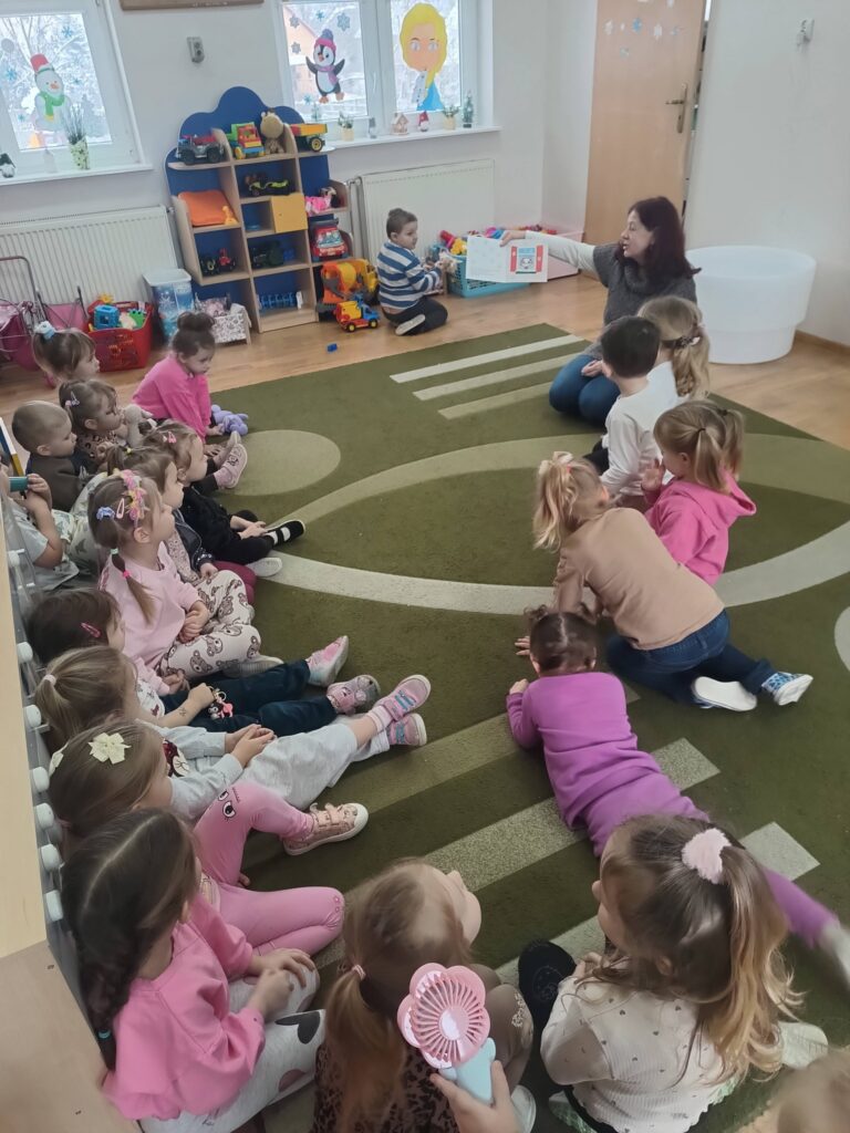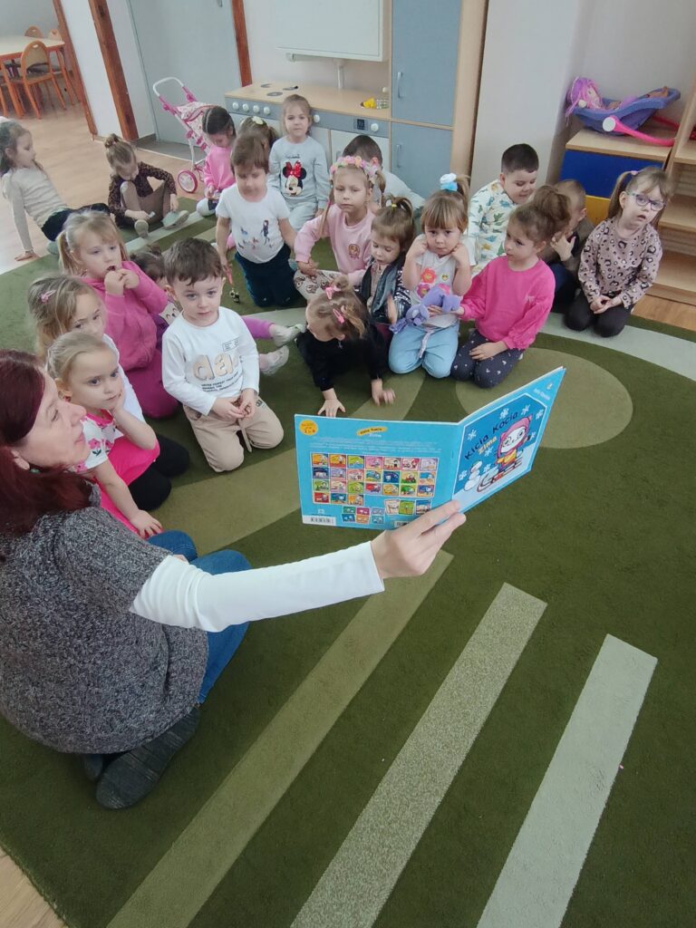 Dziś odwiedziłam najmłodszą grupę przedszkolną. Nasze wspaniałe Maluchy wysłuchały bajki „Kicia Kocia. Zima”, w której opisane są przygody Kici Koci i jej przyjaciół na śniegu.