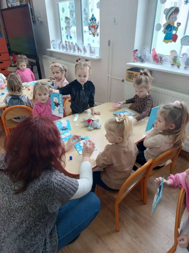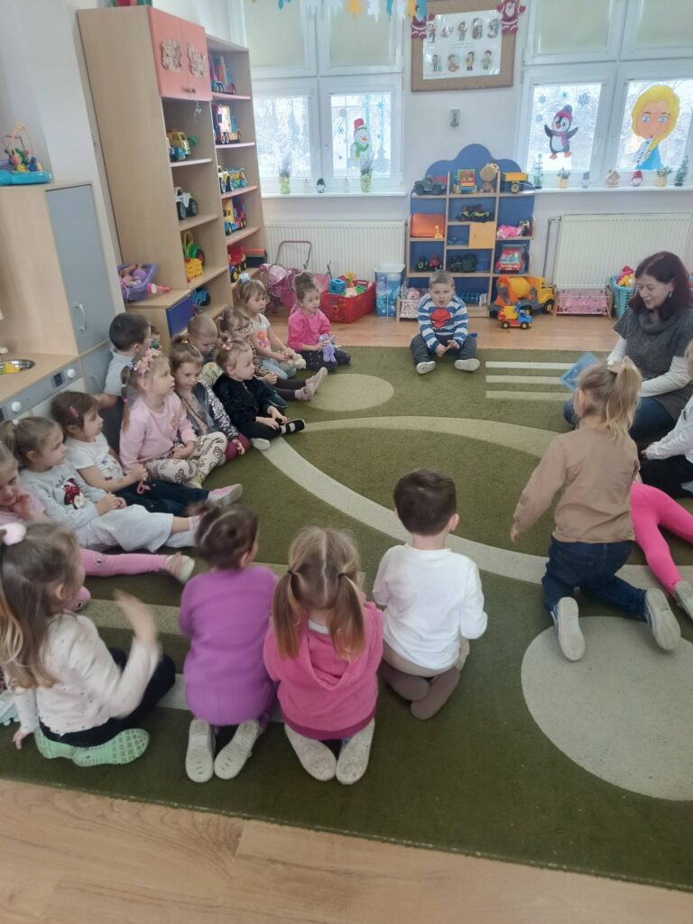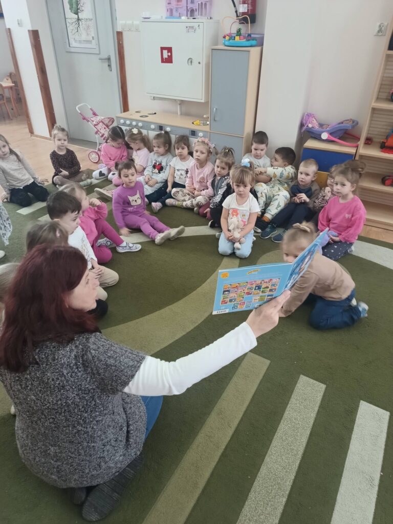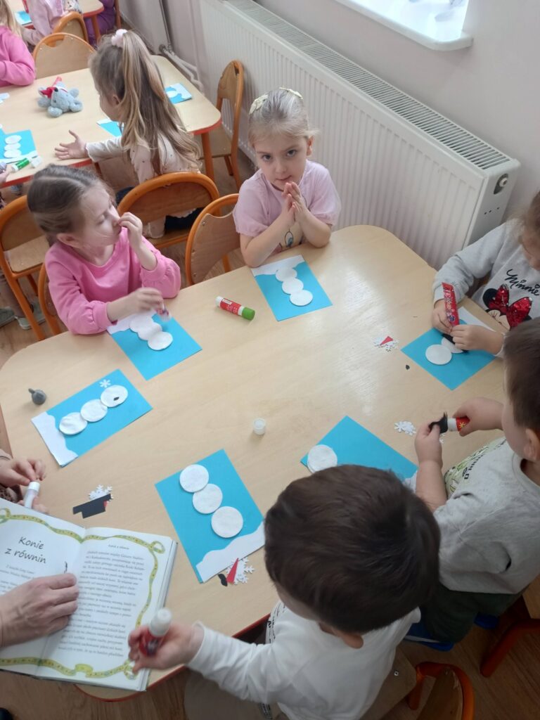 Dziś odwiedziłam najmłodszą grupę przedszkolną. Nasze wspaniałe Maluchy wysłuchały bajki „Kicia Kocia. Zima”, w której opisane są przygody Kici Koci i jej przyjaciół na śniegu.