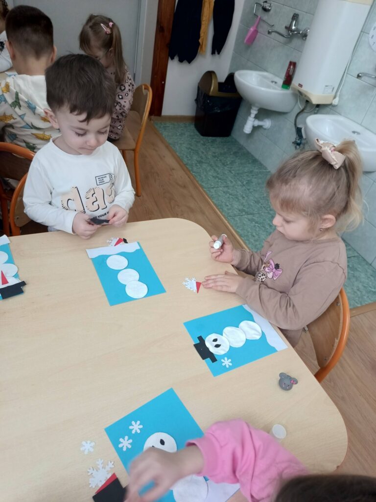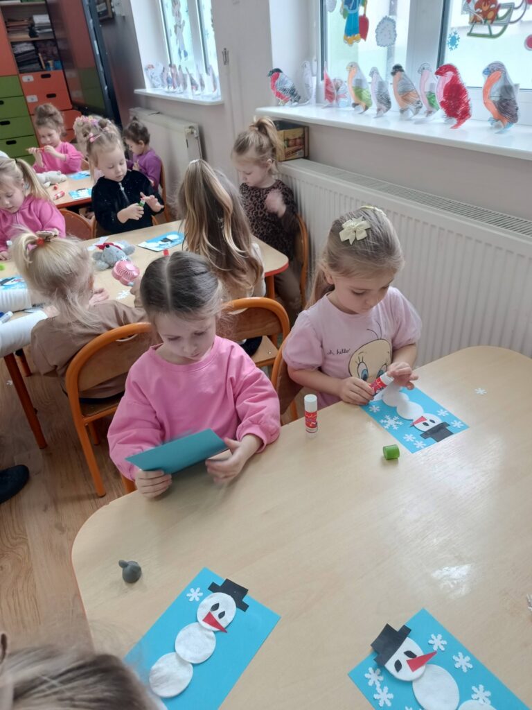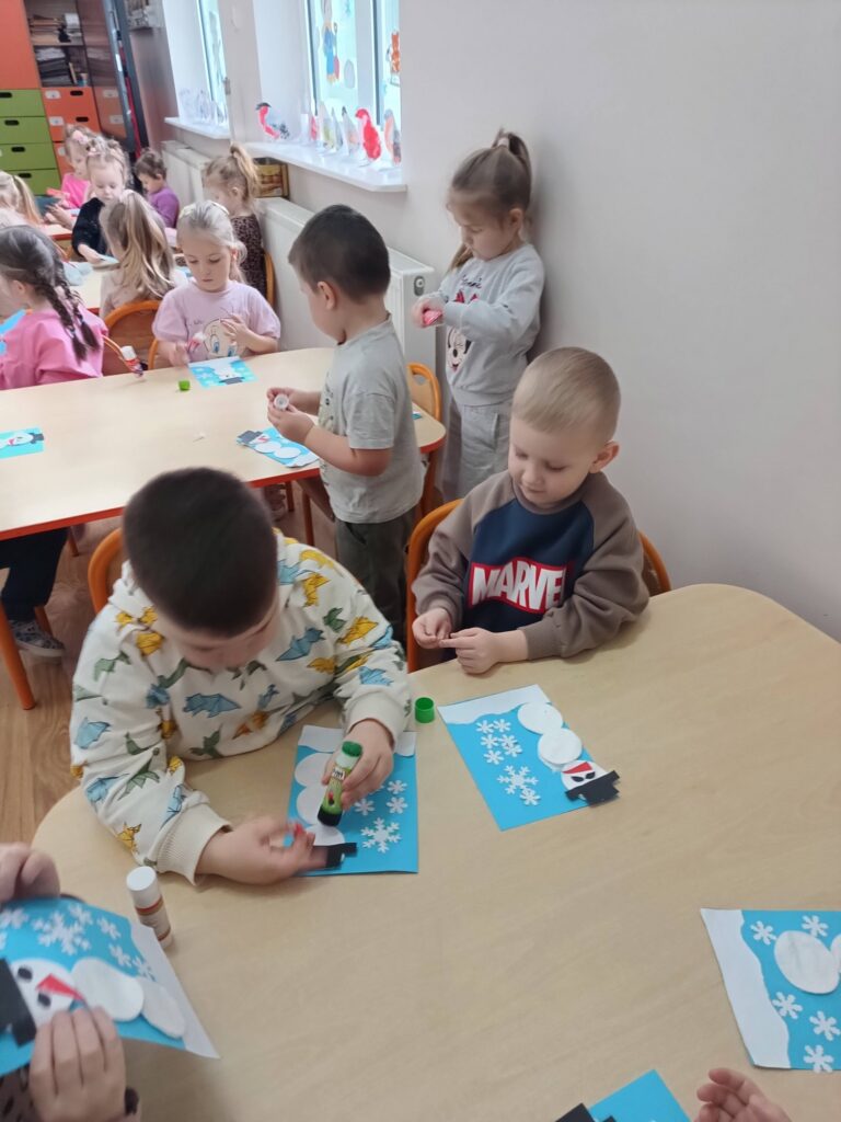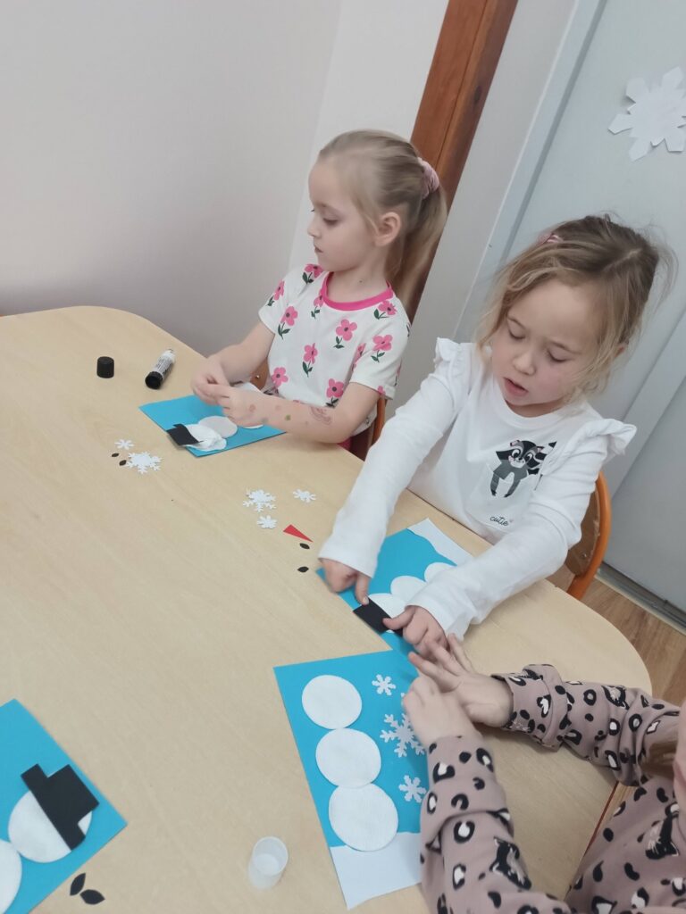 Jako pracę plastyczną wykonane zostały zimowe obrazki z bałwankiem z wacików kosmetycznych.
