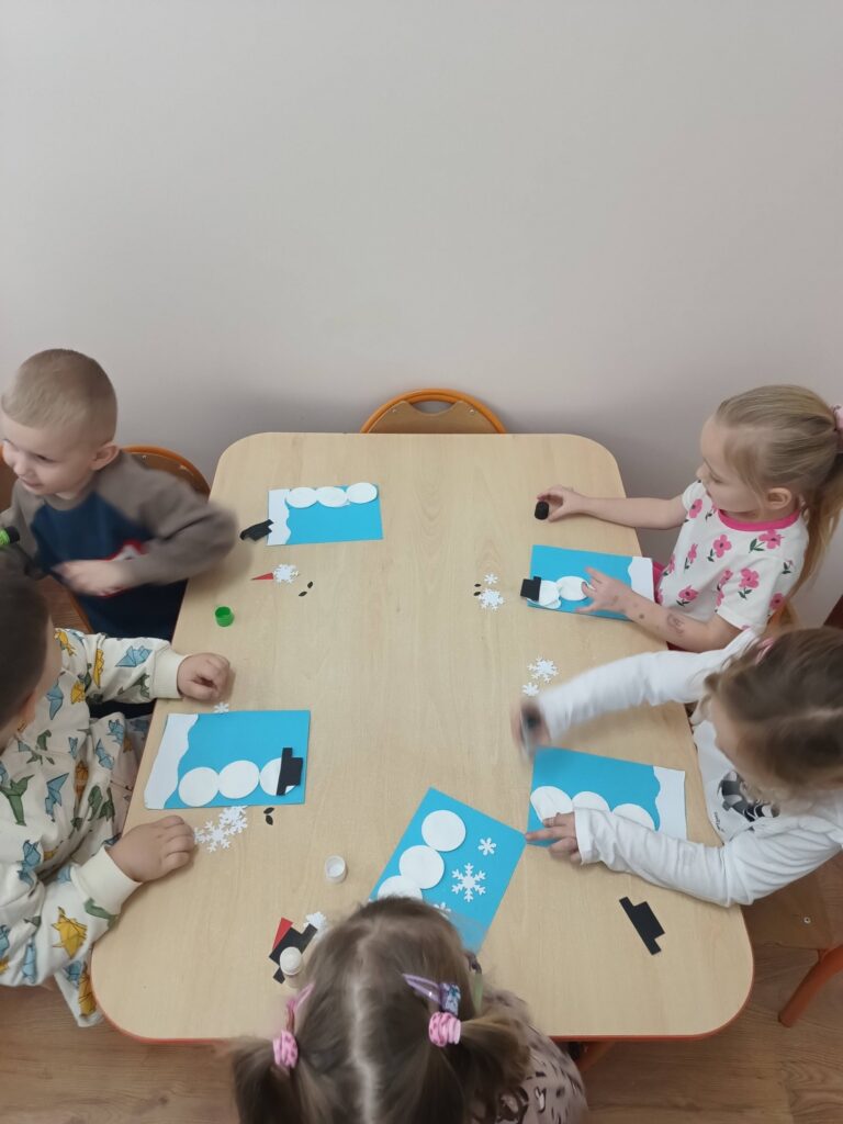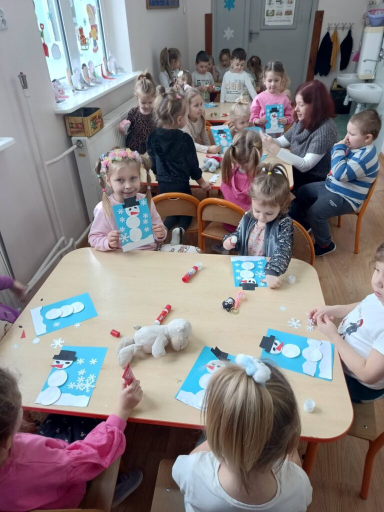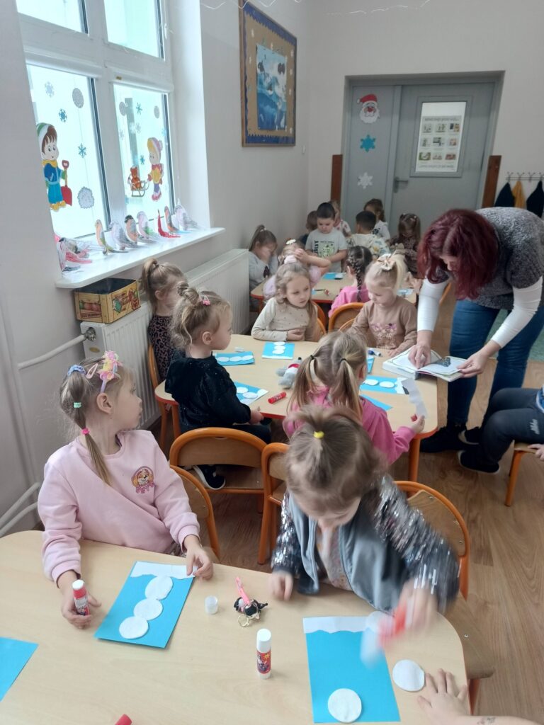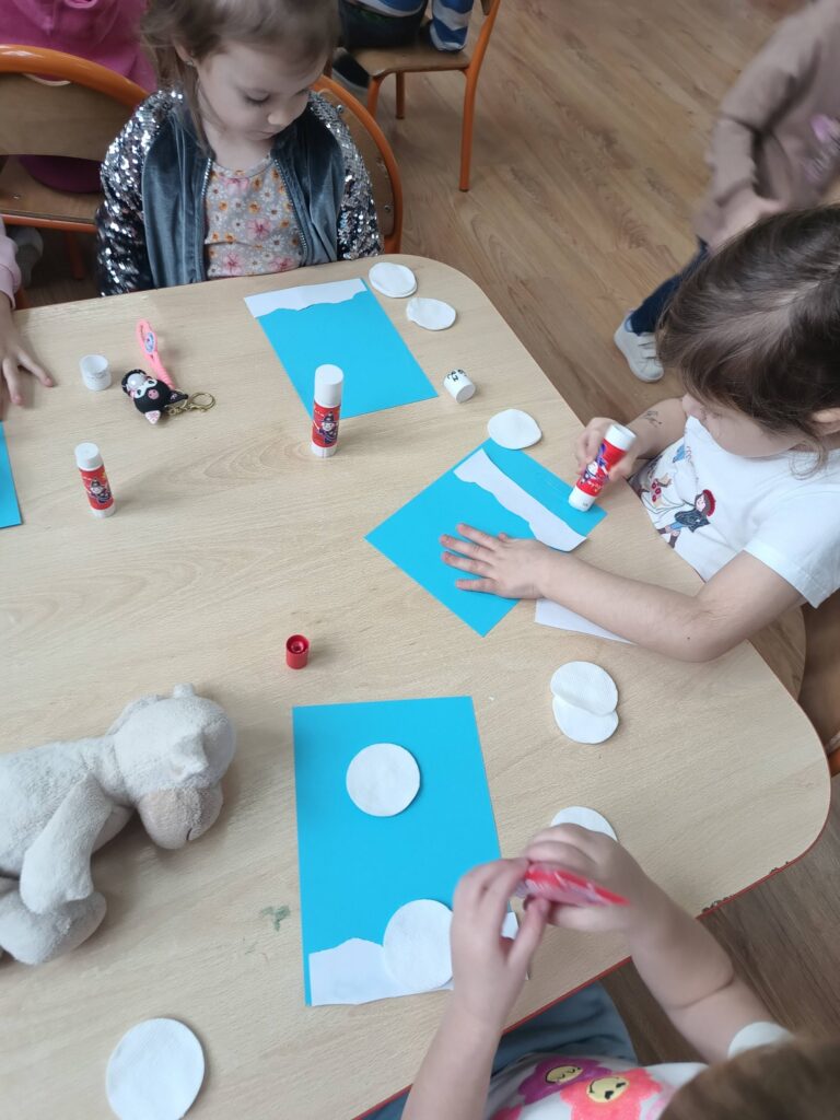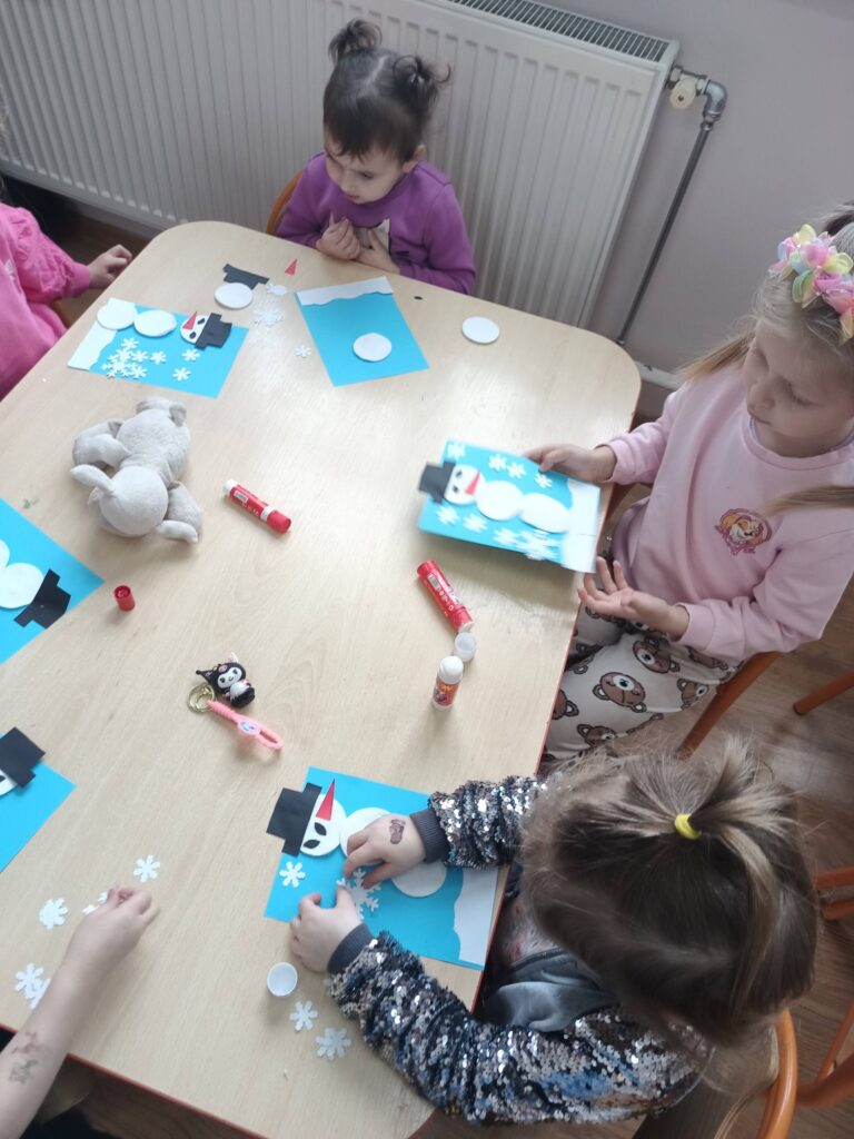 Jako pracę plastyczną wykonane zostały zimowe obrazki z bałwankiem z wacików kosmetycznych.
