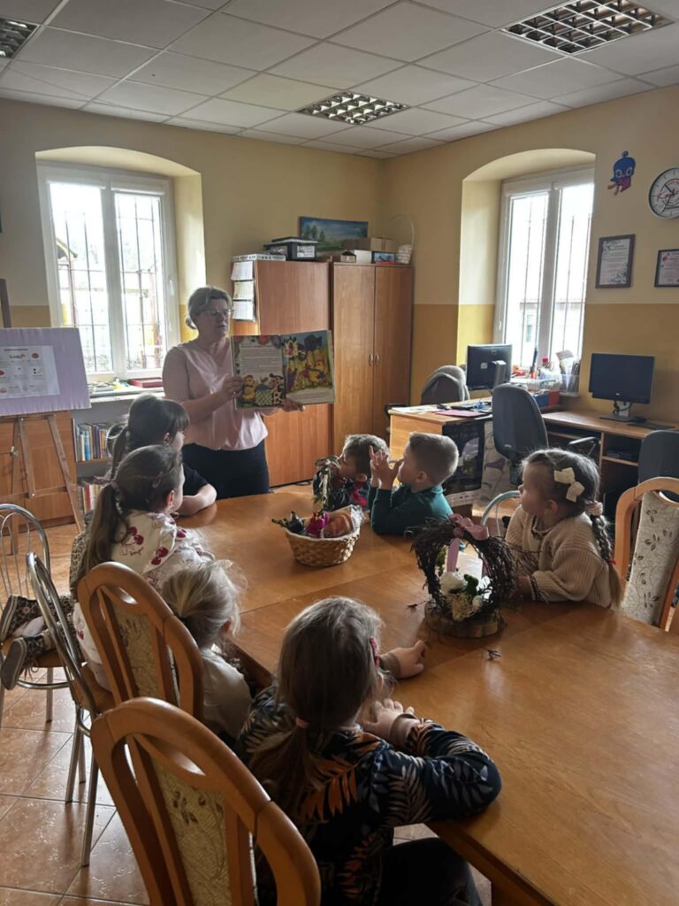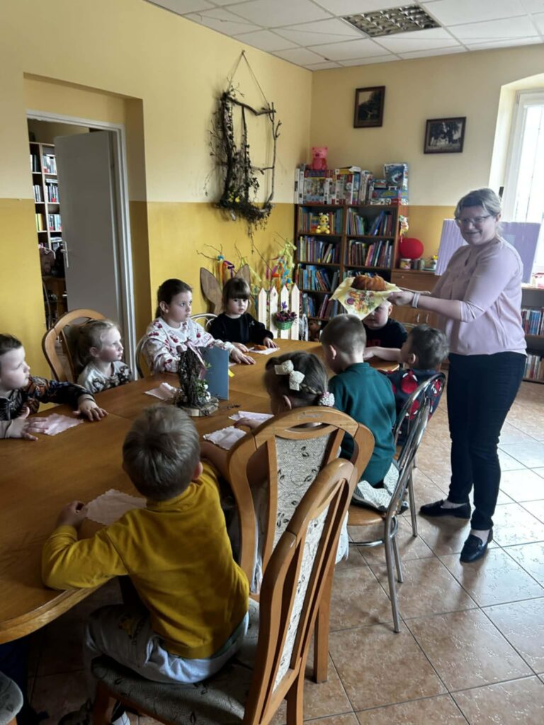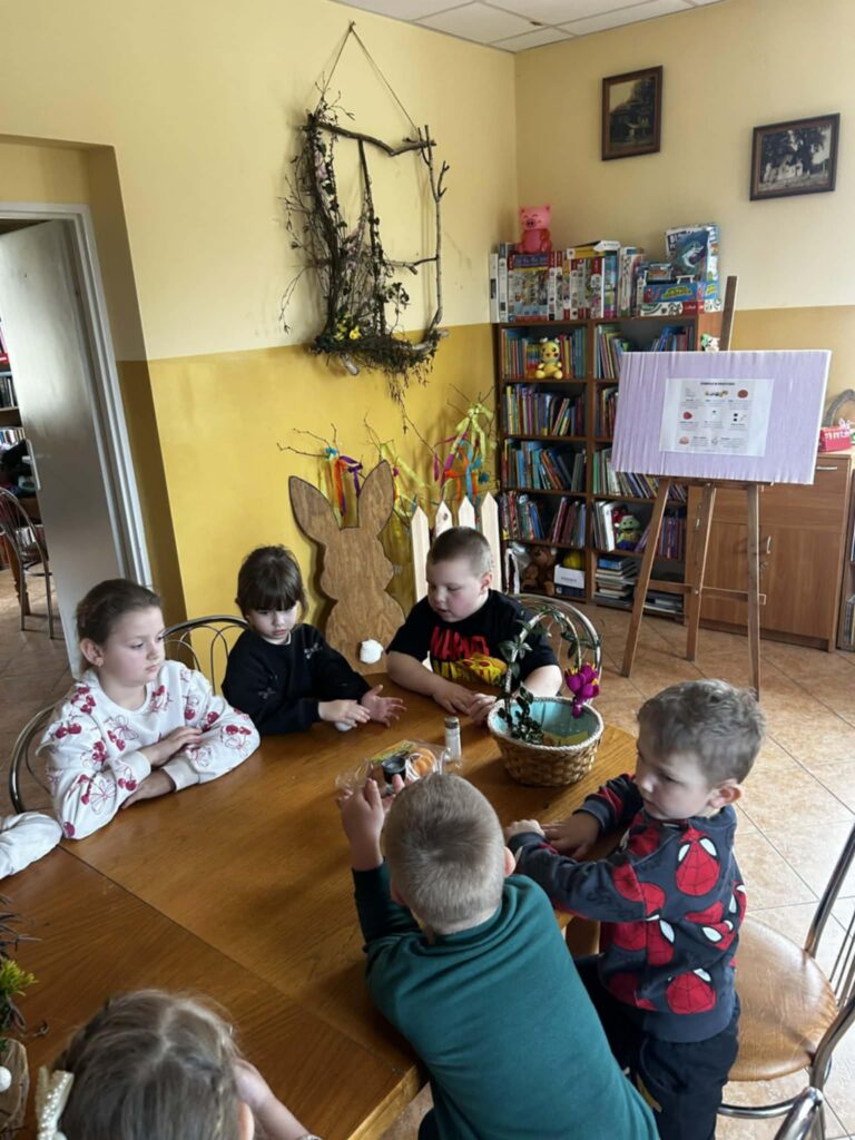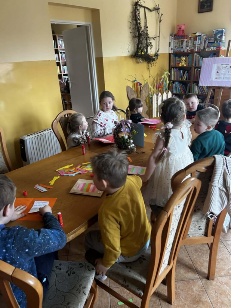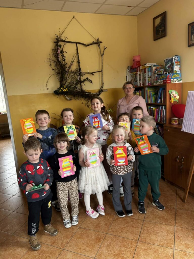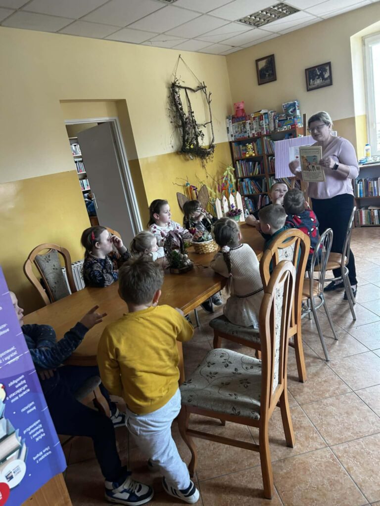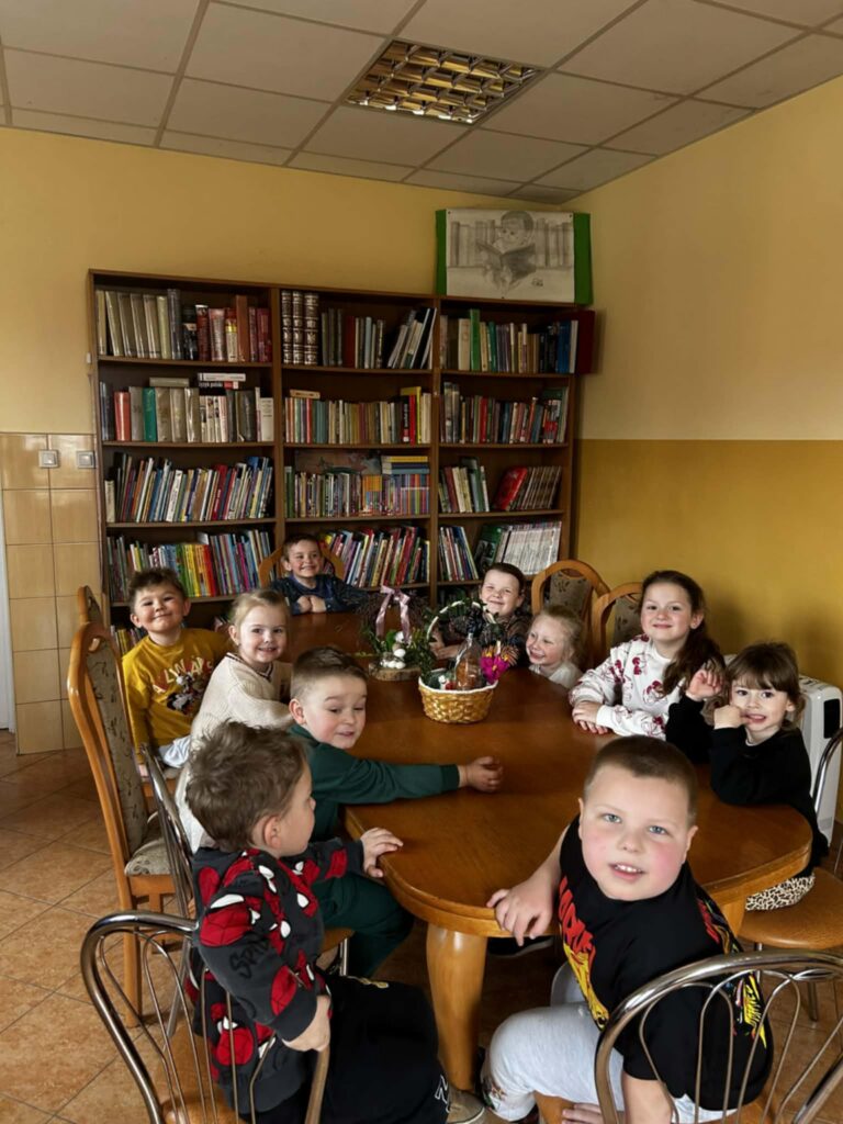 W środowe przedpołudnie filię biblioteczną odwiedziła grupa rozbrykanych przedszkolaków, by wspólnie odkryć tajemnice wielkanocnych tradycji. Głównym bohaterem spotkania był ciekawski kurczak z bajki Zofii Poletyło ” Kurczak i śmigus- dyngus”,który nie mógł zrozumieć, dlaczego w drugie święto wszyscy biegają z wodą. Dzieci z radością tłumaczyły, że to „Lany Poniedziałek”, a oblewanie się wodą to dawny zwyczaj, który ma przynosić zdrowie, pomyślność i budzić przyrodę do życia po zimie. Po dawce wiedzy przyszedł czas na działanie. Blat bibliotecznego stołu zniknął pod warstwą kolorowych skarbów, zamieniając czytelnię w tętniącą życiem manufakturę wielkanocnych cudów. Gotowe kartki, pełne kolorów i wiosennej energii, przedszkolaki zabrały ze sobą, by wręczyć je swoim najbliższym.