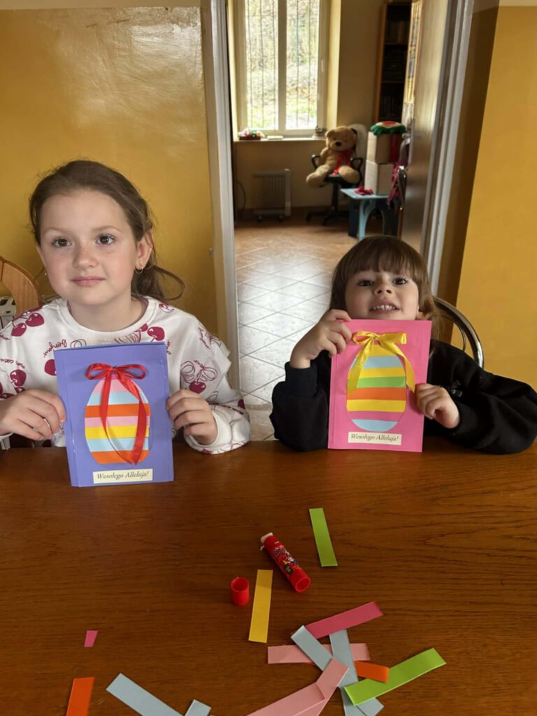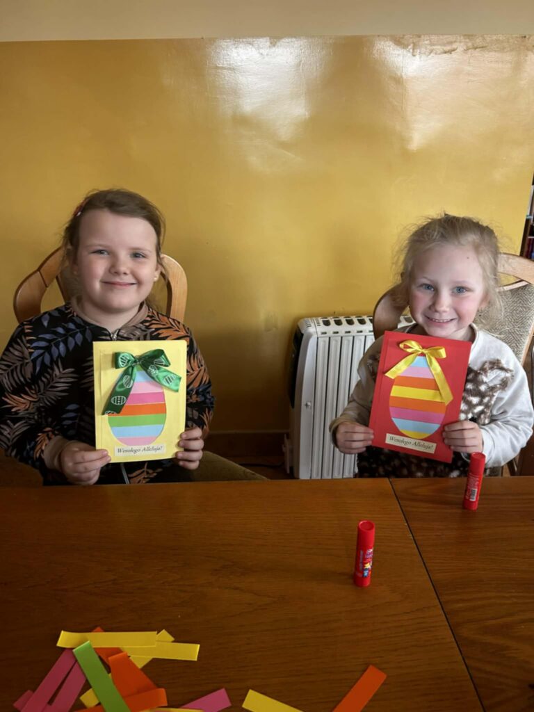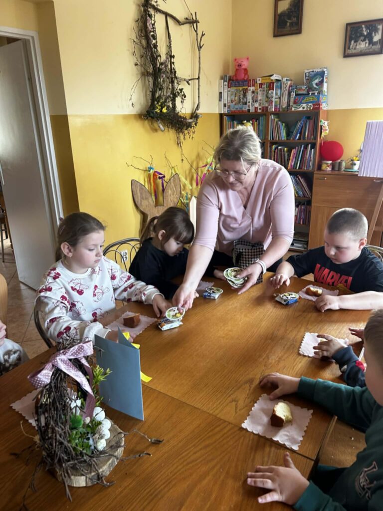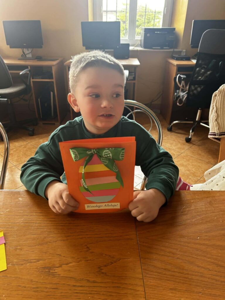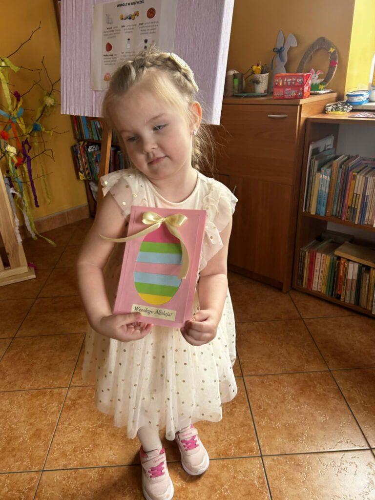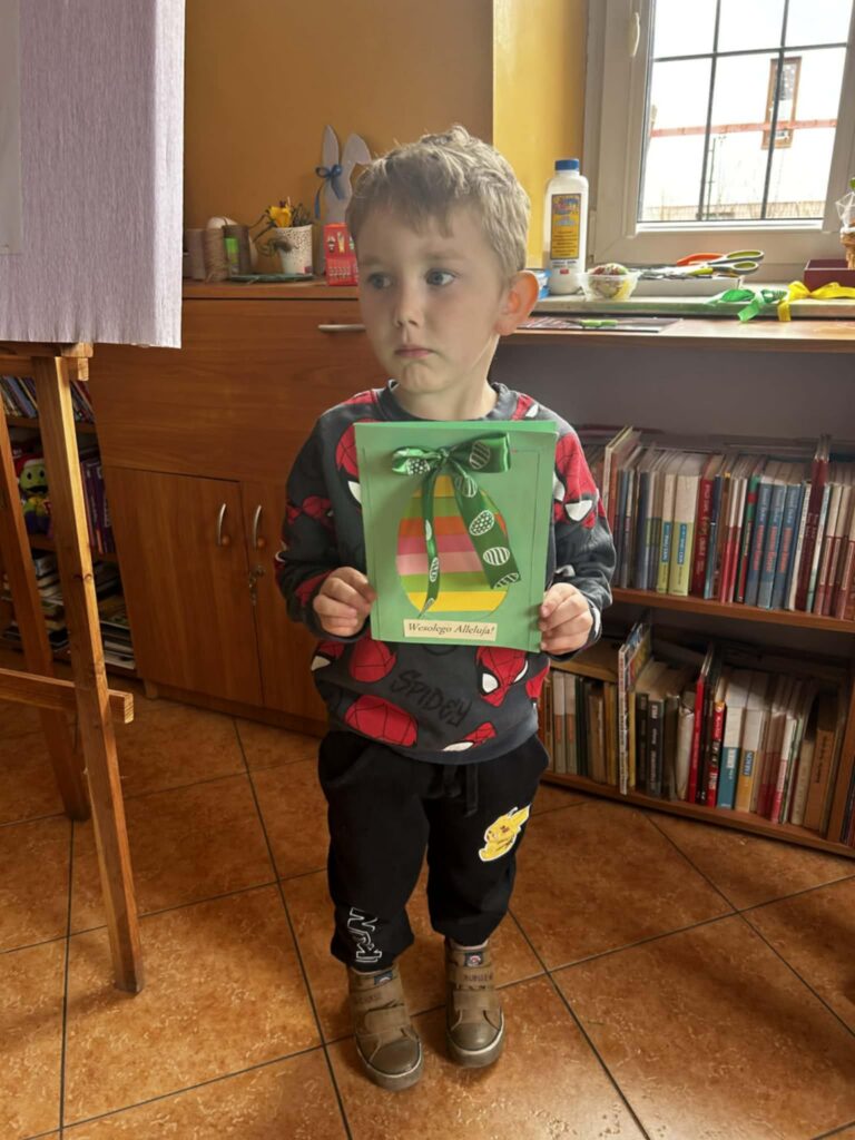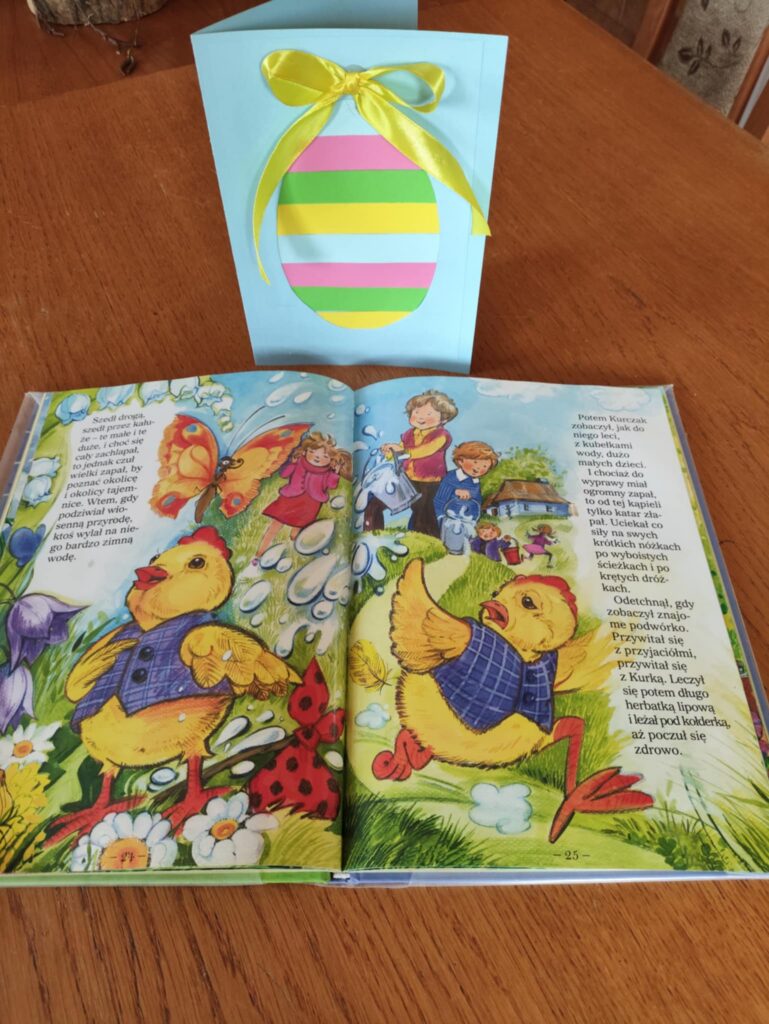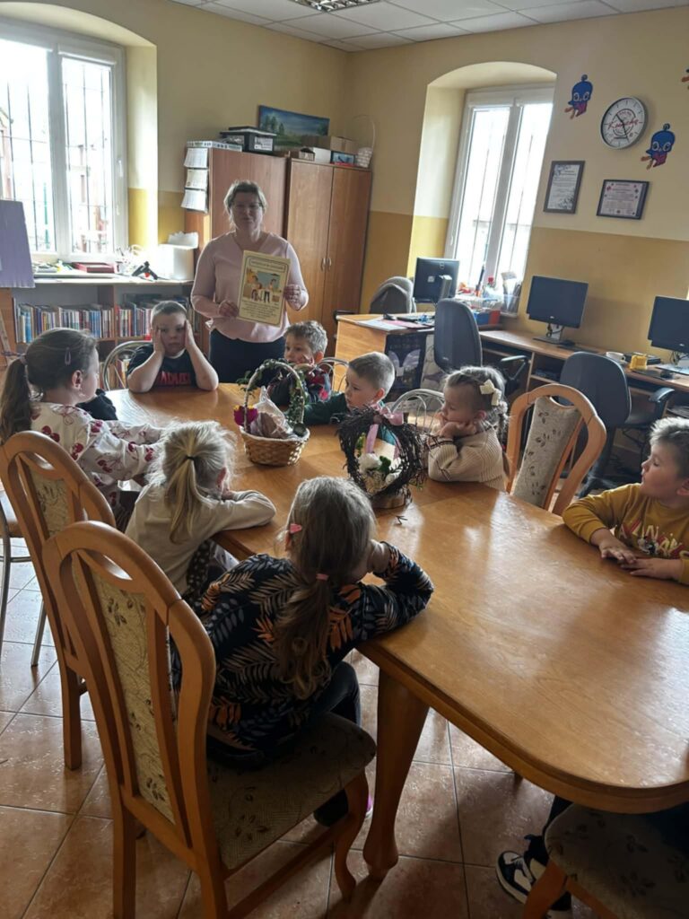 W środowe przedpołudnie filię biblioteczną odwiedziła grupa rozbrykanych przedszkolaków, by wspólnie odkryć tajemnice wielkanocnych tradycji. Głównym bohaterem spotkania był ciekawski kurczak z bajki Zofii Poletyło ” Kurczak i śmigus- dyngus”,który nie mógł zrozumieć, dlaczego w drugie święto wszyscy biegają z wodą. Dzieci z radością tłumaczyły, że to „Lany Poniedziałek”, a oblewanie się wodą to dawny zwyczaj, który ma przynosić zdrowie, pomyślność i budzić przyrodę do życia po zimie. Po dawce wiedzy przyszedł czas na działanie. Blat bibliotecznego stołu zniknął pod warstwą kolorowych skarbów, zamieniając czytelnię w tętniącą życiem manufakturę wielkanocnych cudów. Gotowe kartki, pełne kolorów i wiosennej energii, przedszkolaki zabrały ze sobą, by wręczyć je swoim najbliższym.