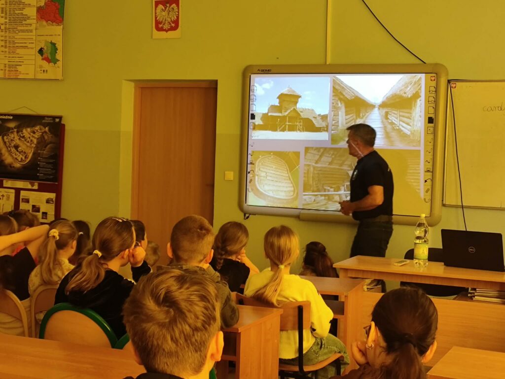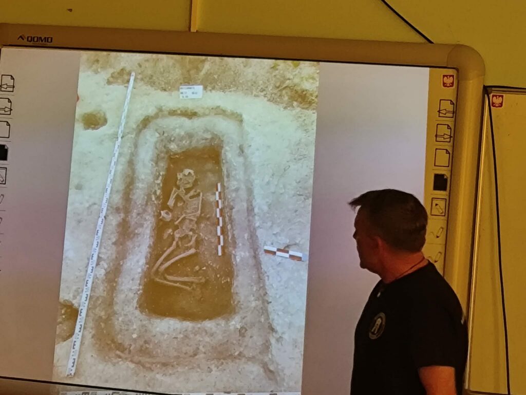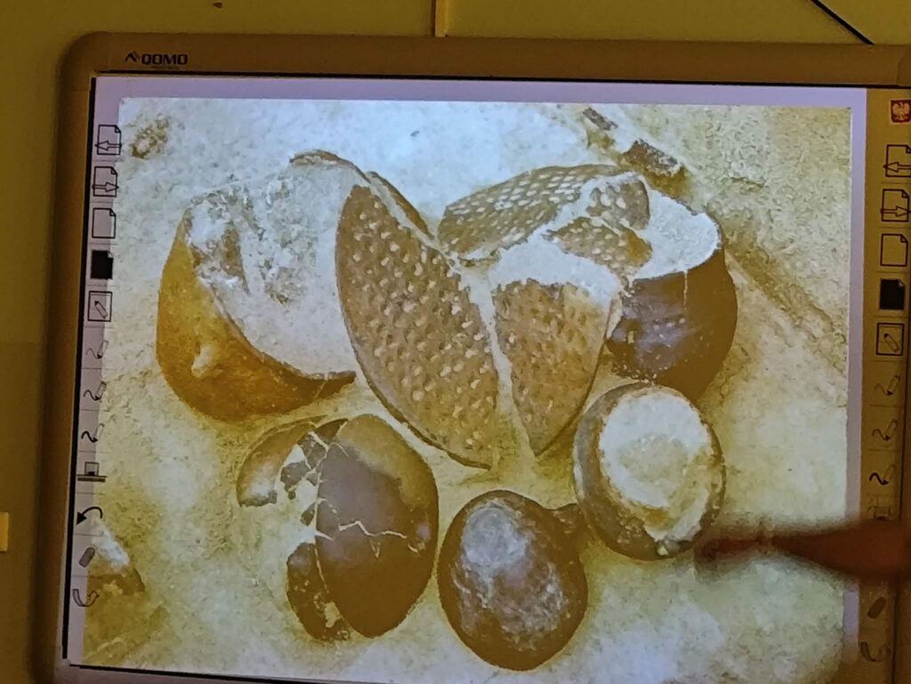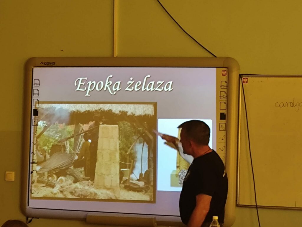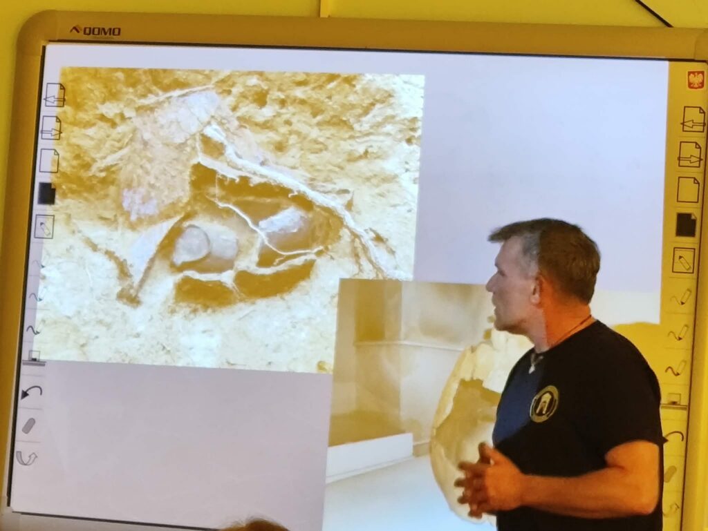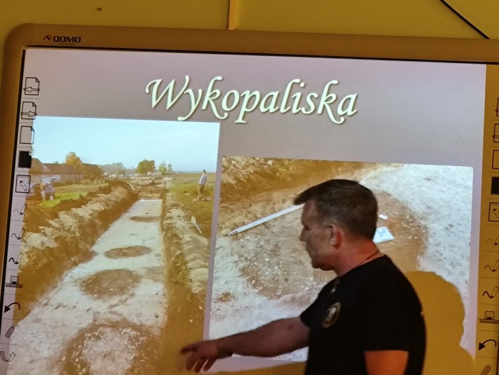 Prezentacja multimedialna była ważnym uzupełnieniem jego opowieści. Dzięki licznym zdjęciom mogliśmy zobaczyć prawdziwe wykopaliska, etapy pracy oraz odnalezione przedmioty. Fotografie pokazywały zarówno momenty odkryć, jak i proces ich dokumentowania oraz zabezpieczania. To sprawiło, że łatwiej było nam wyobrazić sobie, jak wygląda taka praca w praktyce.