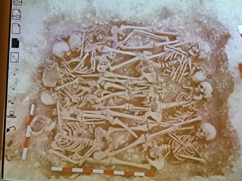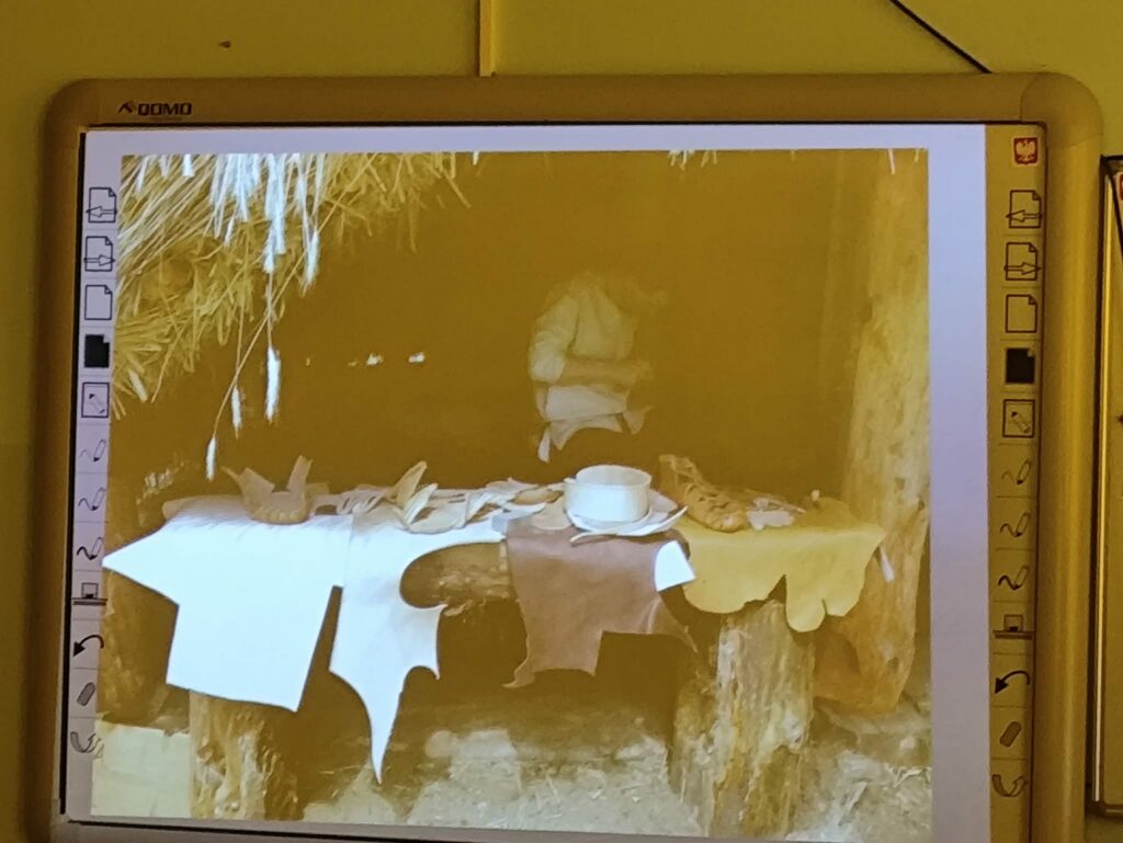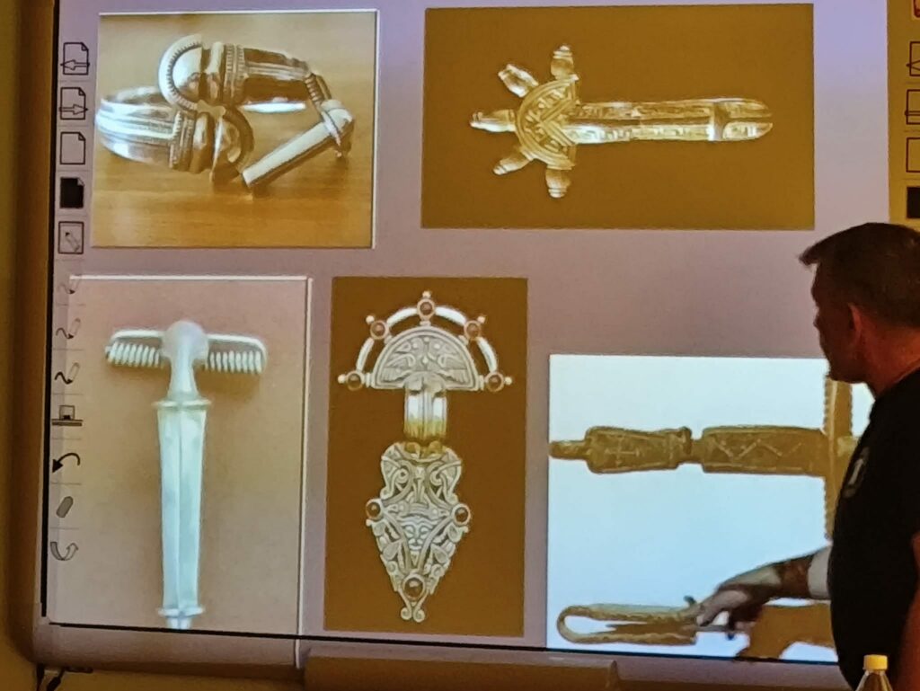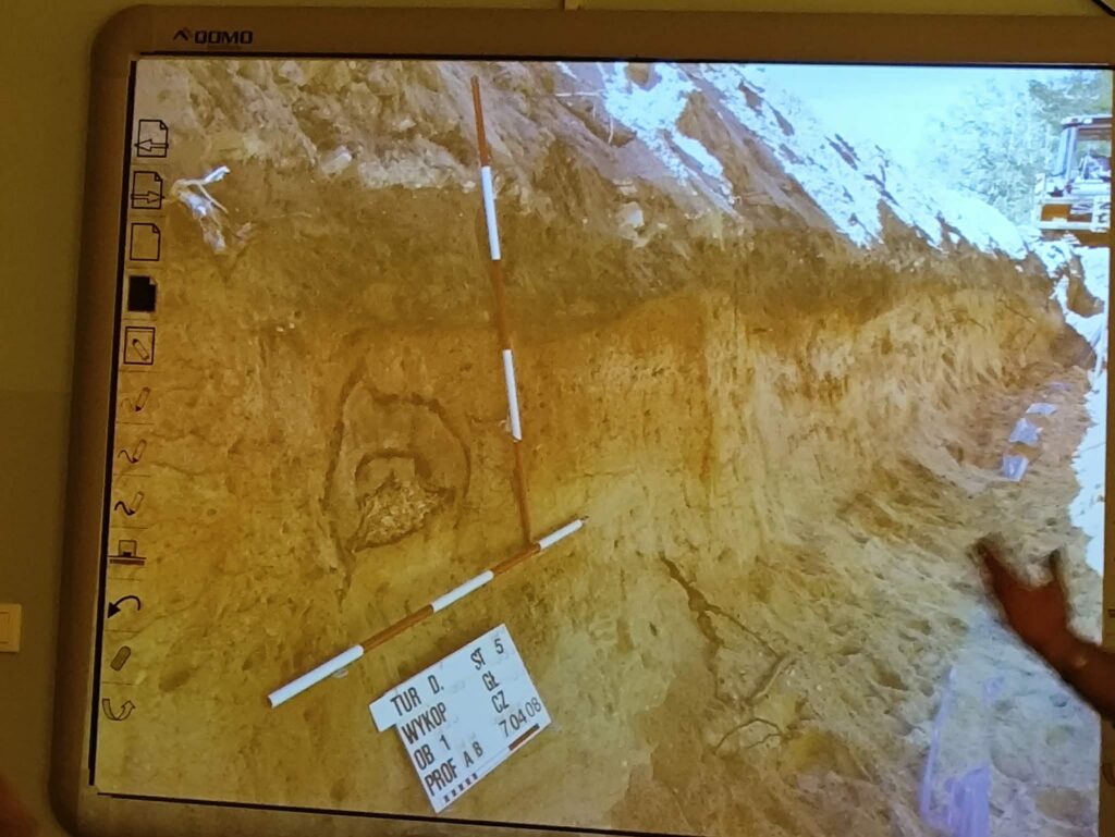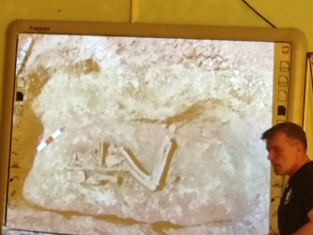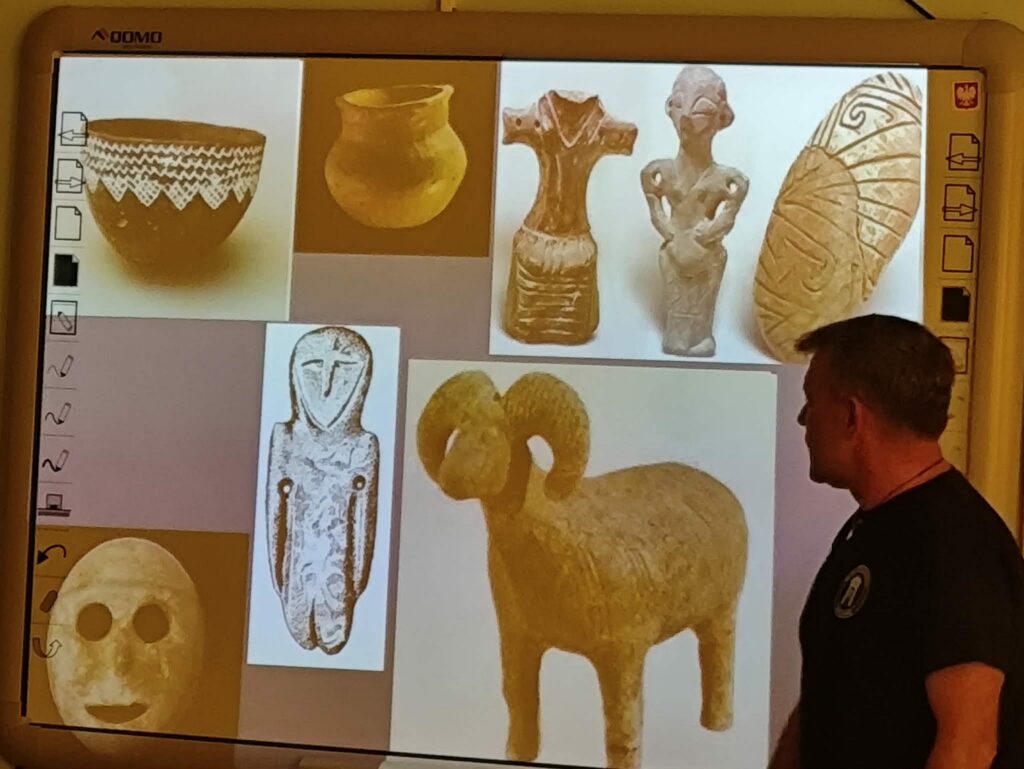Prezentacja multimedialna była ważnym uzupełnieniem jego opowieści. Dzięki licznym zdjęciom mogliśmy zobaczyć prawdziwe wykopaliska, etapy pracy oraz odnalezione przedmioty. Fotografie pokazywały zarówno momenty odkryć, jak i proces ich dokumentowania oraz zabezpieczania. To sprawiło, że łatwiej było nam wyobrazić sobie, jak wygląda taka praca w praktyce.