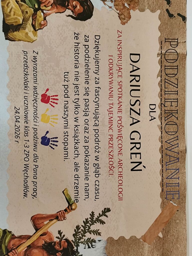 Za nami kolejne spotkanie z Dariuszem Greniem – archeologiem, który odwiedził ZPO w Węchadłowie. Dzisiejsze spotkanie miało formę wykładu połączonego z prezentacją multimedialną, co pozwoliło nam jeszcze lepiej zrozumieć specyfikę jego pracy.