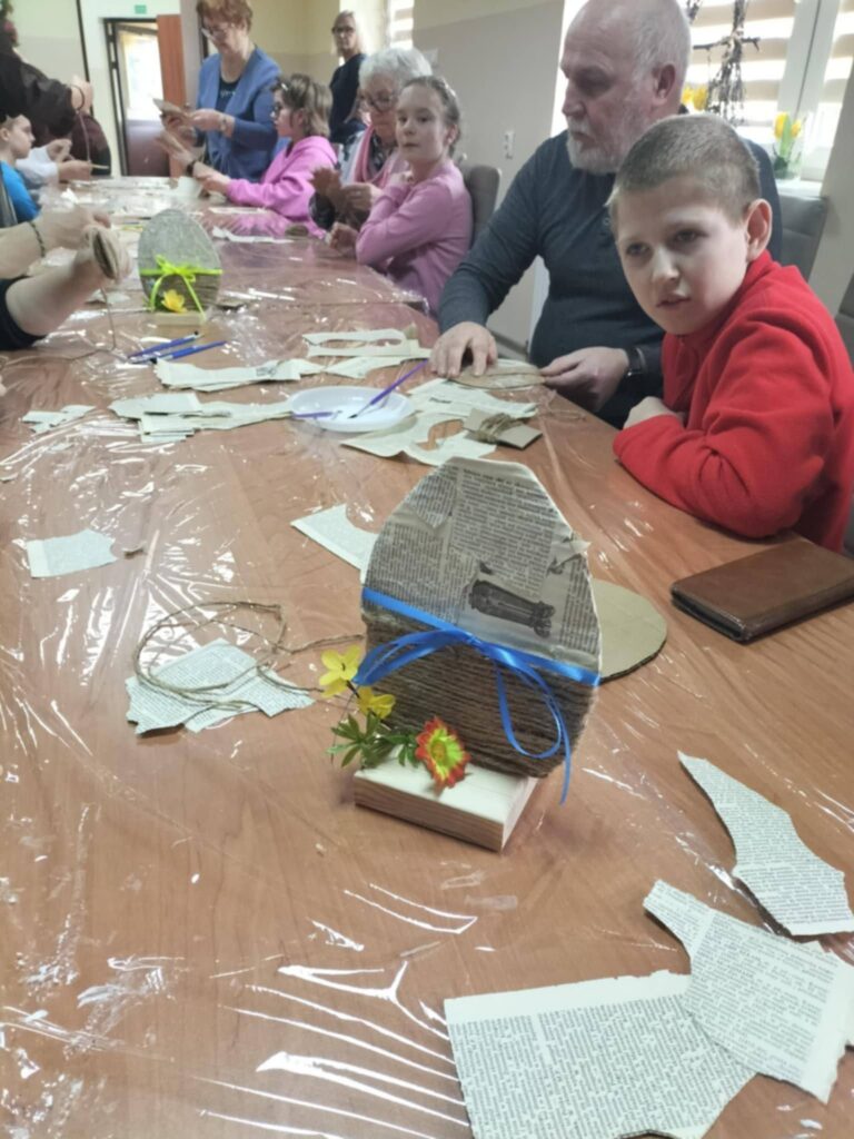 Podczas zajęć uczestnicy wykonywali wielkanocne jajka metodą decoupage. Do ich ozdabiania wykorzystano sznurek oraz kartki, co pozwoliło stworzyć oryginalne i pełne uroku dekoracje.