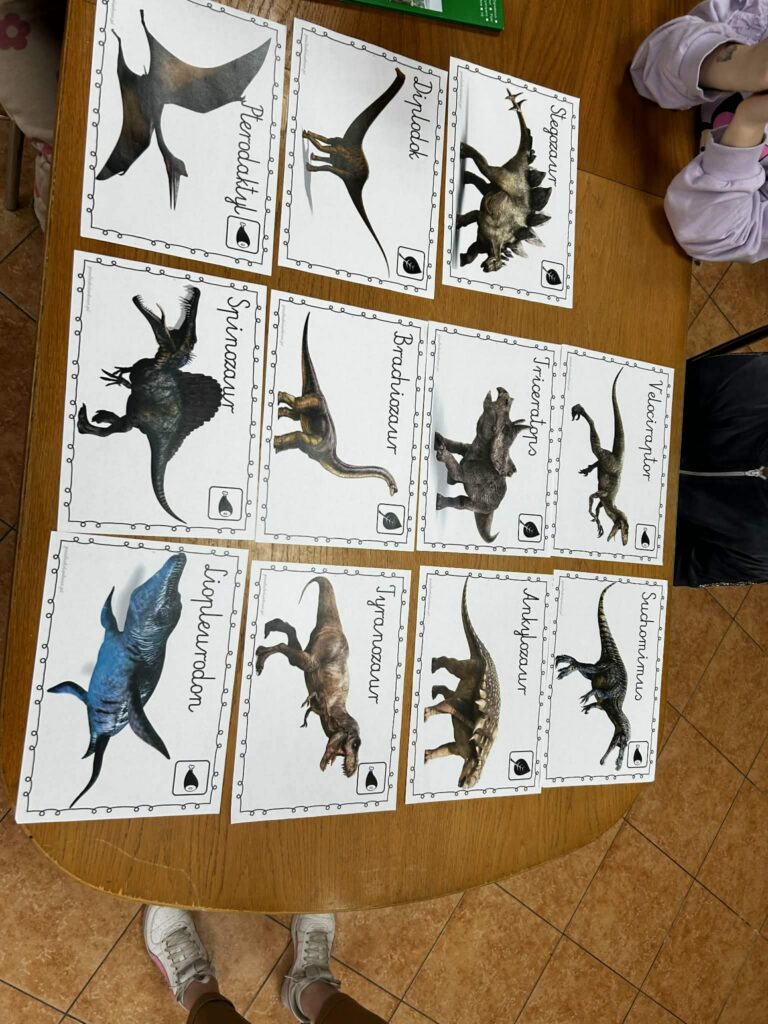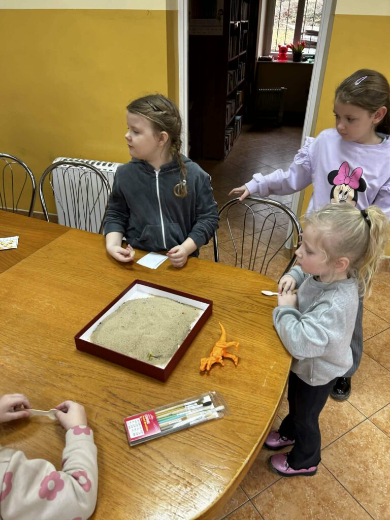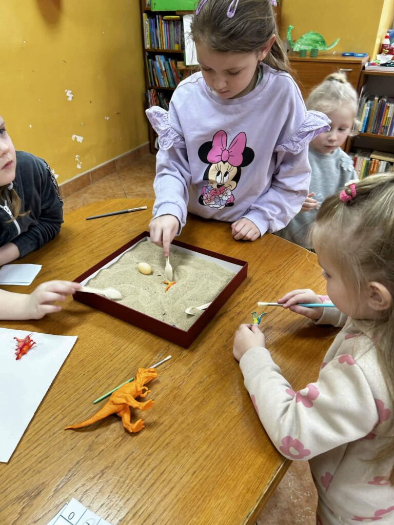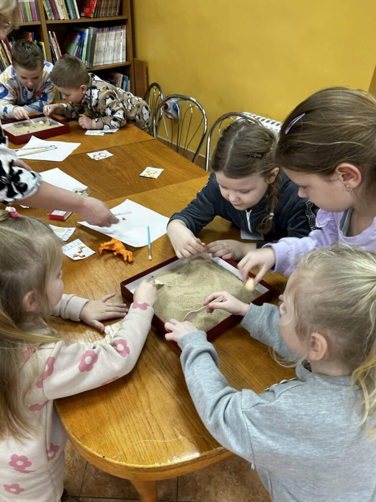 Wspólne oglądanie barwnie ilustrowanych książek pozwoliło przenieść się w czasy sprzed milionów lat i poznać świat, którego już nie ma. Dużym zainteresowaniem cieszyła się zabawa w małych paleontologów – dzieci odszukiwały w piasku ukryte „skamieliny” i figurki dinozaurów.