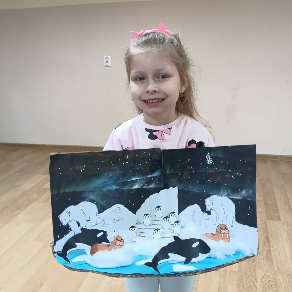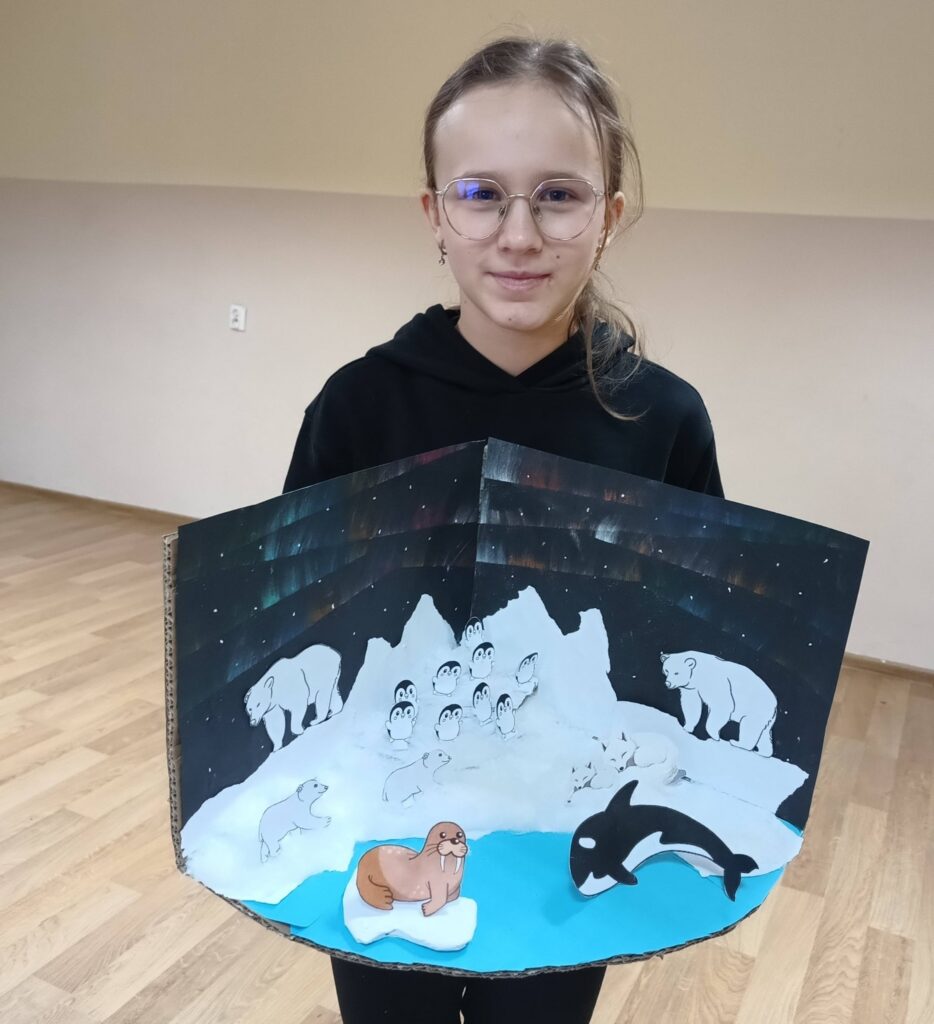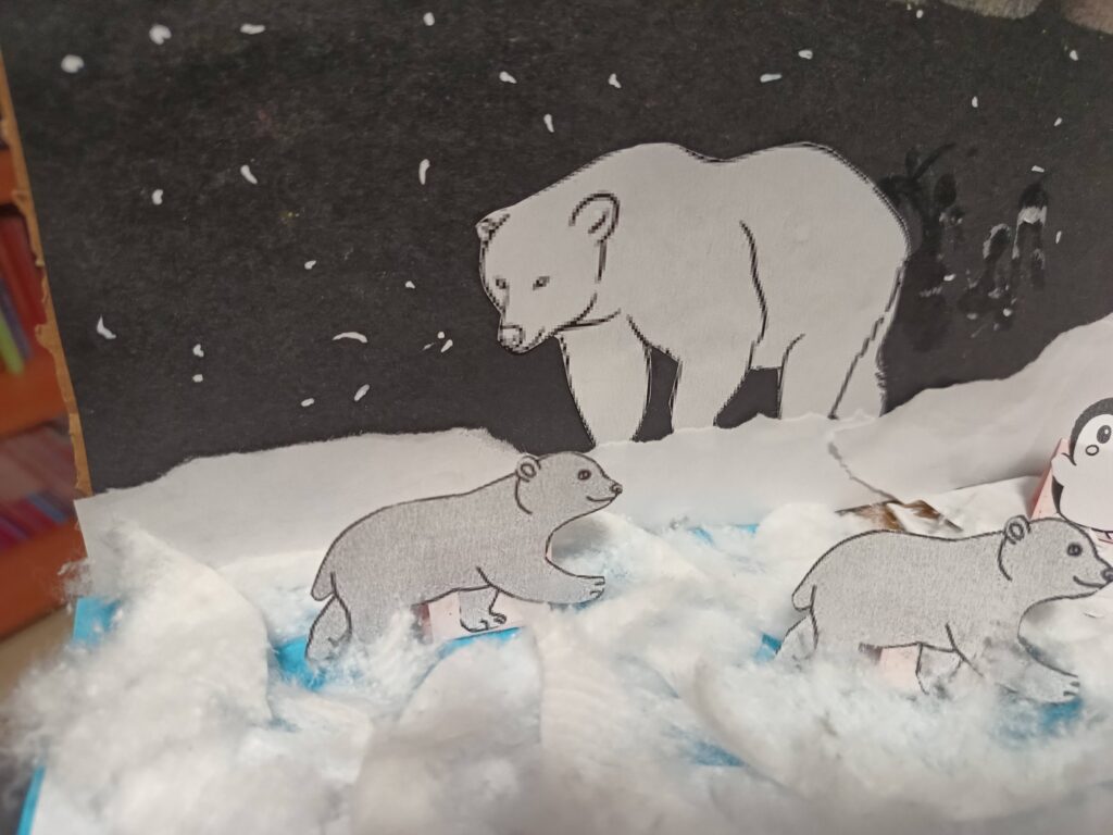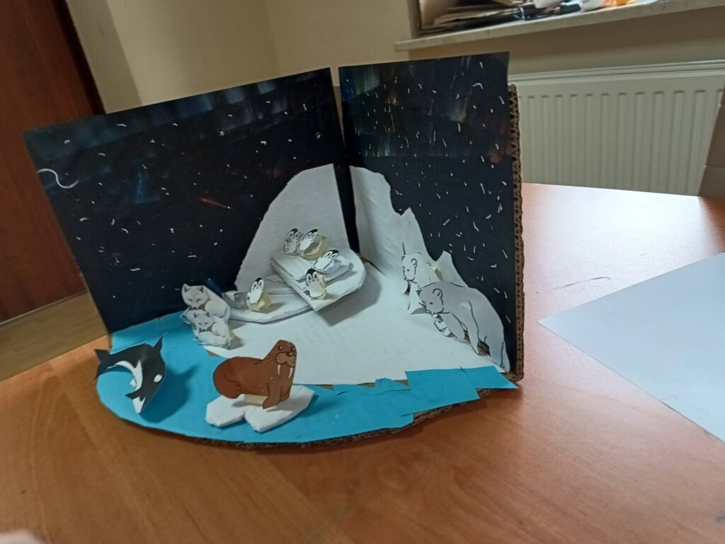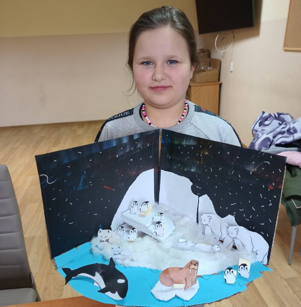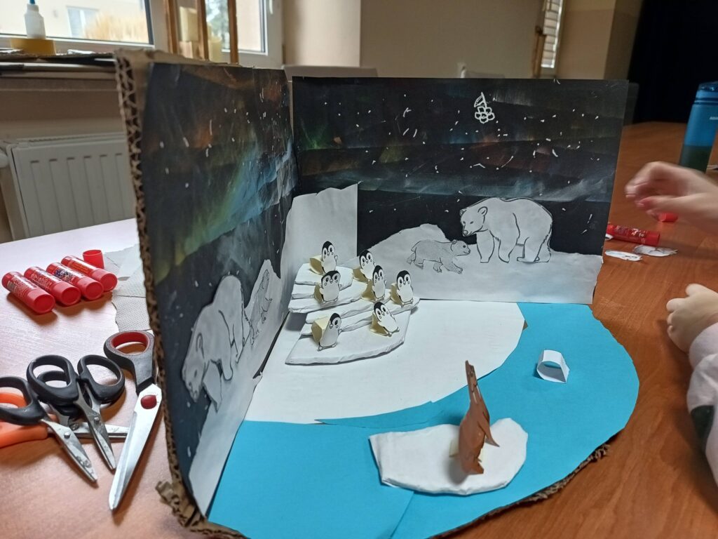 W bibliotece odbyły się zajęcia plastyczno-edukacyjne dla dzieci. Uczestnicy poznali zwierzęta żyjące w Arktyce i Antarktydzie, takie jak niedźwiedzie polarne, pingwiny, lisy polarne, morsy i orki. Tworzyli makietę krainy w której żyją te zwierzęta, krainę śniegu i zorzy polarnej.