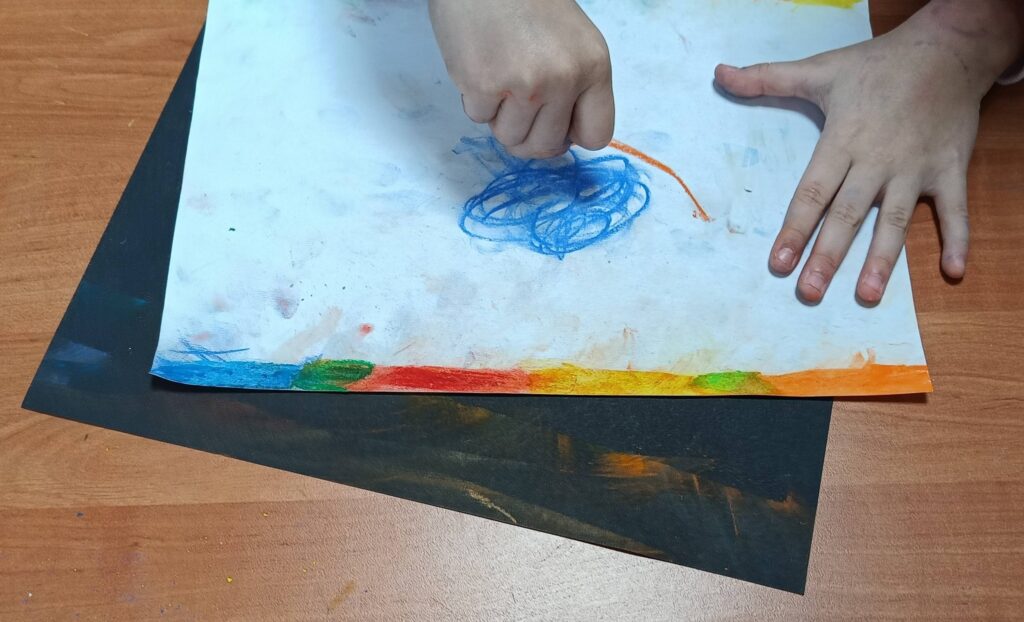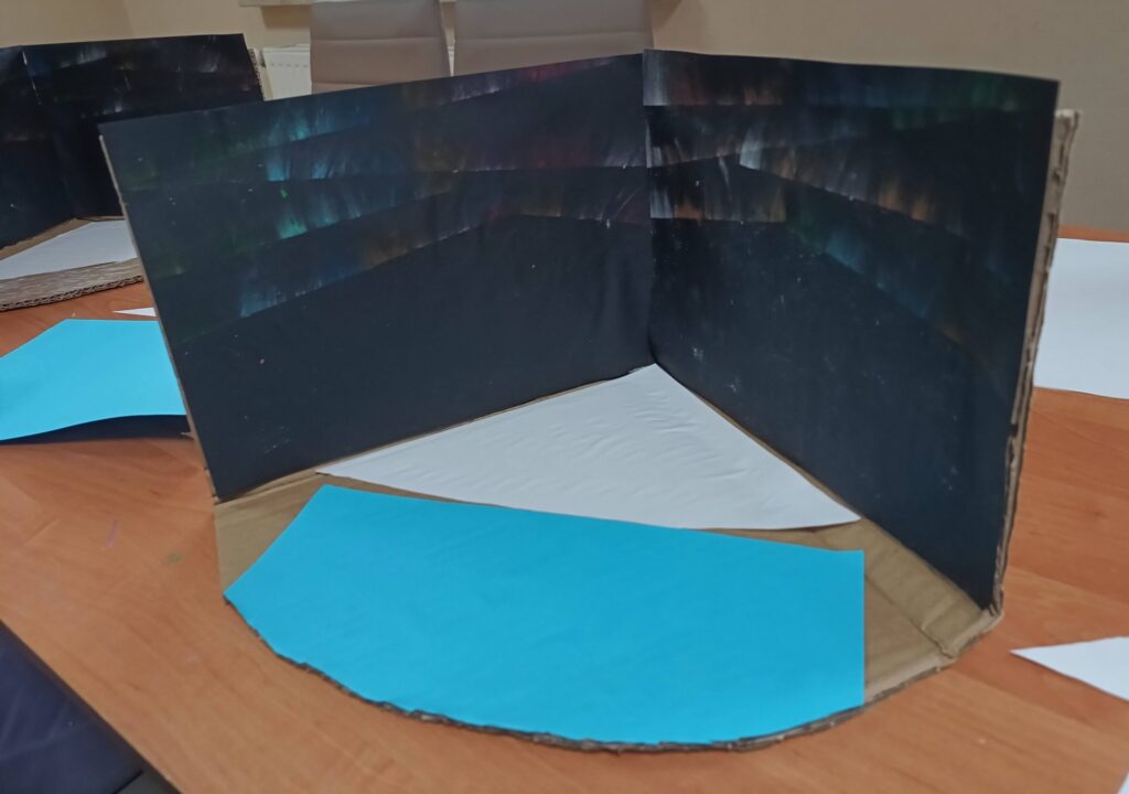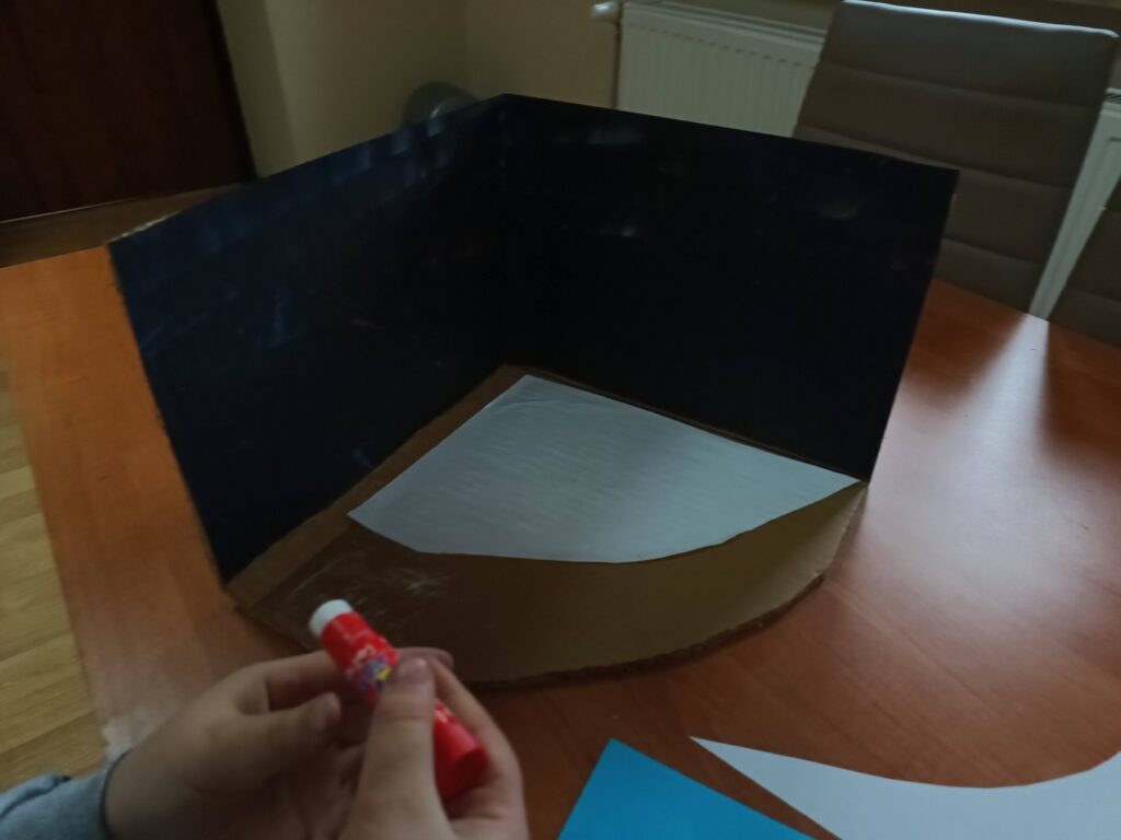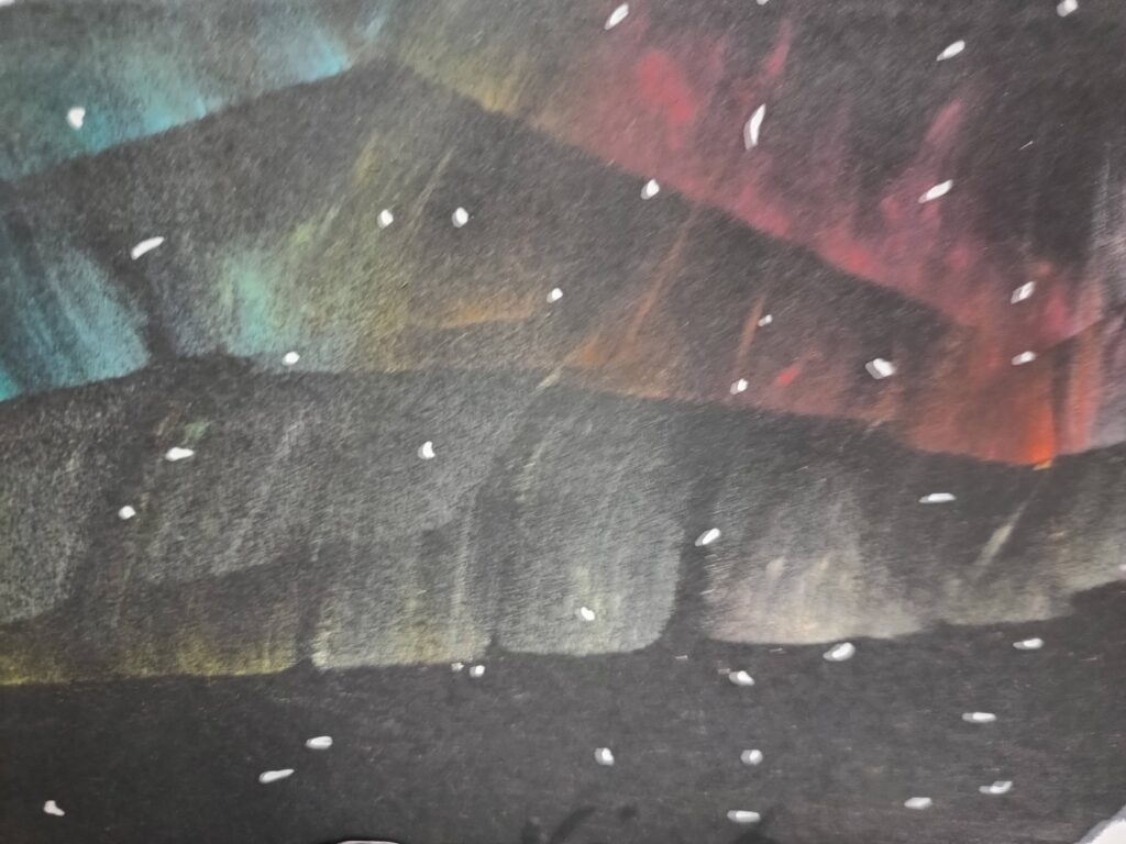 Dzieci stworzyły trójwymiarowy widoczek, malowały zorzę, wyklejały śnieg z waty i przyklejały papierowe figurki zwierząt. Gotowe prace stały się czarno-białymi makietami oraz efektem twórczej pracy, każdego z uczestników.
