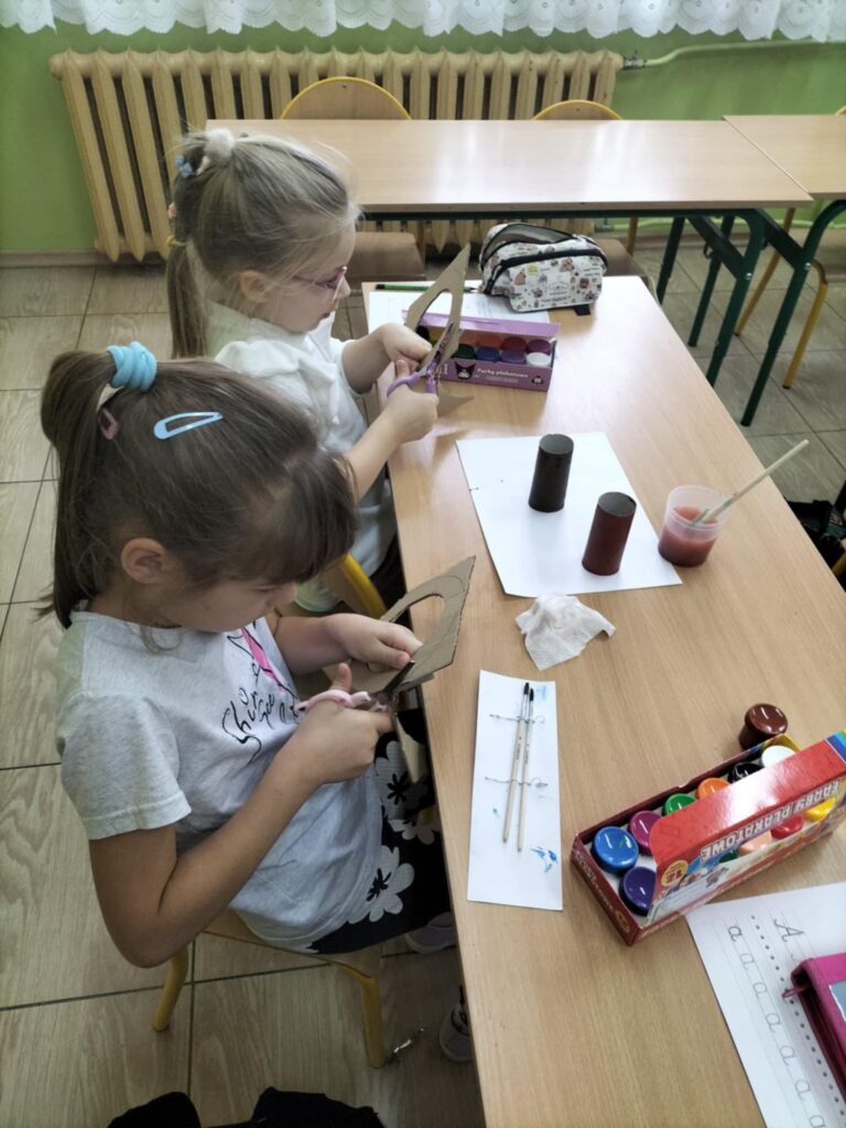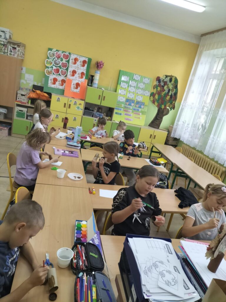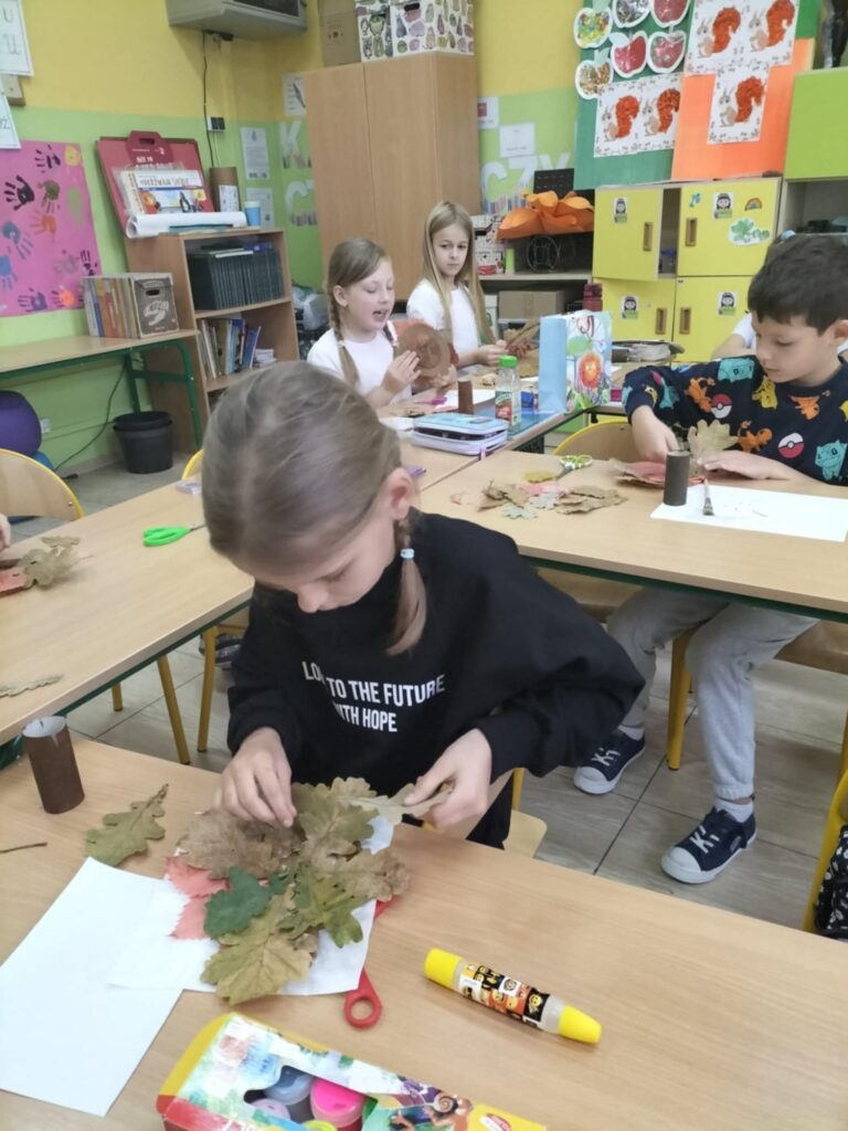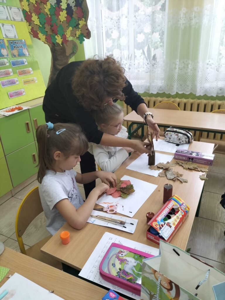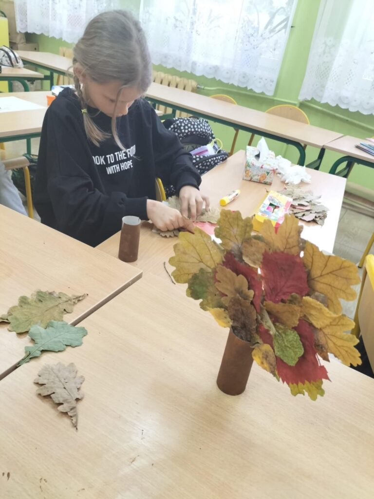 Pień drzewa dzieci wykonały z rolek po papierze toaletowym, które malowały farbami na brązowo. Koronę drzewa tworzyły z suchej, kolorowej jesiennej kolekcji liści – układały je i przyklejały do wyciętej tekturowej obręczy, wyklejonej taśmą klejąca, tworząc barwne kompozycje.