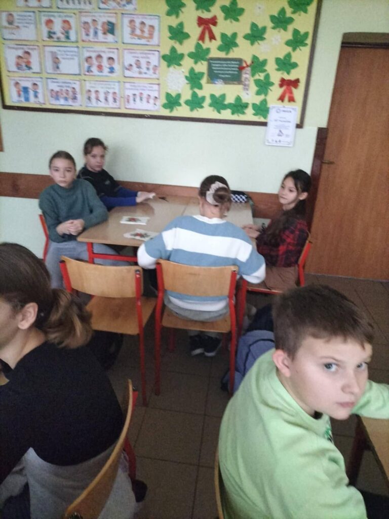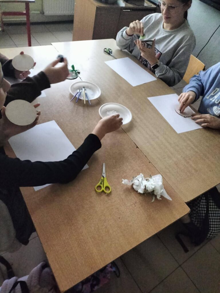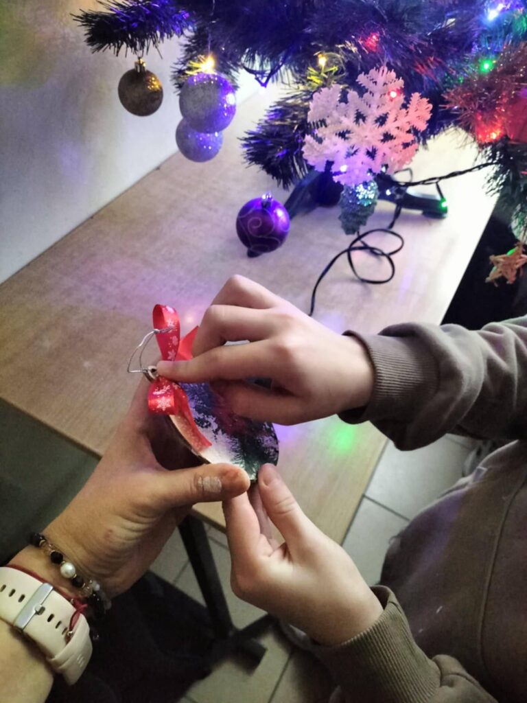 Na zakończenie każda bombka została wykończona dekoracyjną kokardką, którą uczniowie przyklejali klejem na gorąco, uzyskując elegancki, efektowny akcent. Spotkanie przebiegło w miłej atmosferze, pełnej kreatywności i przedświątecznego nastroju.