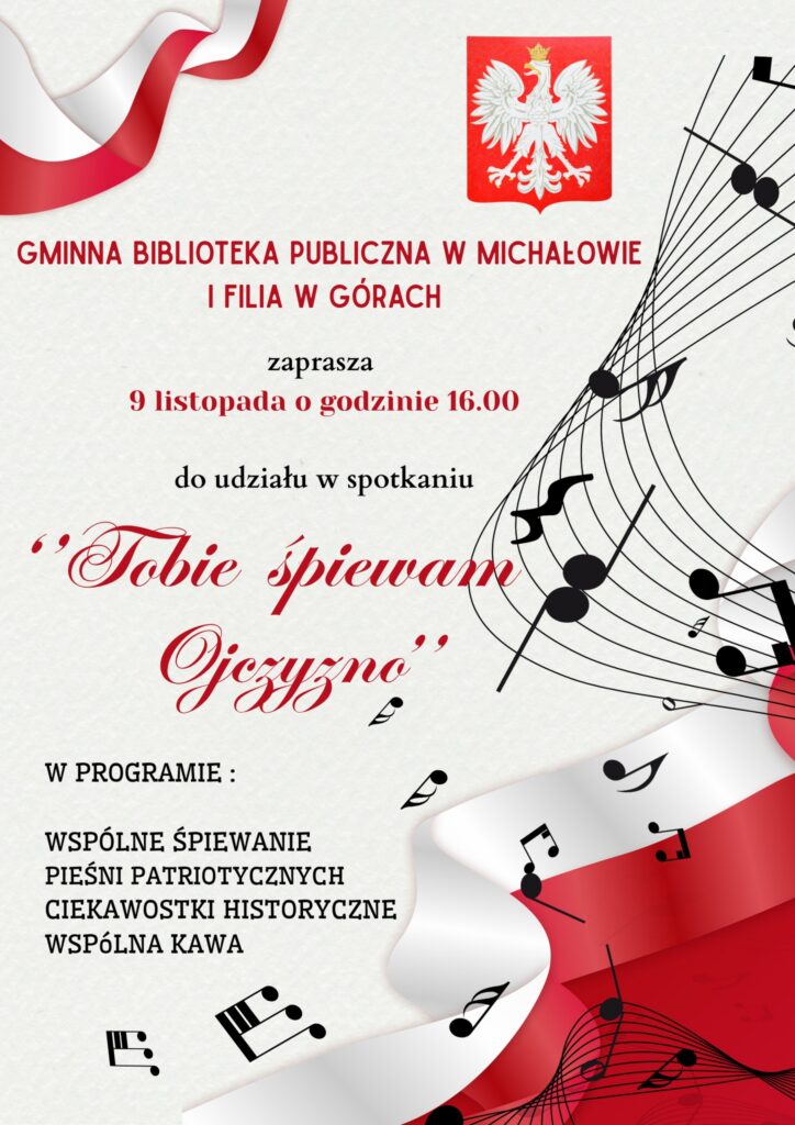 Gminna Biblioteka Publiczna w Michałowie i Filia w Górach zaprasza 9 listopada o godzinie 16.00 do udziału w spotkaniu ,,Tobie śpiewam Ojczyzno”