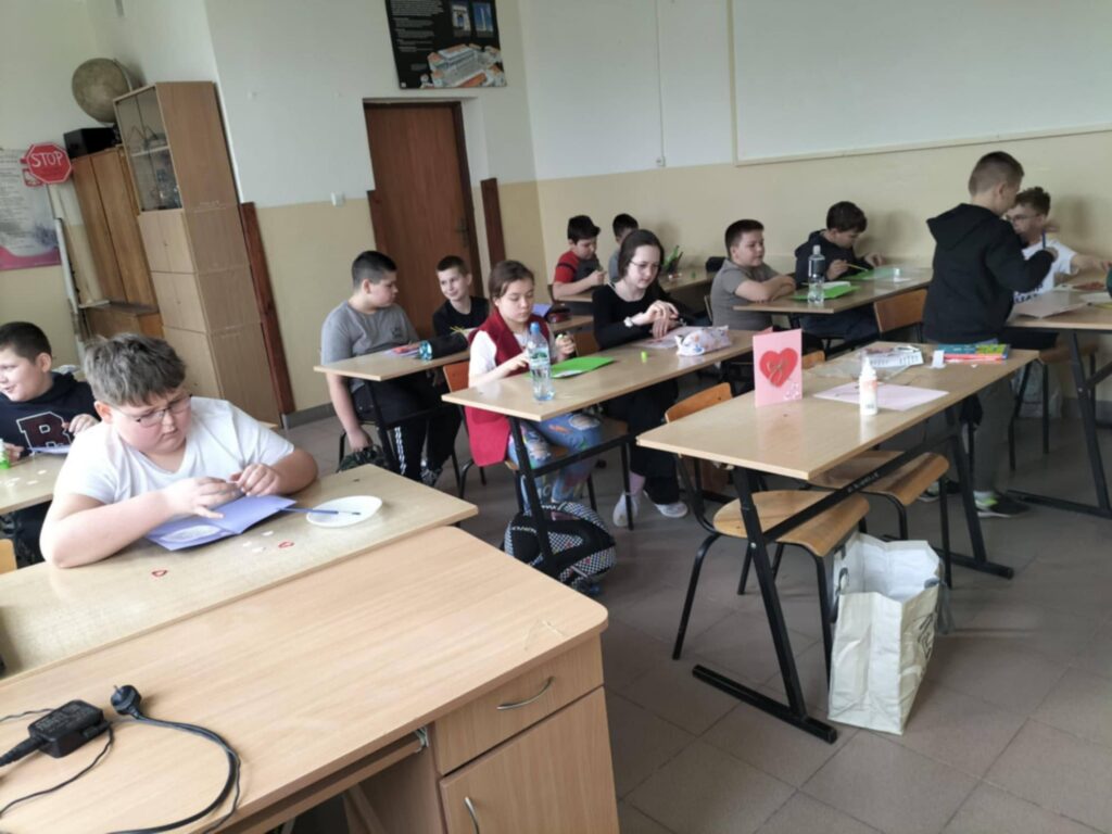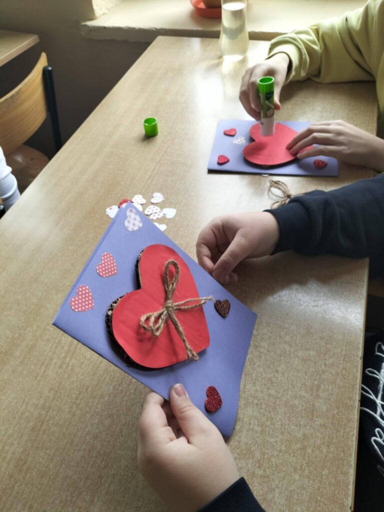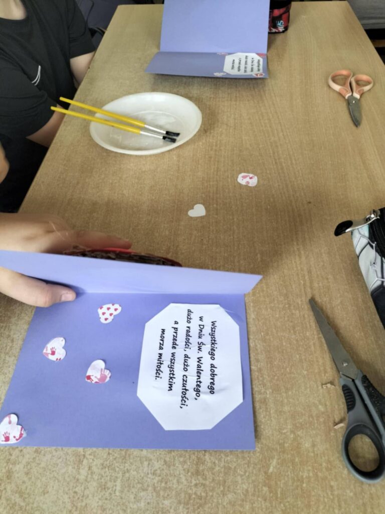 Podczas warsztatów panowała przyjazna atmosfera współpracy – uczniowie wymieniali się pomysłami, pomagali sobie nawzajem i z dumą prezentowali gotowe dzieła. Własnoręcznie wykonane walentynki stały się pięknym sposobem na okazanie sympatii kolegom, koleżankom oraz bliskim.