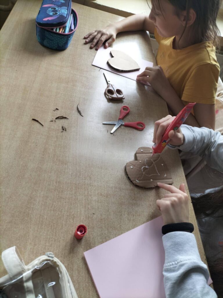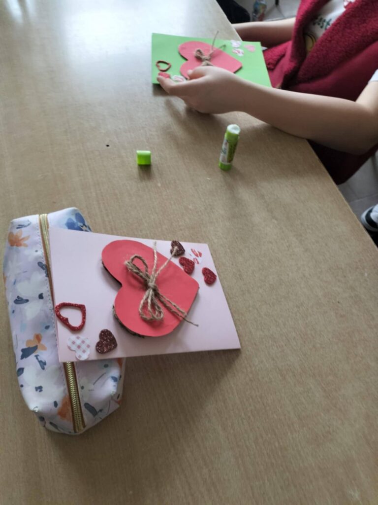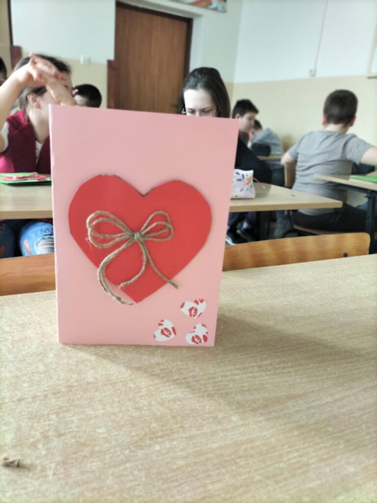 Dzieci korzystały z różnorodnych materiałów plastycznych – kolorowych kartek, tekturowych serc, sznurka jutowego oraz małych, dekoracyjnych serduszek. Z juty powstawały urocze kokardki, które dodawały kartkom rustykalnego i oryginalnego charakteru. Każda praca była wyjątkowa i odzwierciedlała indywidualny styl autora.