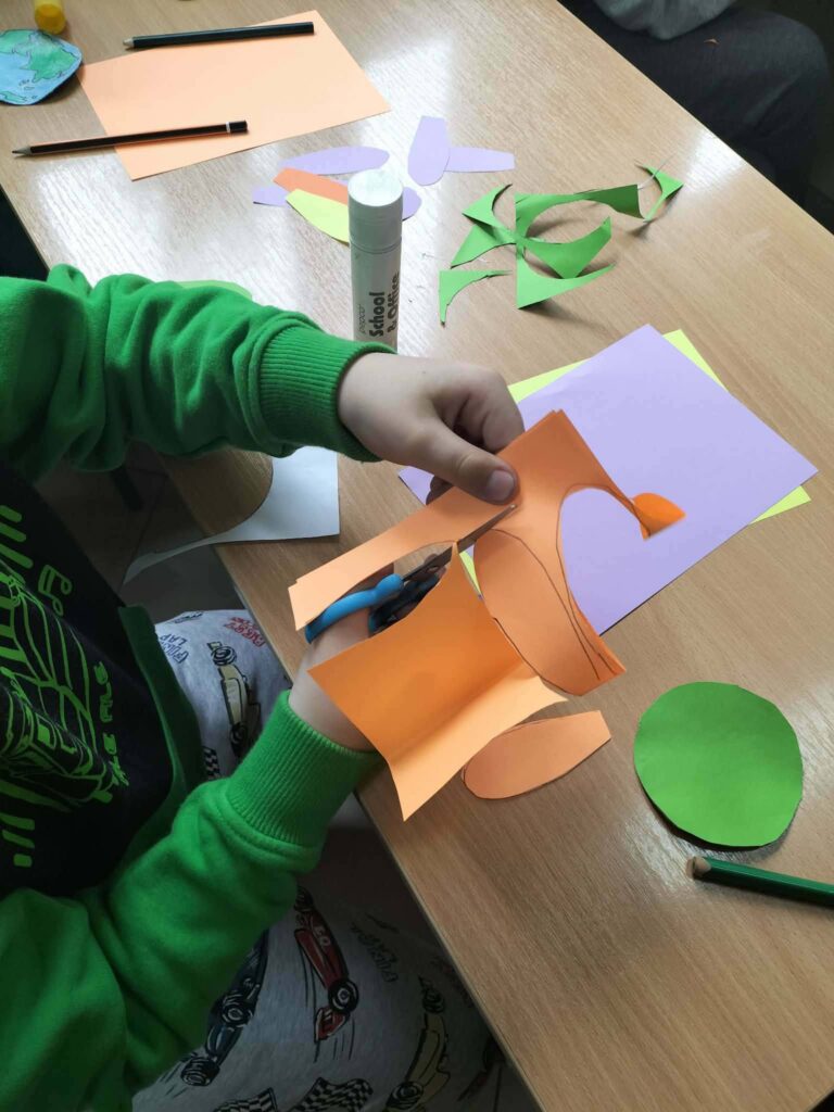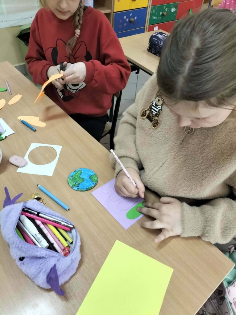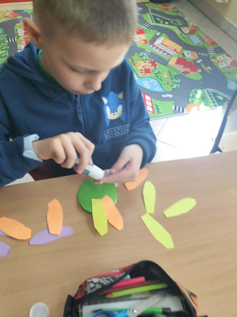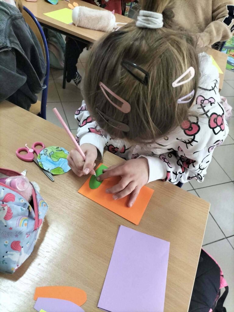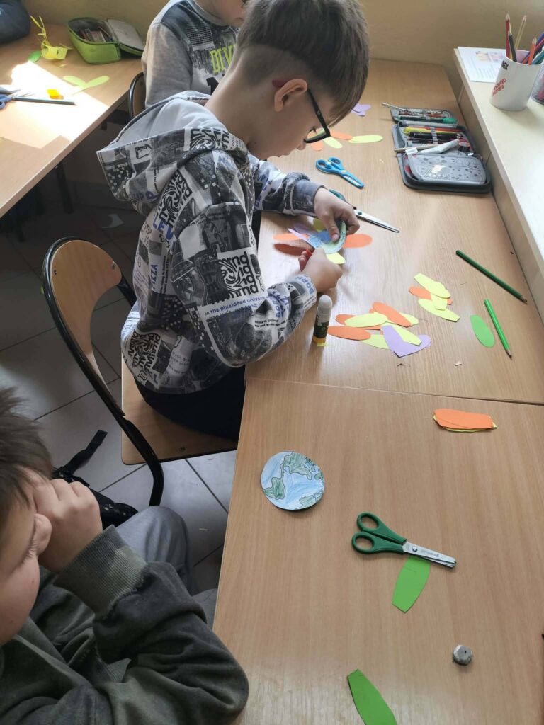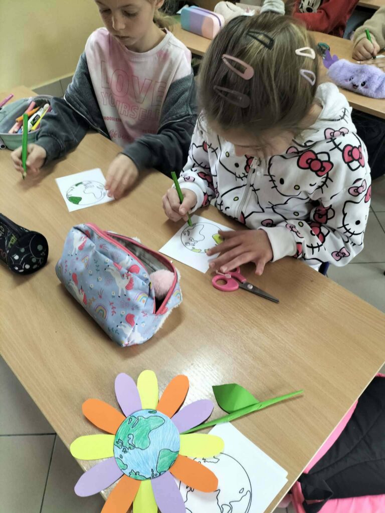 Część praktyczna zajęć polegała na wykonaniu pracy plastycznej przedstawiającej kwiat symbolizujący Ziemię. Uczniowie przygotowali kolorowe płatki z papieru, a w środku umieścili rysunek globu. Każdy kwiat był wyjątkowy i pełen barw, co podkreślało różnorodność i piękno naszej planety. Praca wymagała precyzji, współpracy i zaangażowania, a jednocześnie sprawiła dzieciom dużo radości.