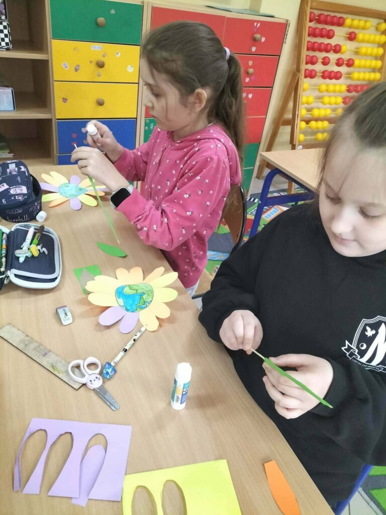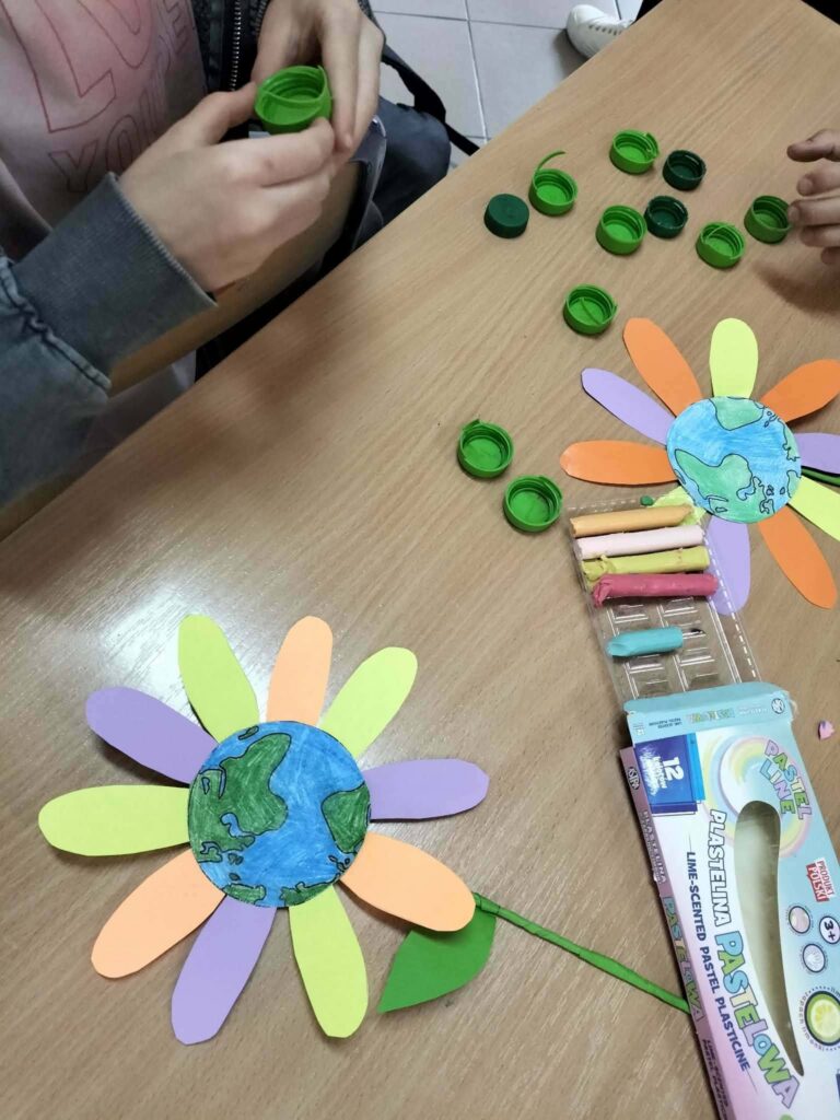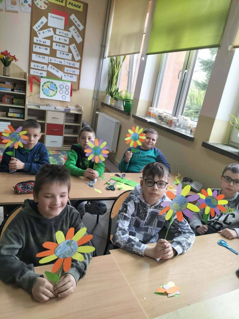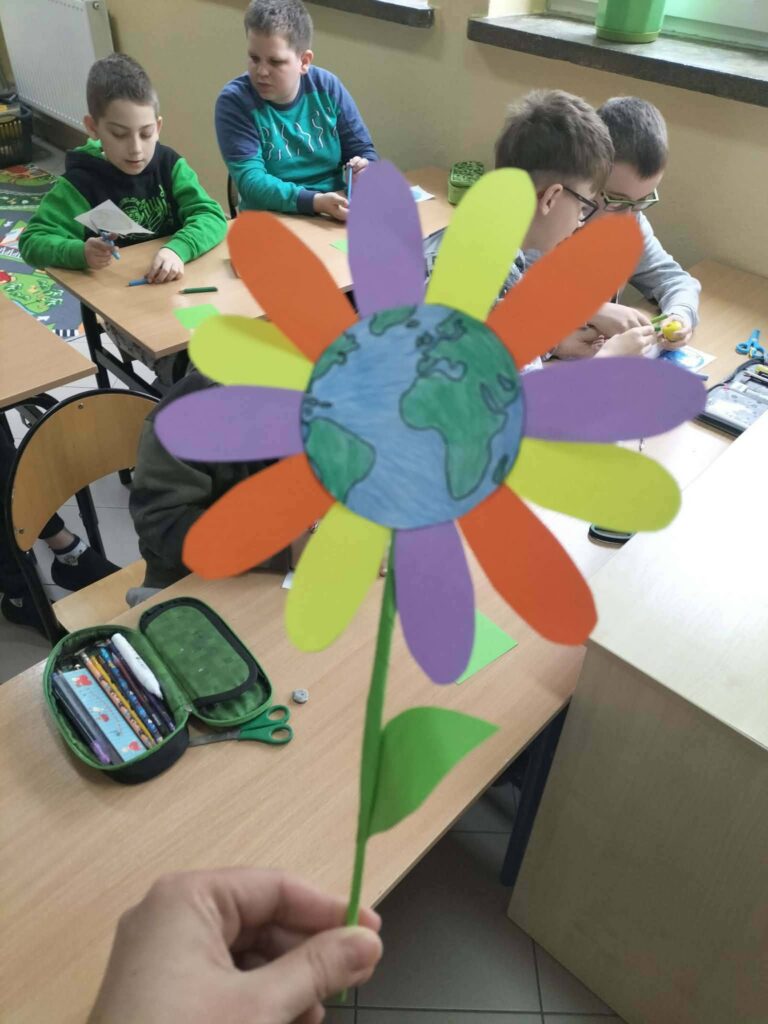 Zajęcia przebiegły w miłej i twórczej atmosferze. Uczniowie chętnie uczestniczyli w dyskusji oraz z dużym entuzjazmem wykonywali swoje prace. Gotowe kwiaty stały się nie tylko piękną dekoracją, ale również symbolem troski o Ziemię i przypomnieniem, że każdy z nas ma wpływ na jej przyszłość.